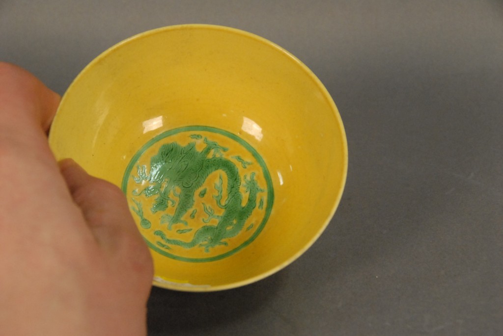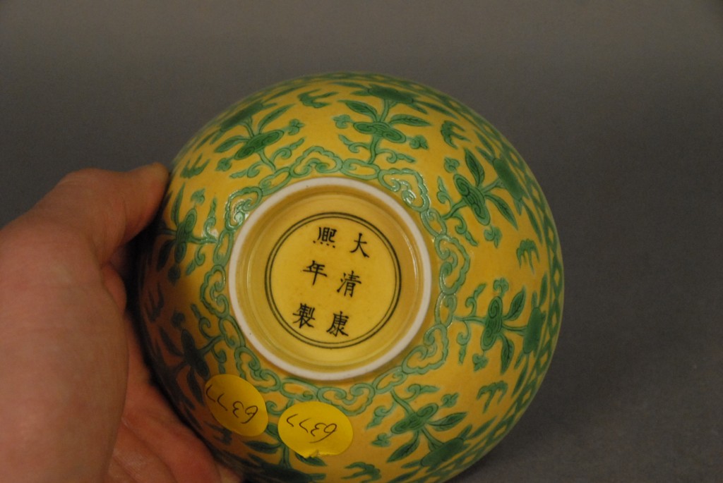 Lot 126: Qing Dynasty Kangxi period yellow porcelain bowl with Kangxi six character mark mark of period, ht. 2in. dia. 4 1/2in.