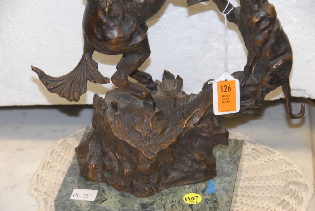 Reproduction of Charles Russell bronze of a mountain man on horseback fighting off mountain lion.