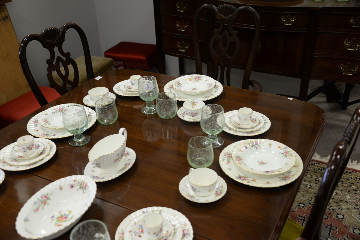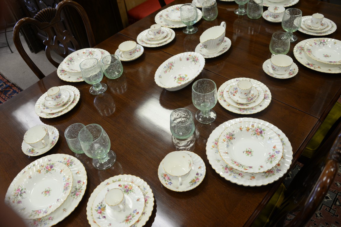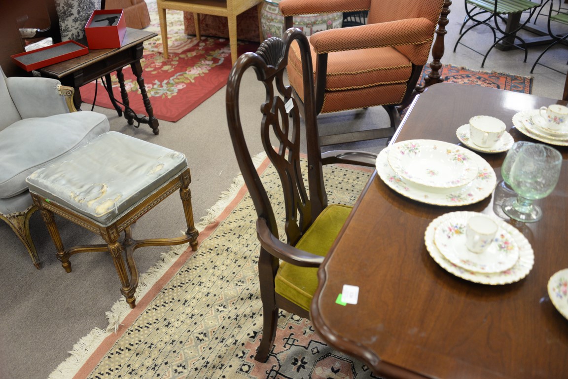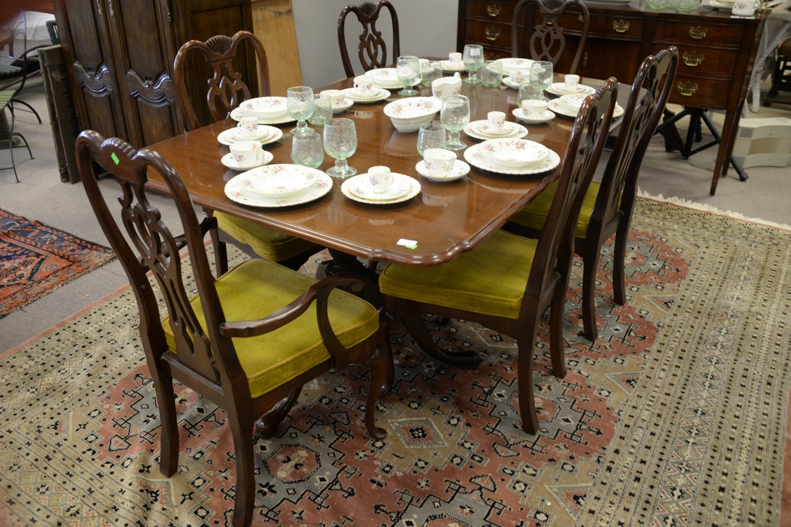 Lot 126: Thomasville mahogany double pedestal dining table with two 20inch leaves and six Queen Anne style chairs. ht. 30in., wd. 45in., lg. …