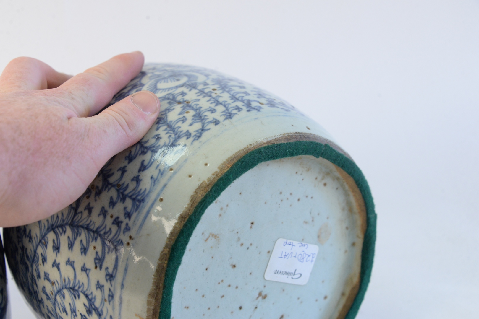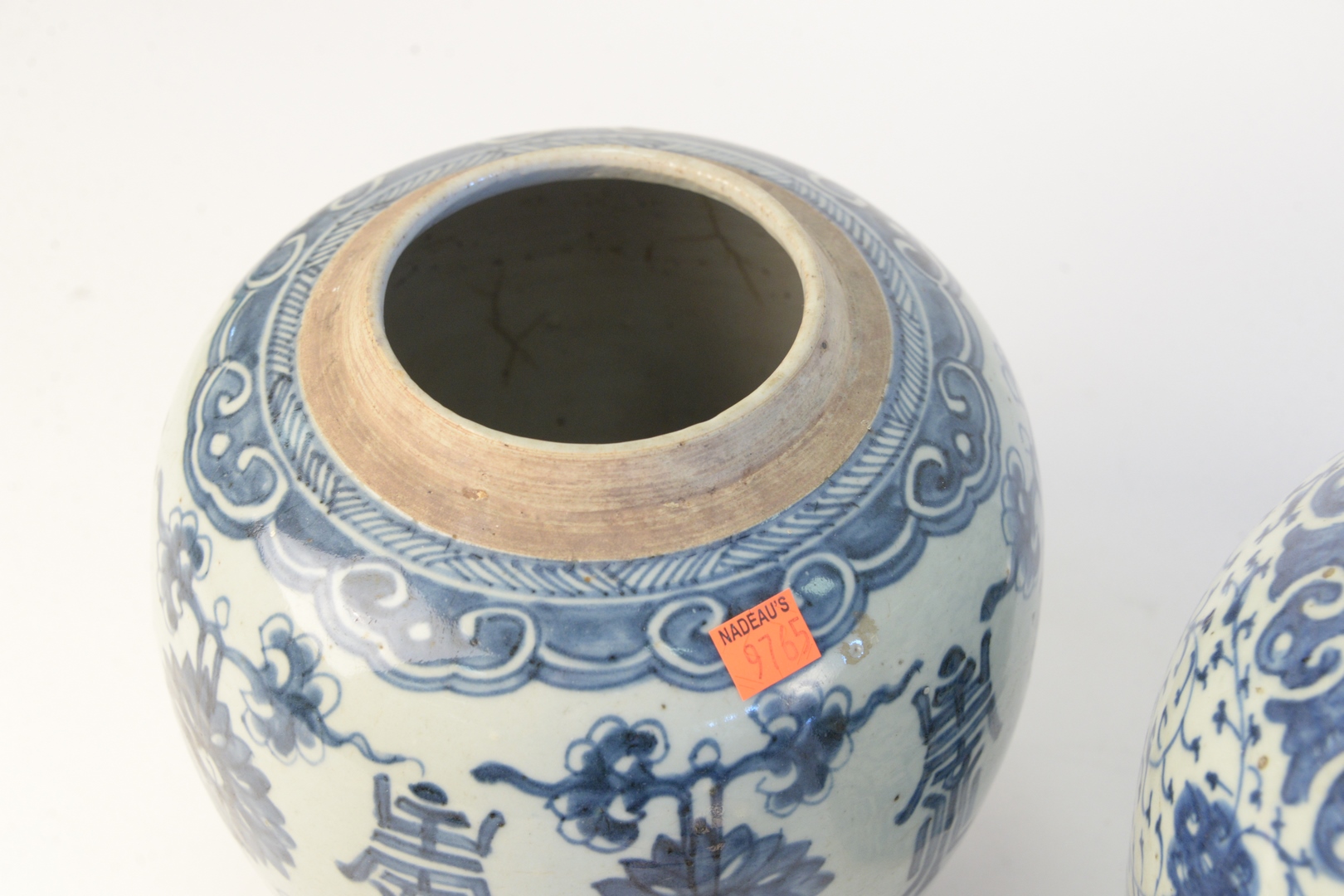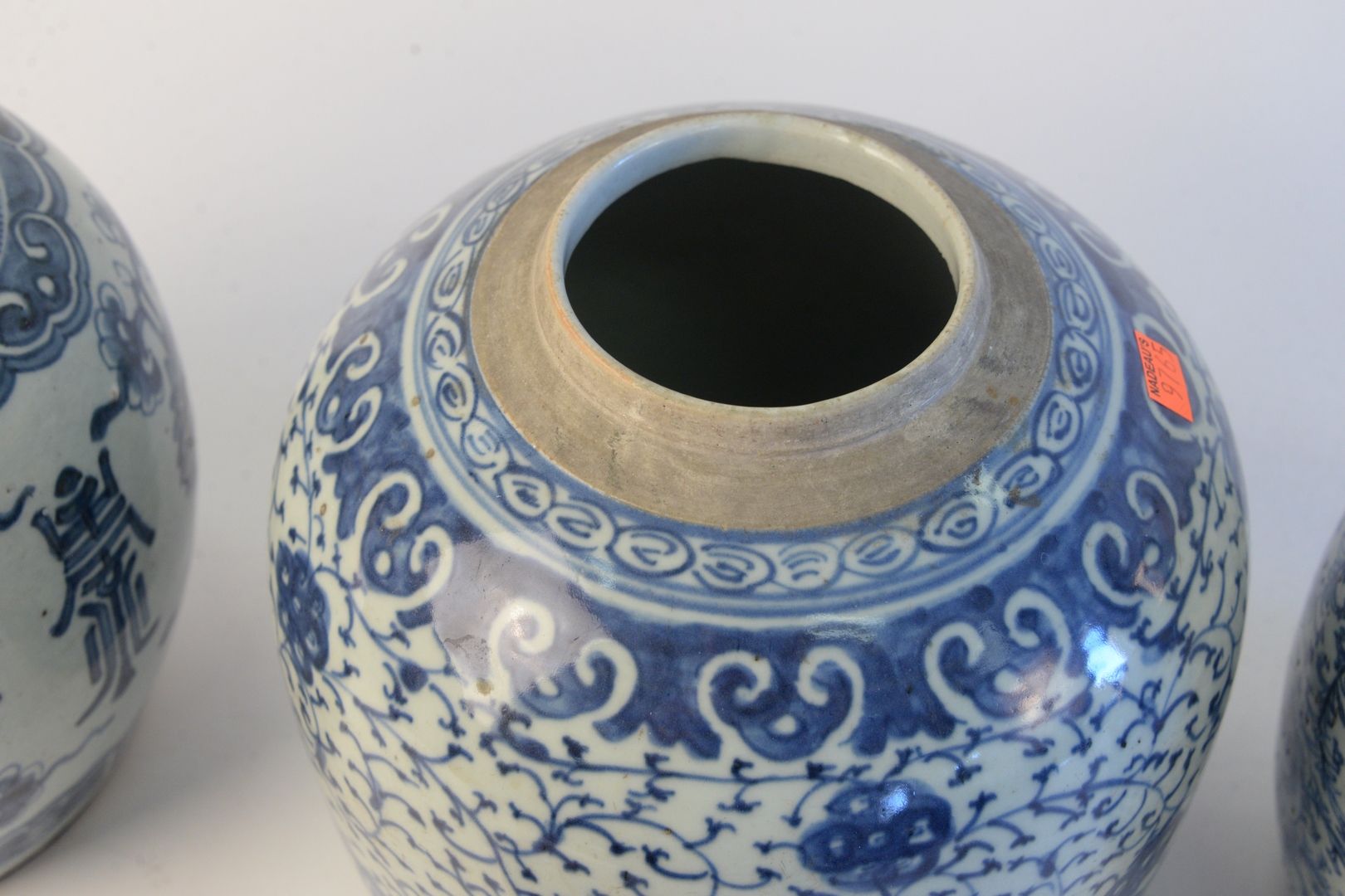 Lot 126: Three Chinese Blue and White Porcelain Ginger Jars, each having a silvered lid, tallest height 11 inches.