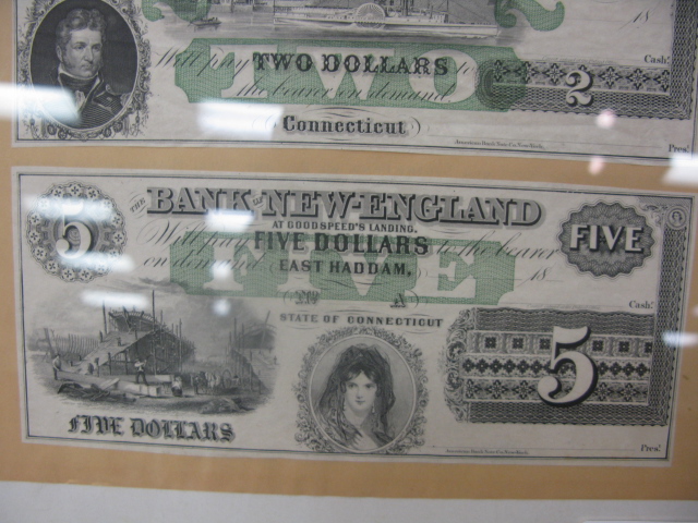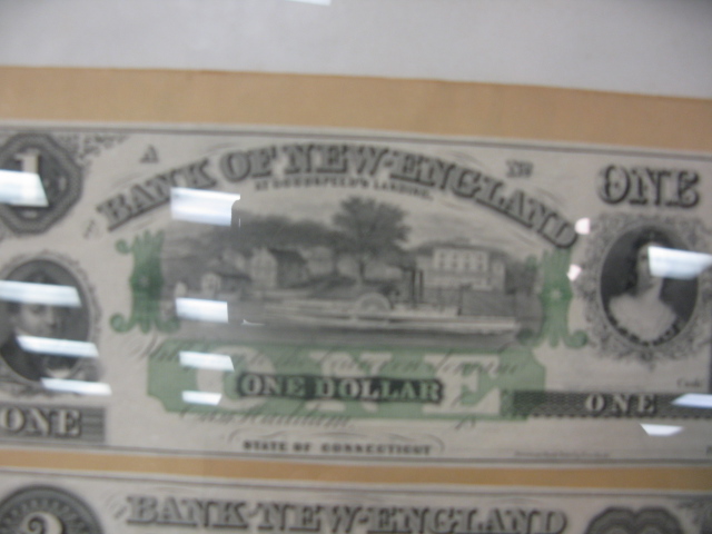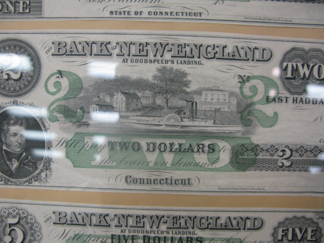 Three framed Bank of New England notes, 1, 2 and 5 denominations, East Haddam CT, unsigned.