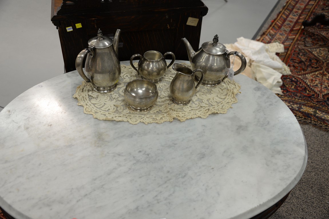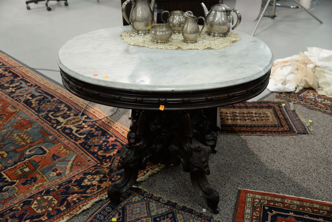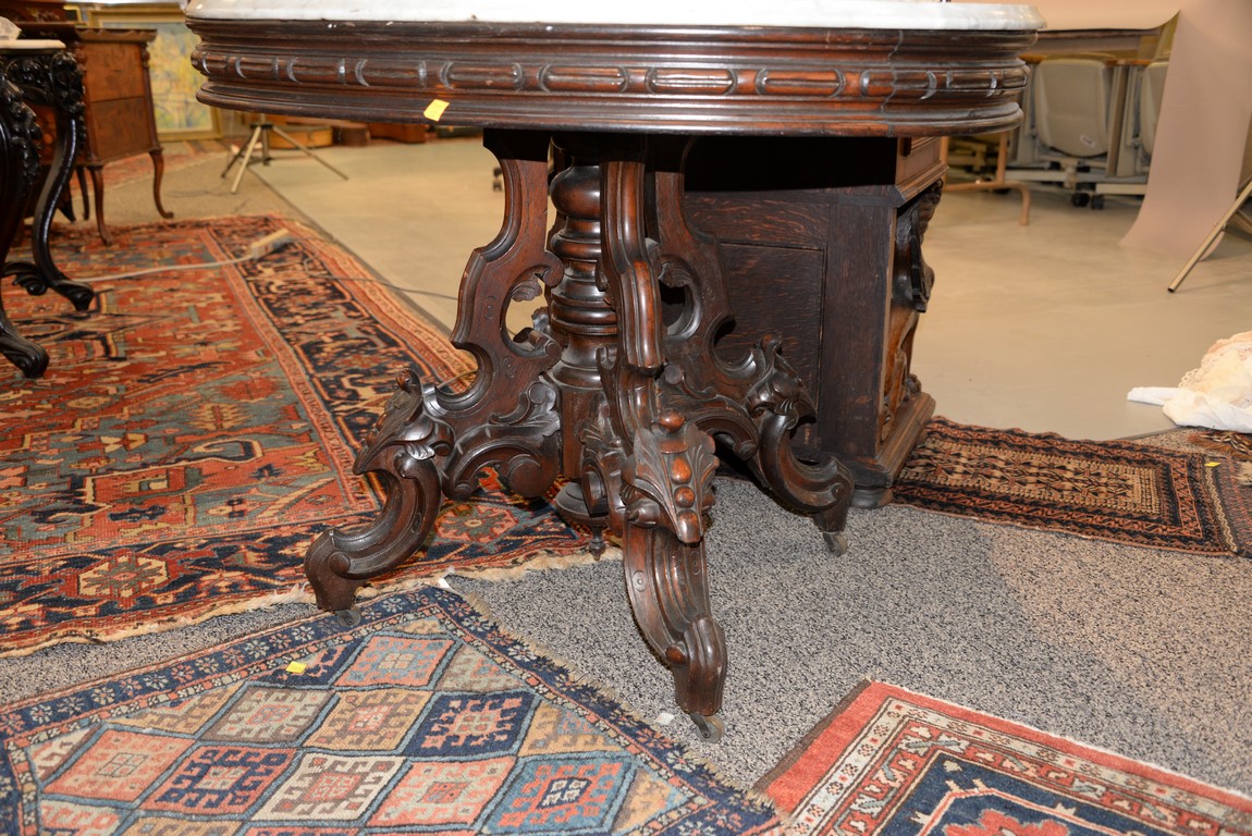 Lot 126: Victorian walnut table with oval marble top having carved edge and carved legs, attributed to Brooks. ht. 30 in. top: 30 3/4 x 39…