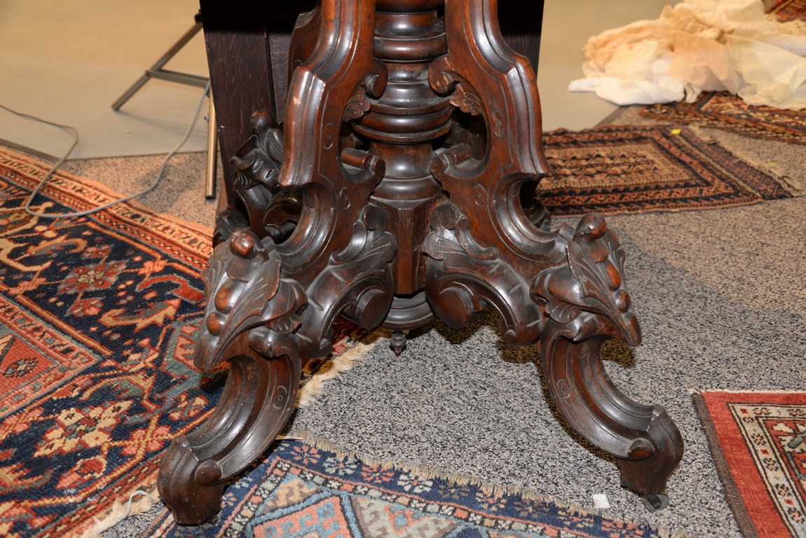 Victorian walnut table with oval marble top having carved edge and carved legs, attributed to Brooks.