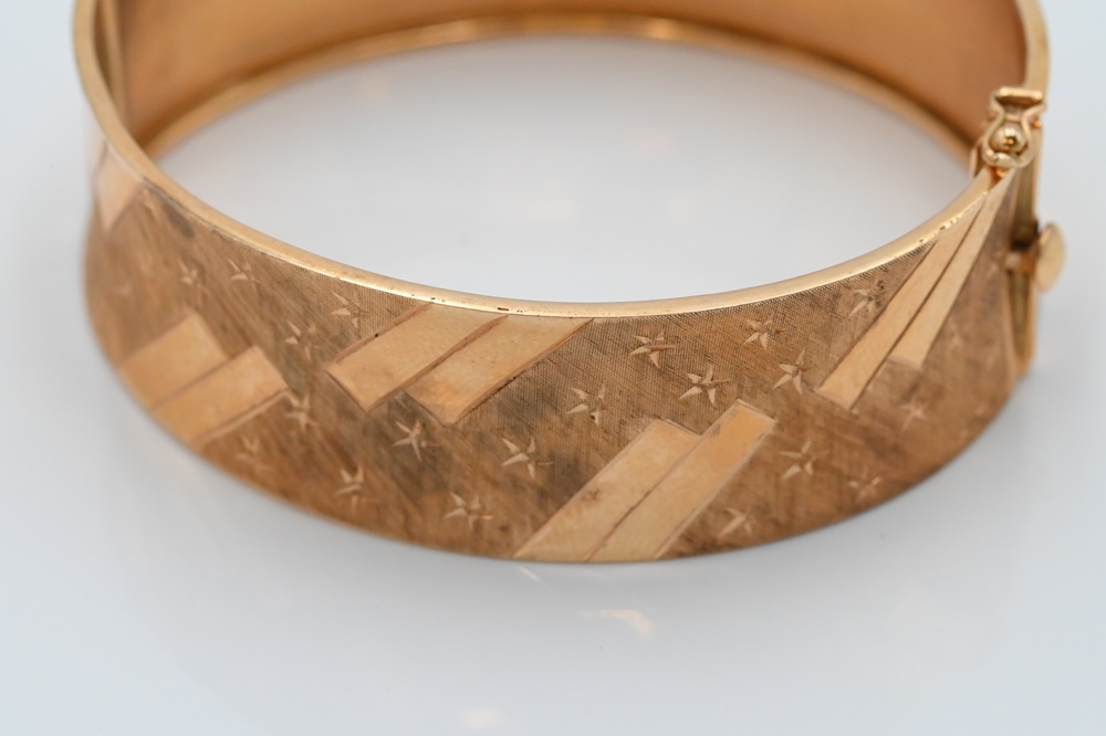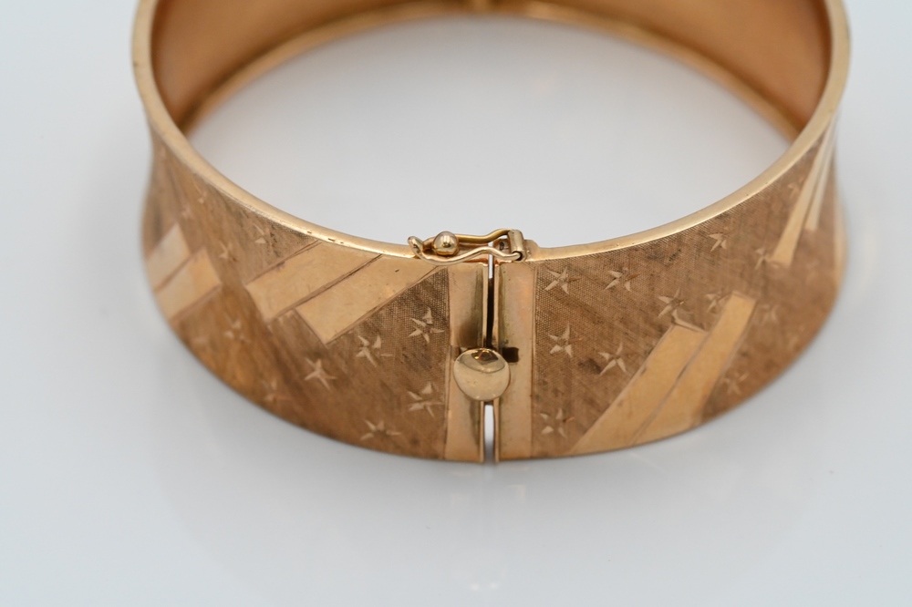 14 Karat Gold Bangle Bracelet, having brush and stars designs, 61 millimeter interior, 29 grams.