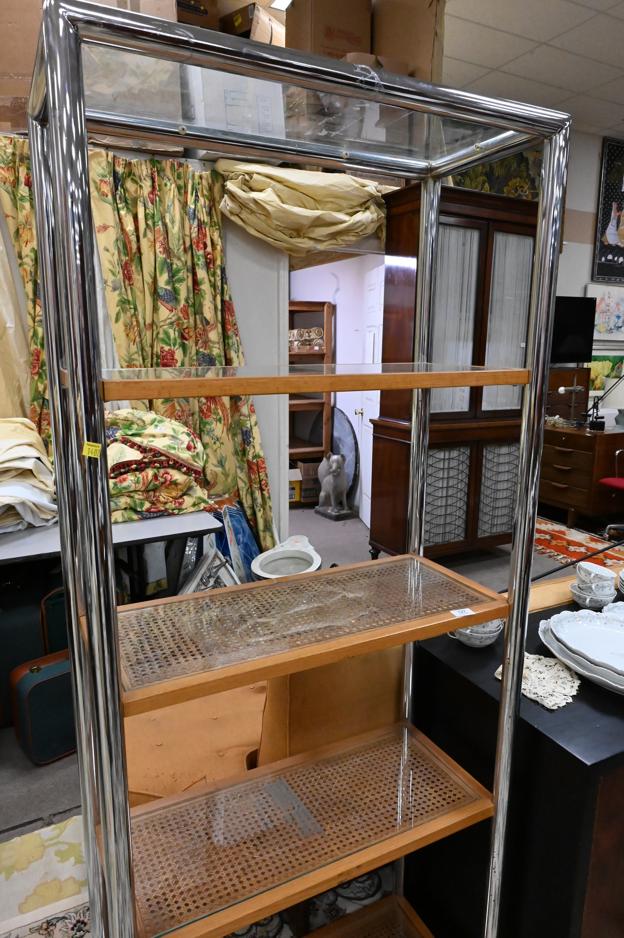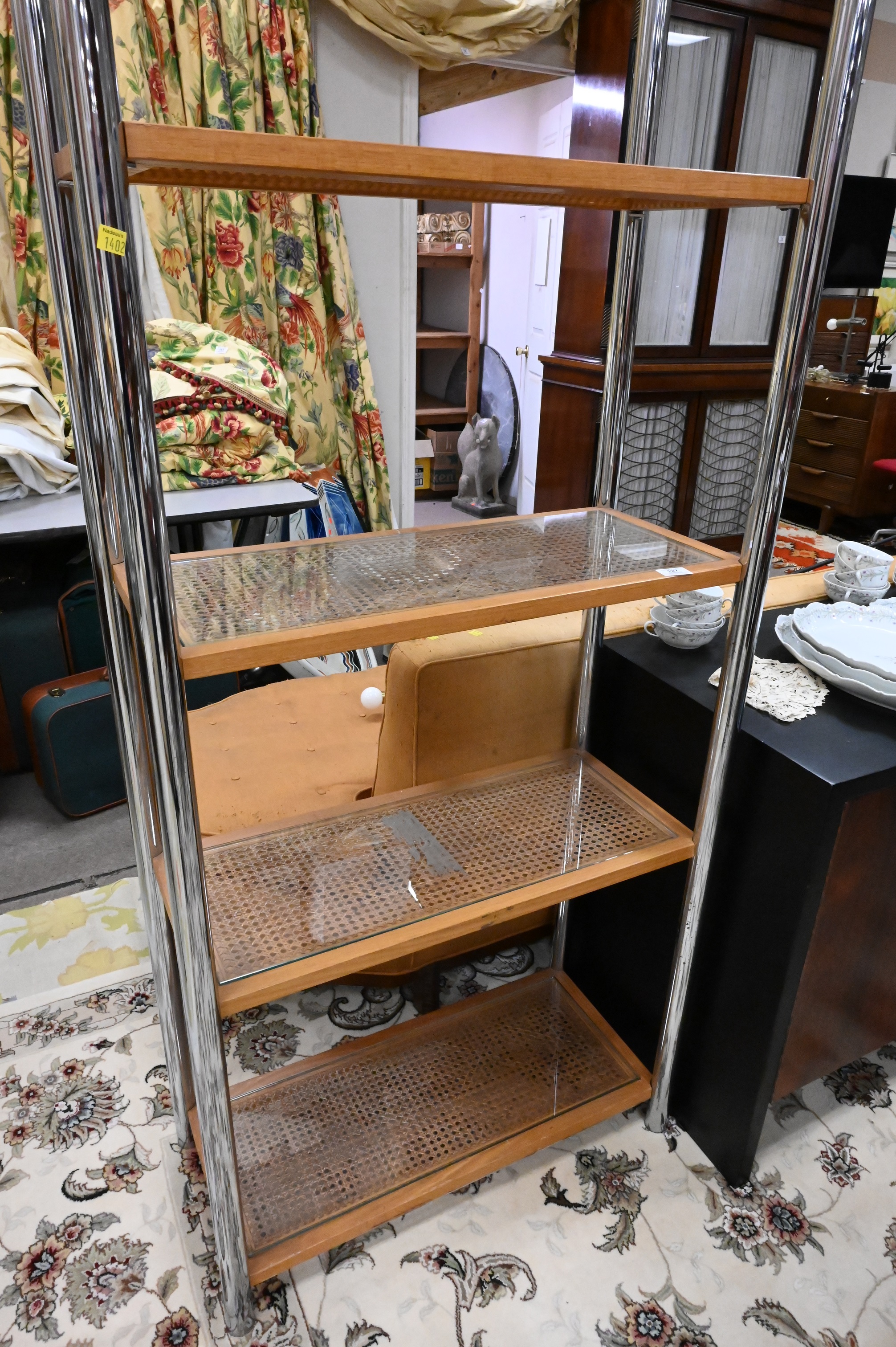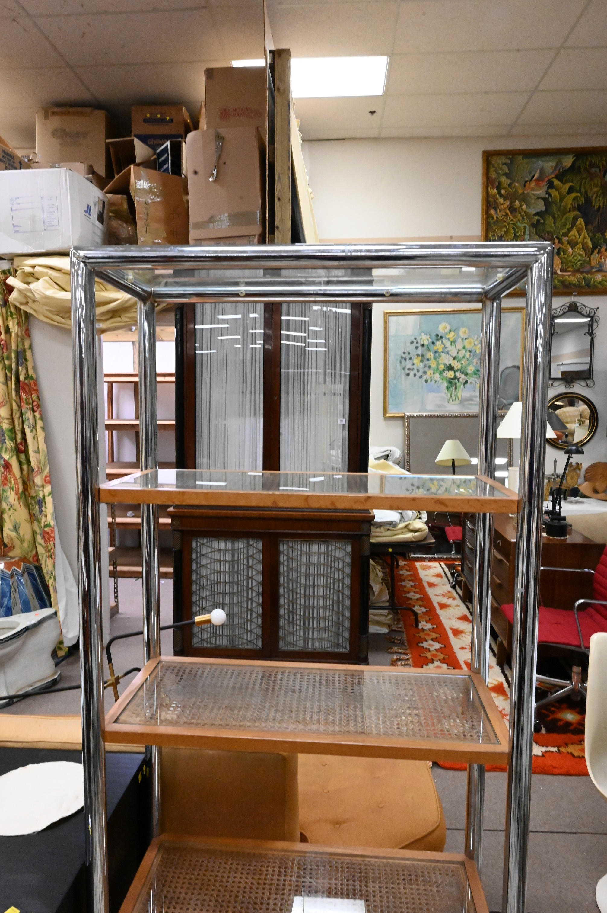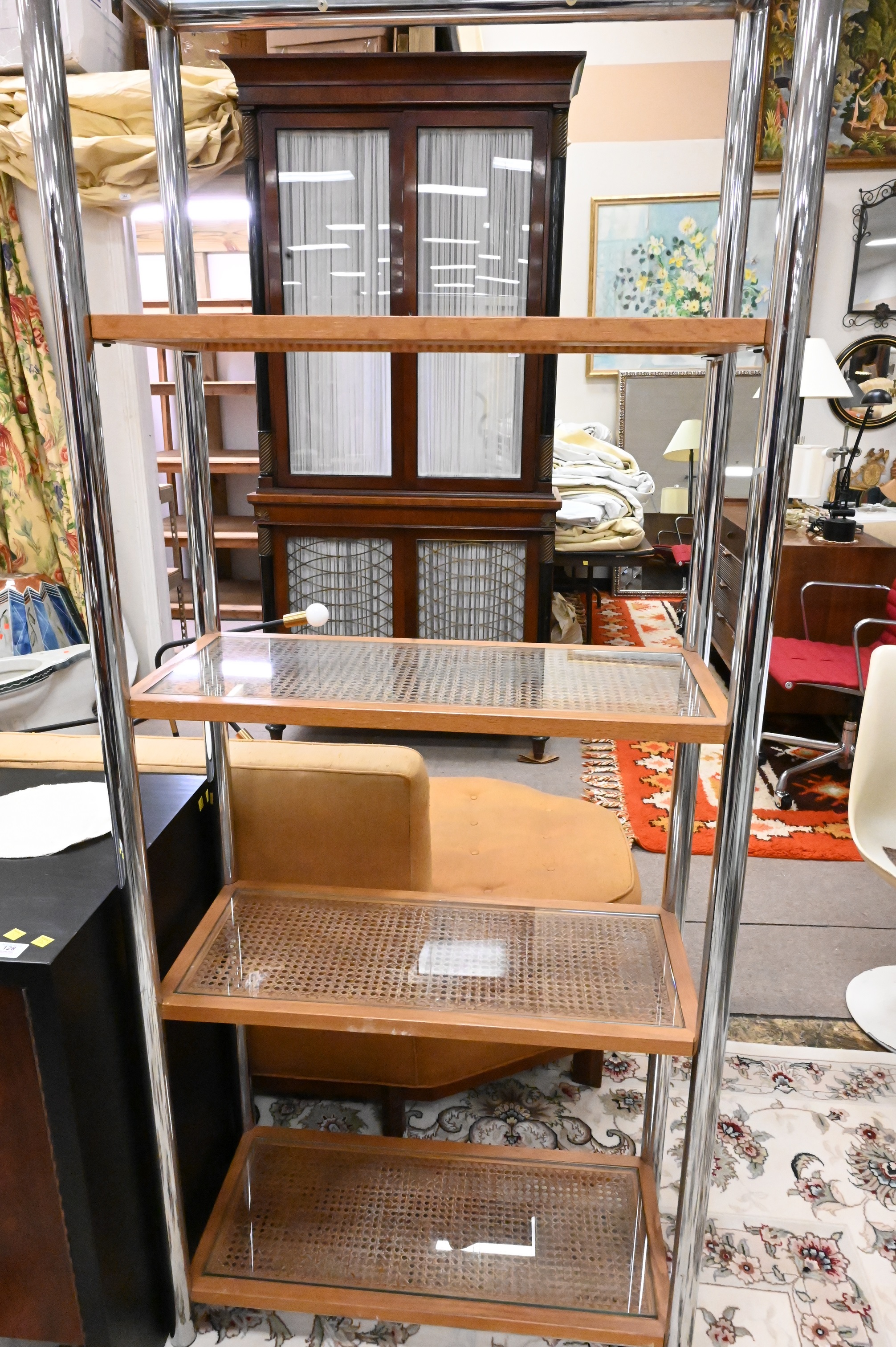 A Pair of Chrome and Caned Milo Baughman Era Etageres, having glass inserts over canning, height 72 inches, width 30 inches.