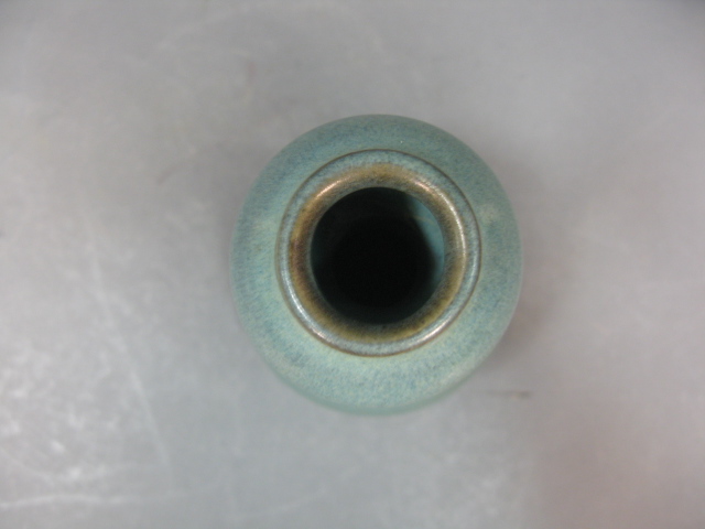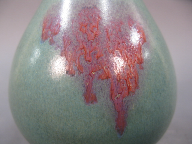 A purple splashed, double gourd vase with body covered in teal glaze having a freely splashed lavender spot.
