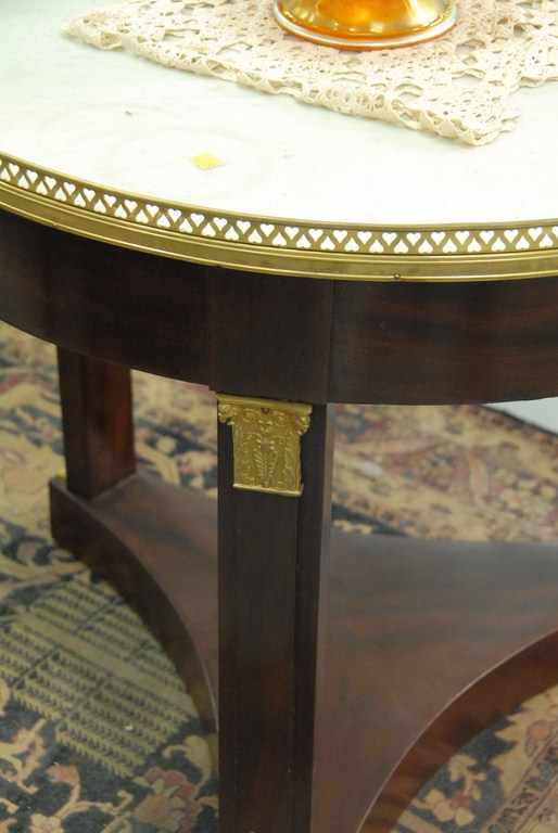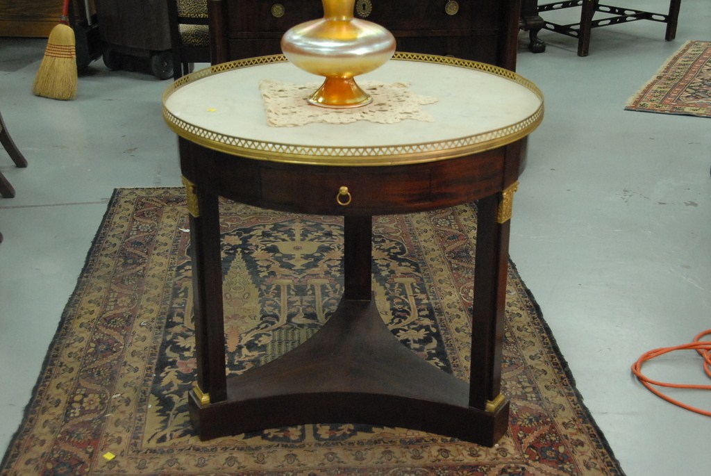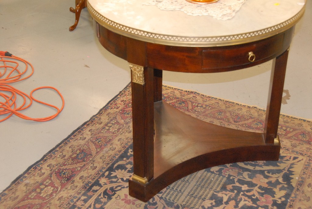 Lot 127: Charles X mahogany bouillotte table with round galleried white marble top above a conforming frieze with three drawers, the whole ra…