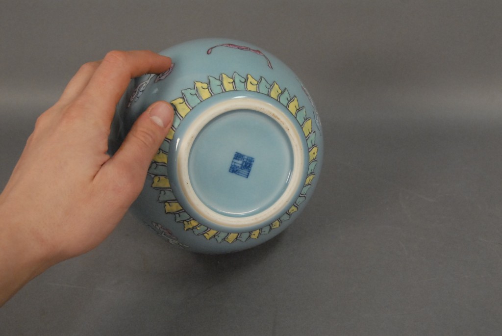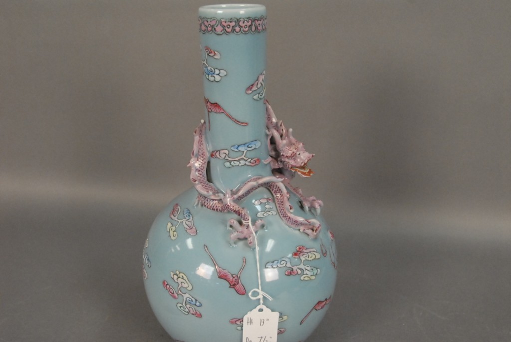 Lot 127: Dragon bottle vase, having molded five claw dragon around neck of vase and painted flaming clouds and bats chips, ht 13.