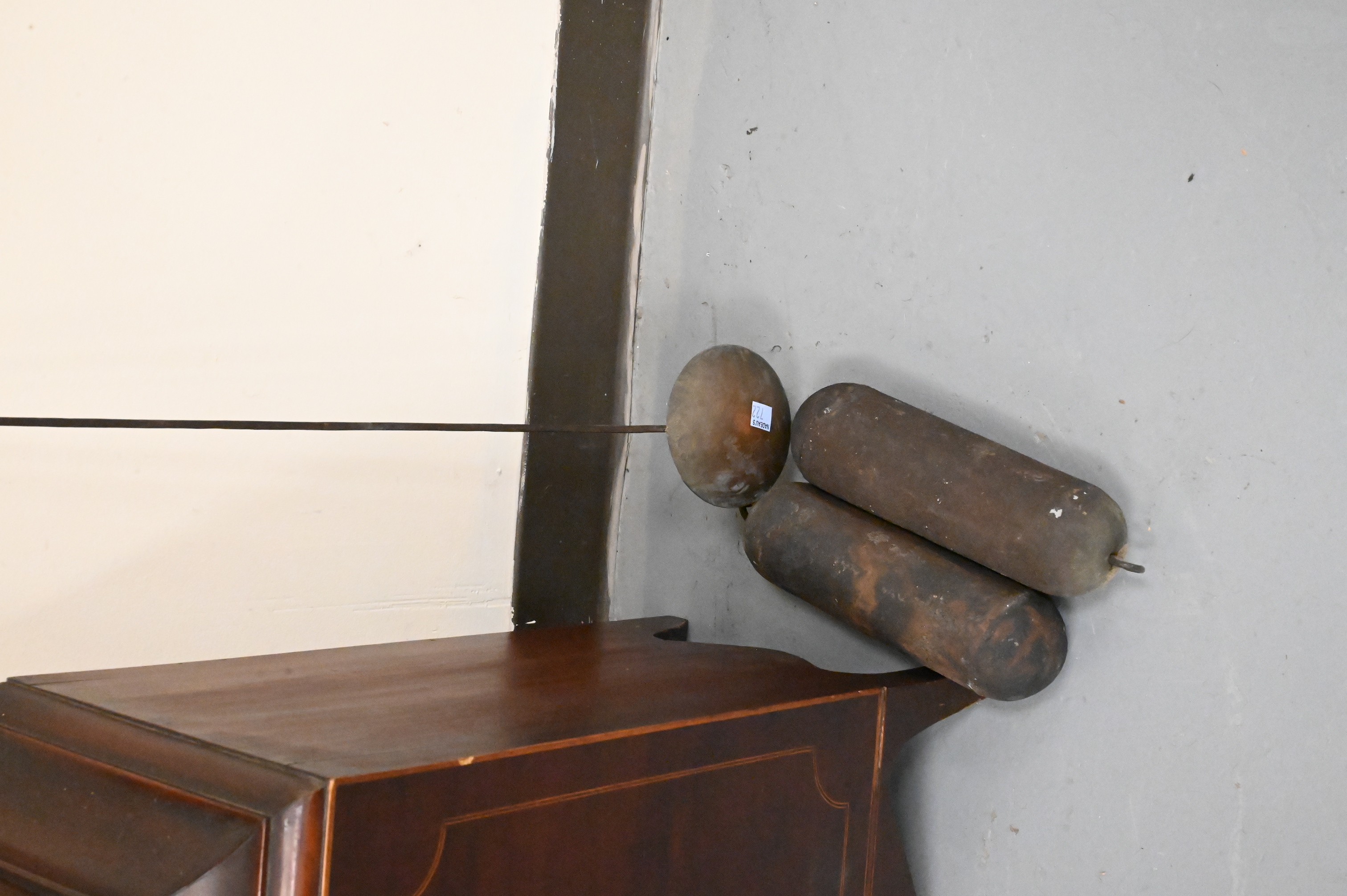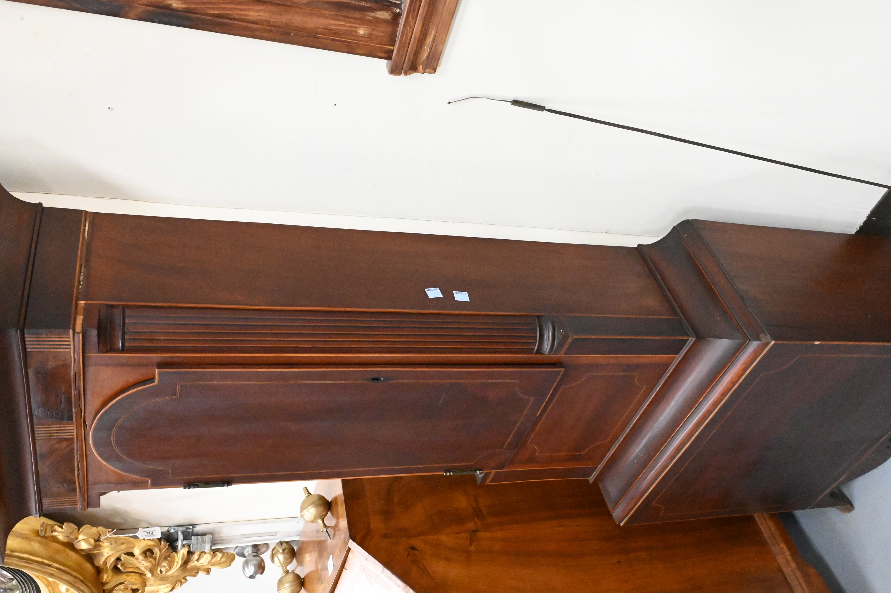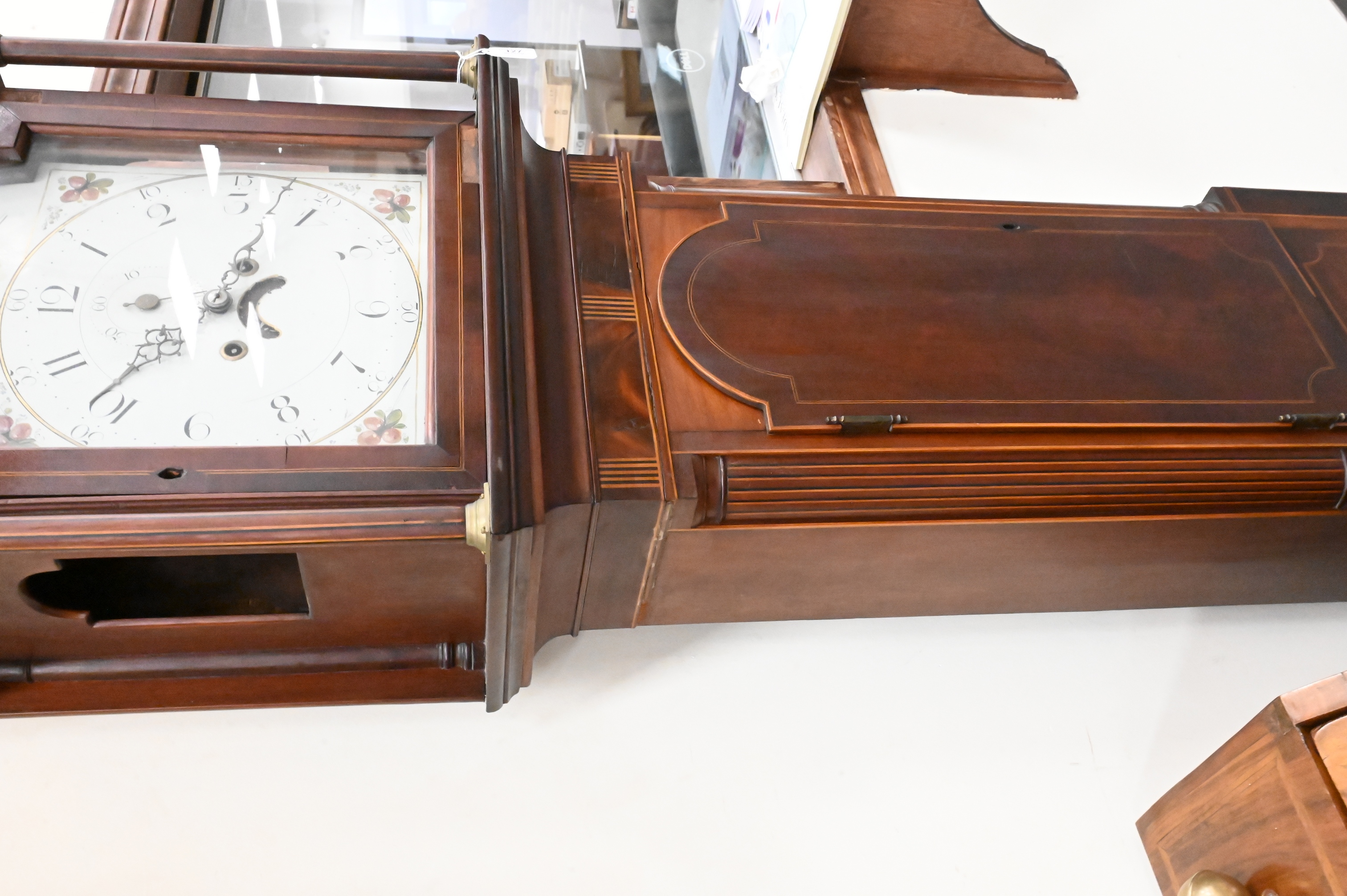 having broken pediment top over tombstone door over arched top door on base having flaring French feet, ebonized light wood inlay, porcelain dial, American brass works, pendulum, and weights, several veneer chips on top and lower case