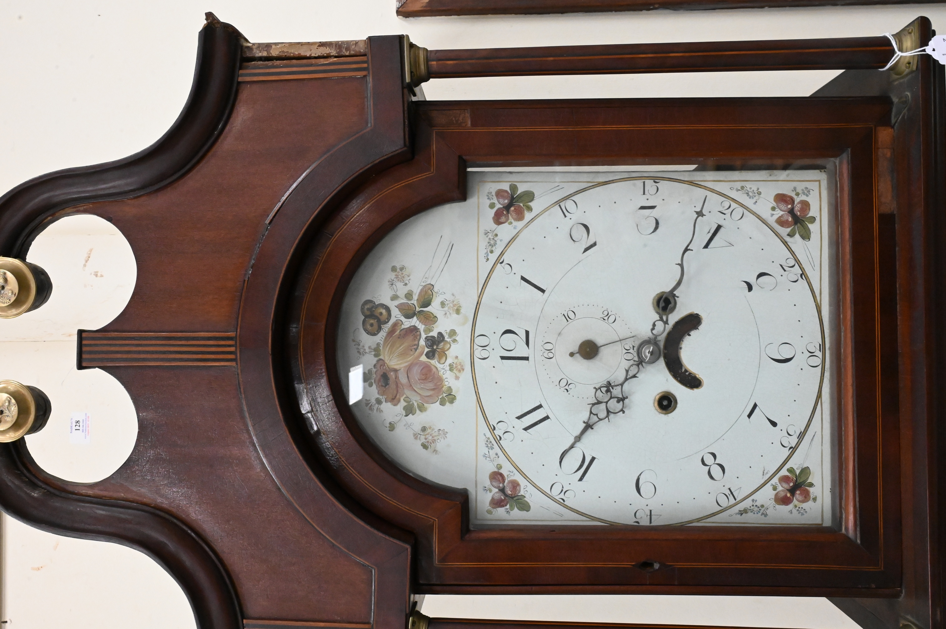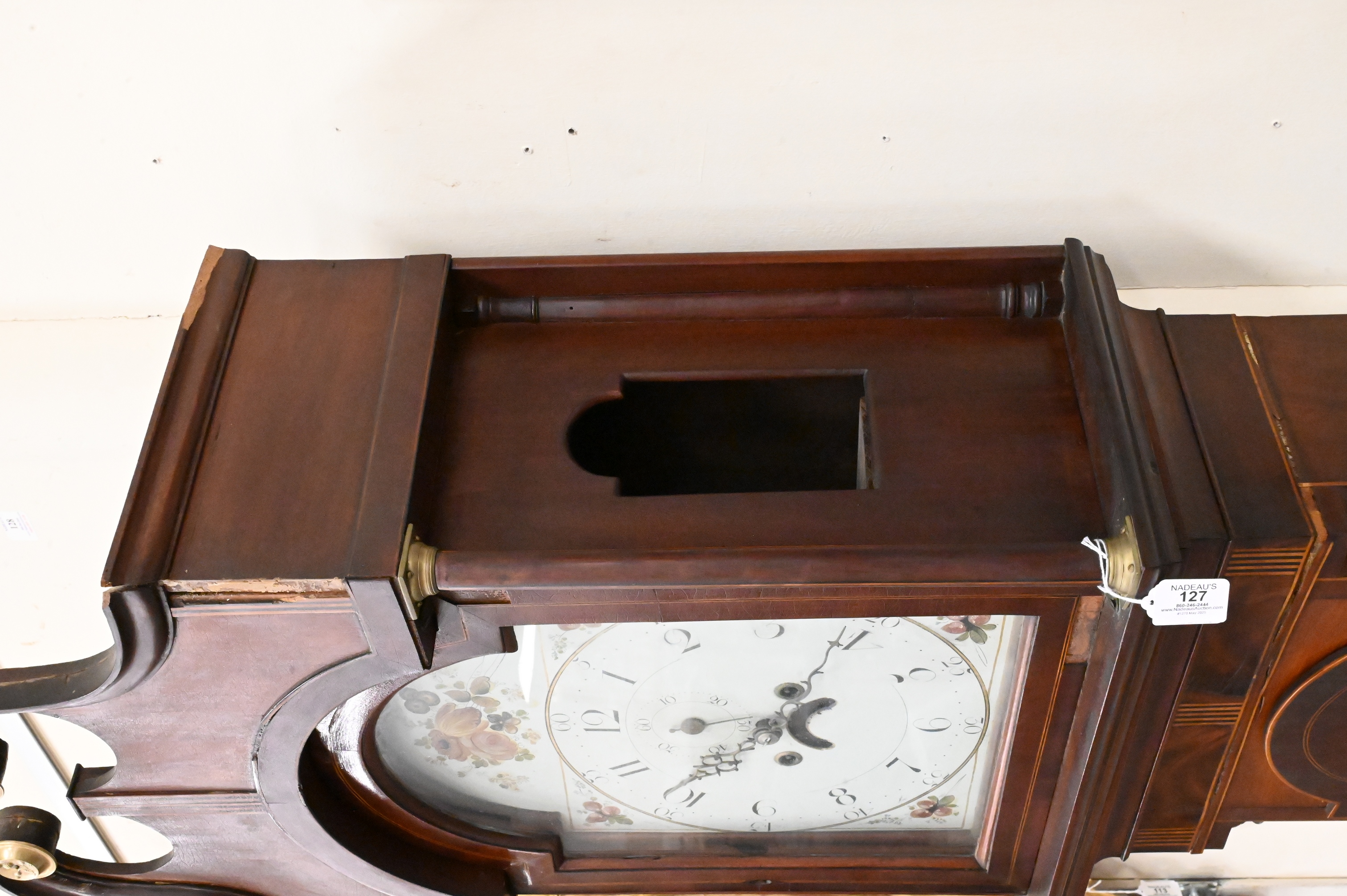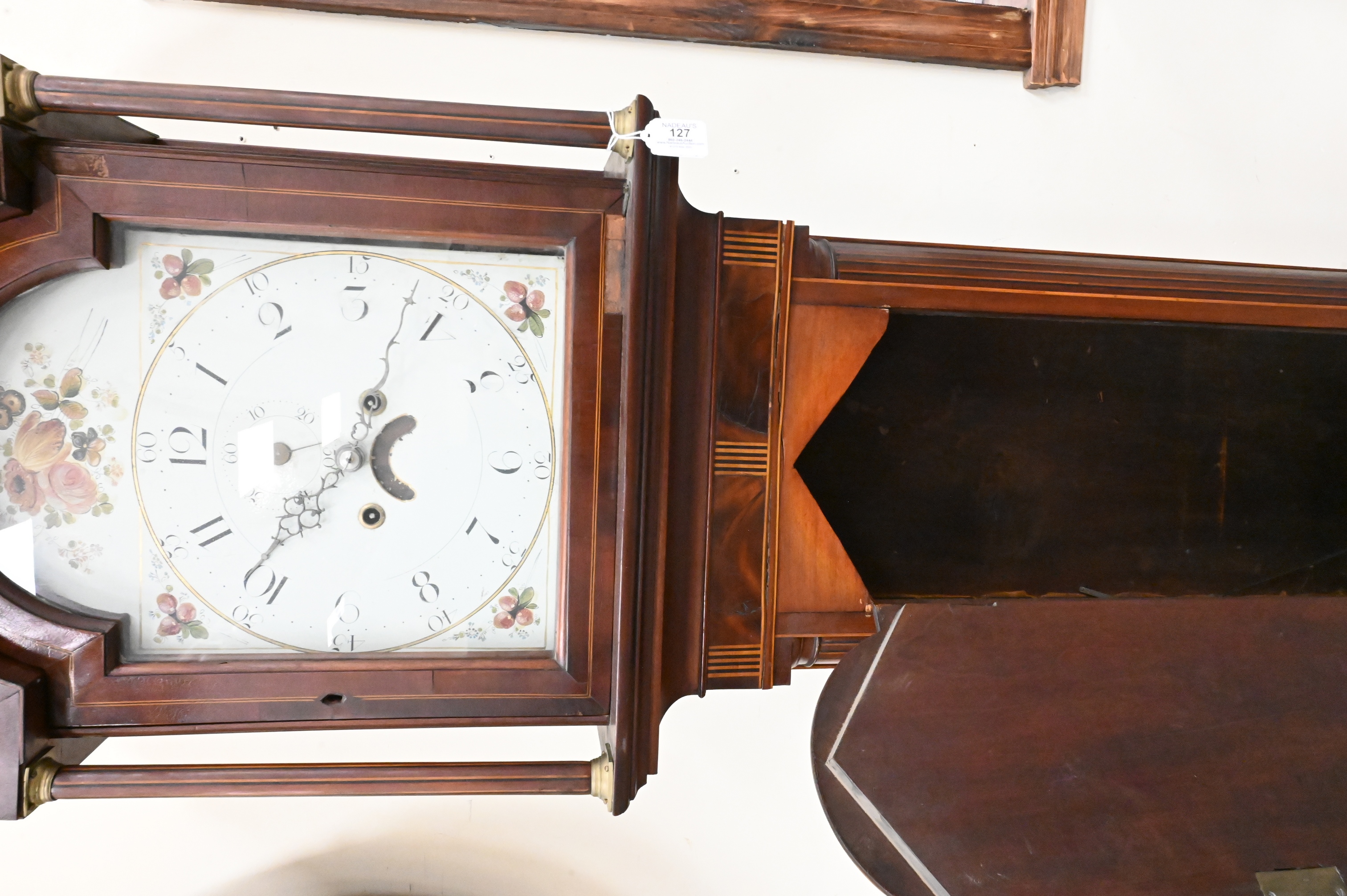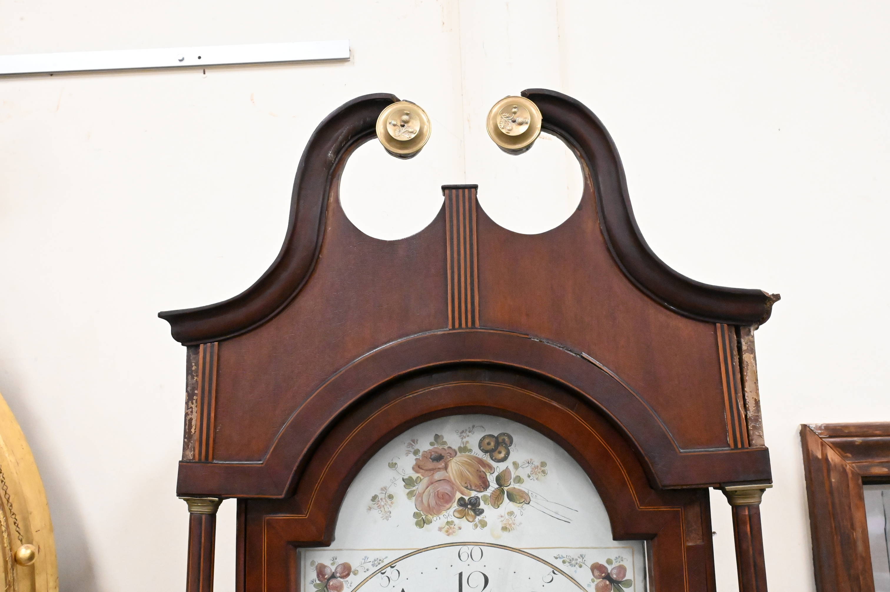 having broken pediment top over tombstone door over arched top door on base having flaring French feet, ebonized light wood inlay, porcelain dial, American brass works, pendulum, and weights, several veneer chips on top and lower case