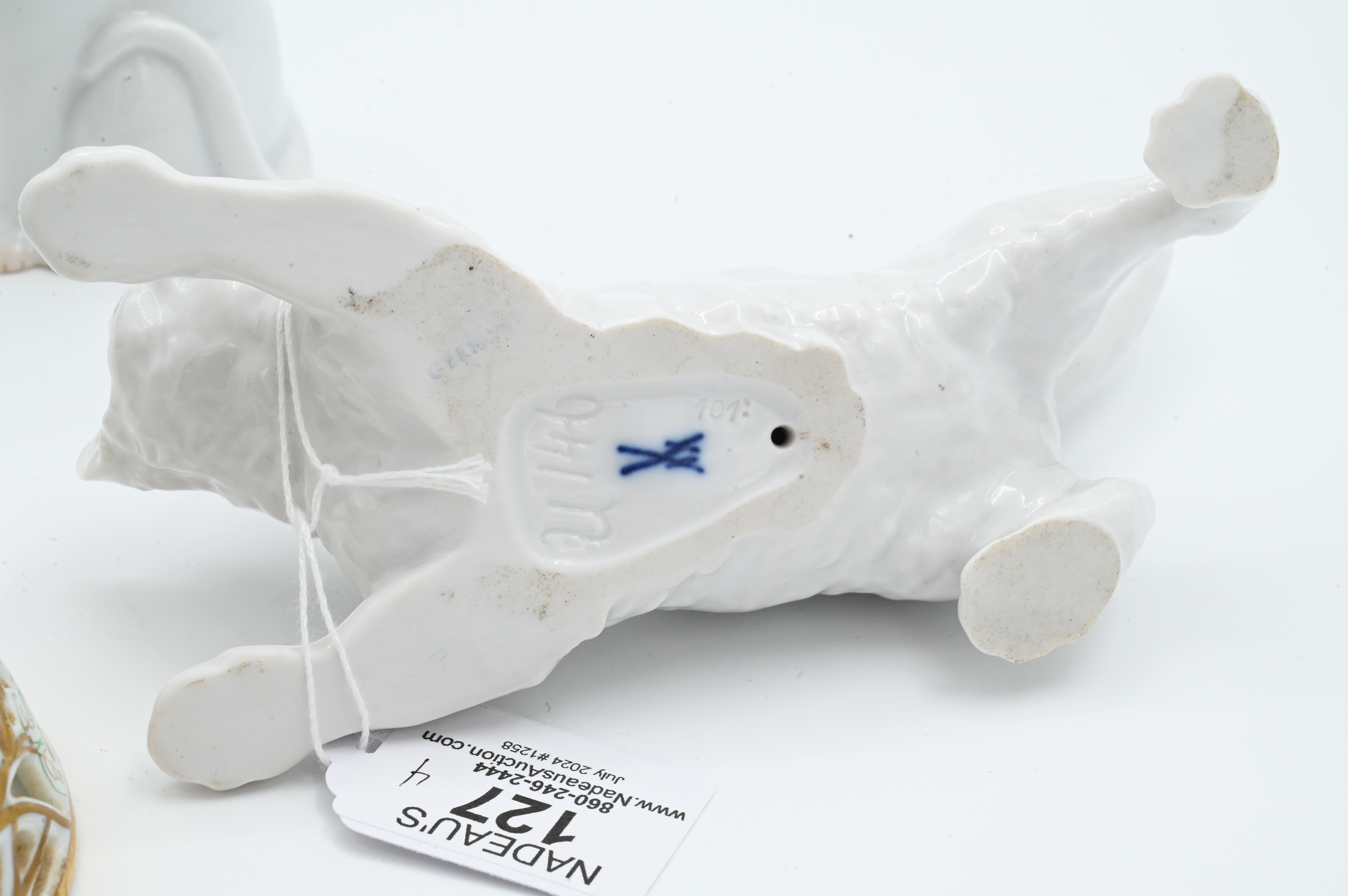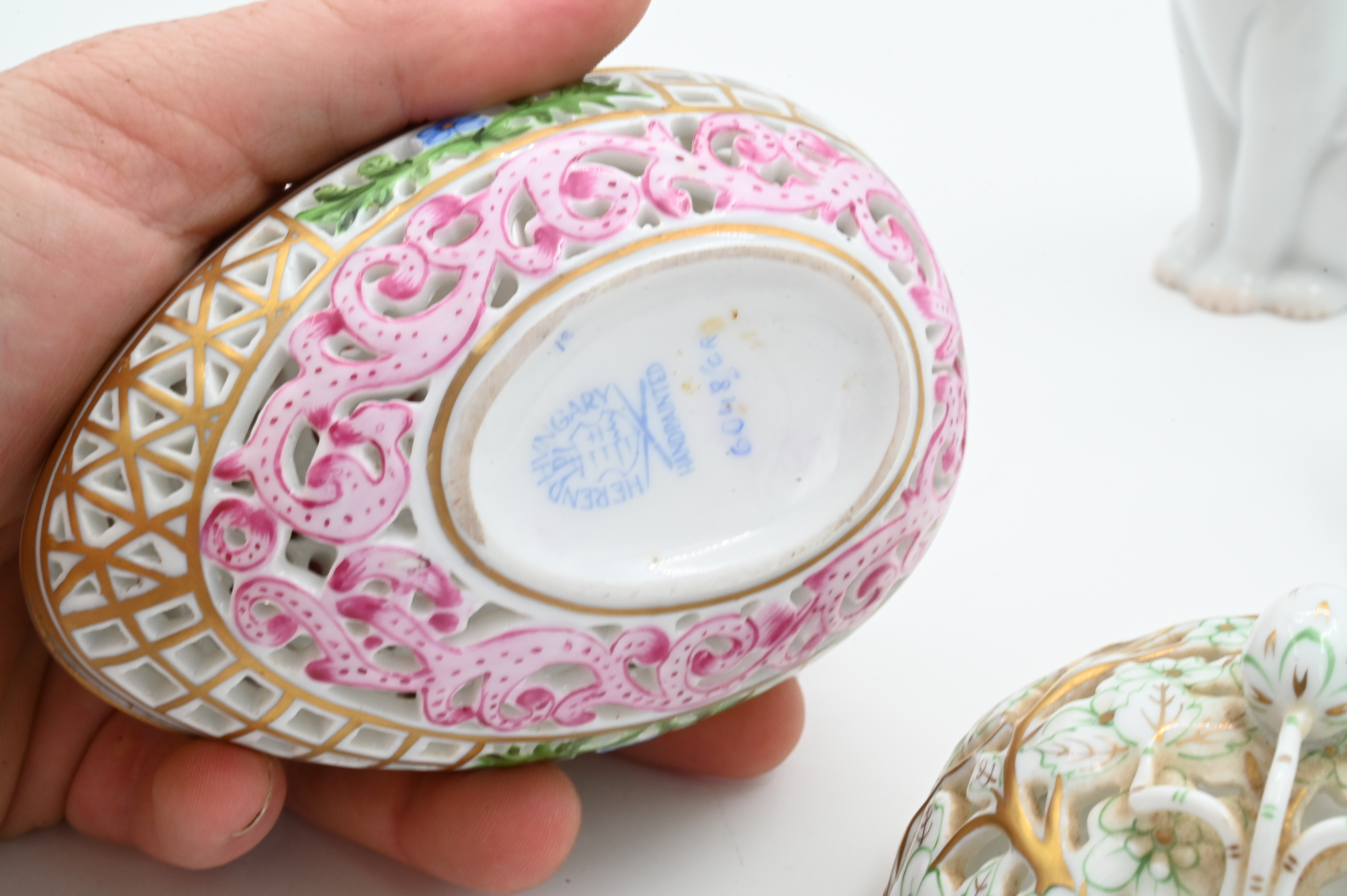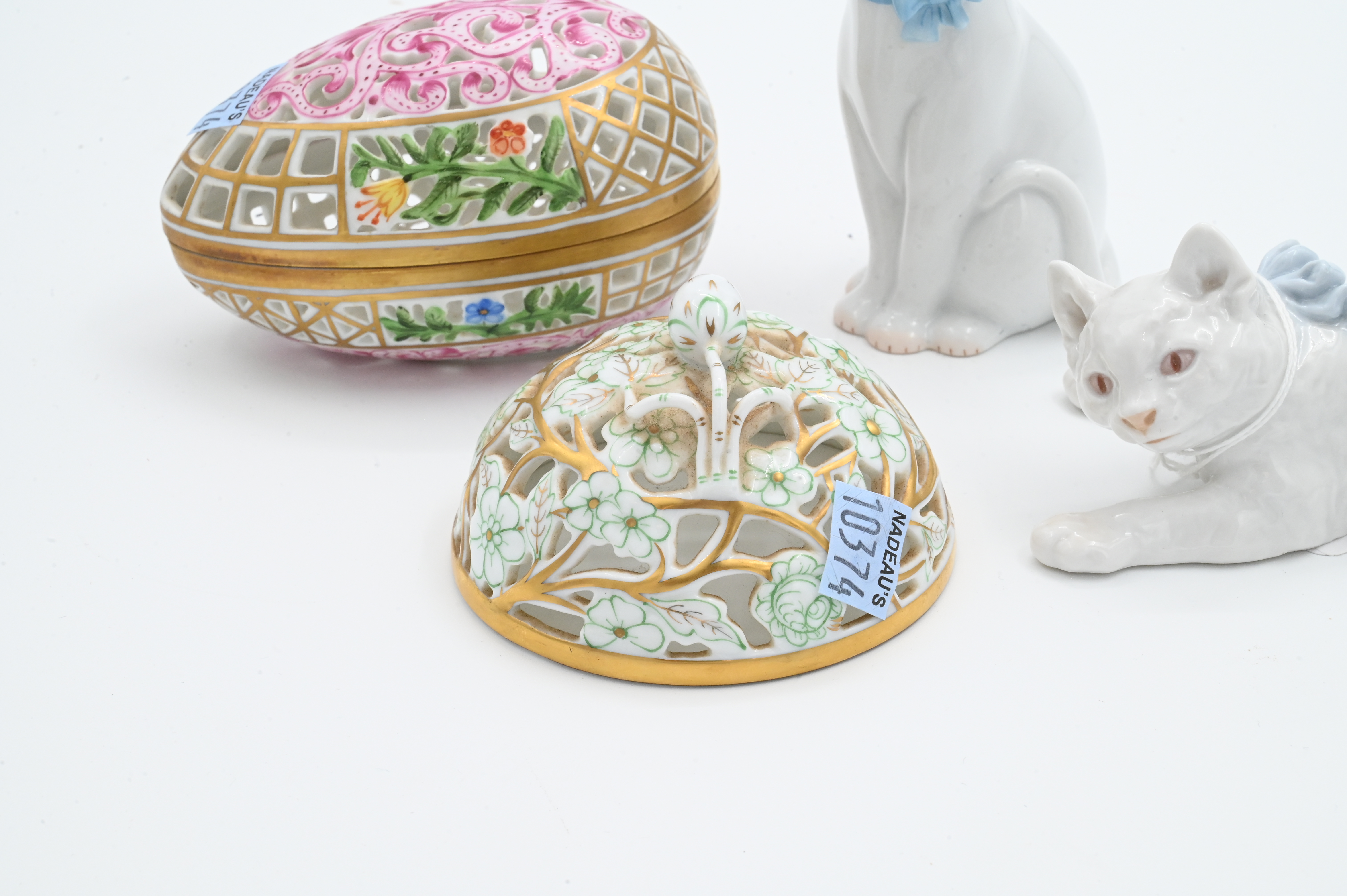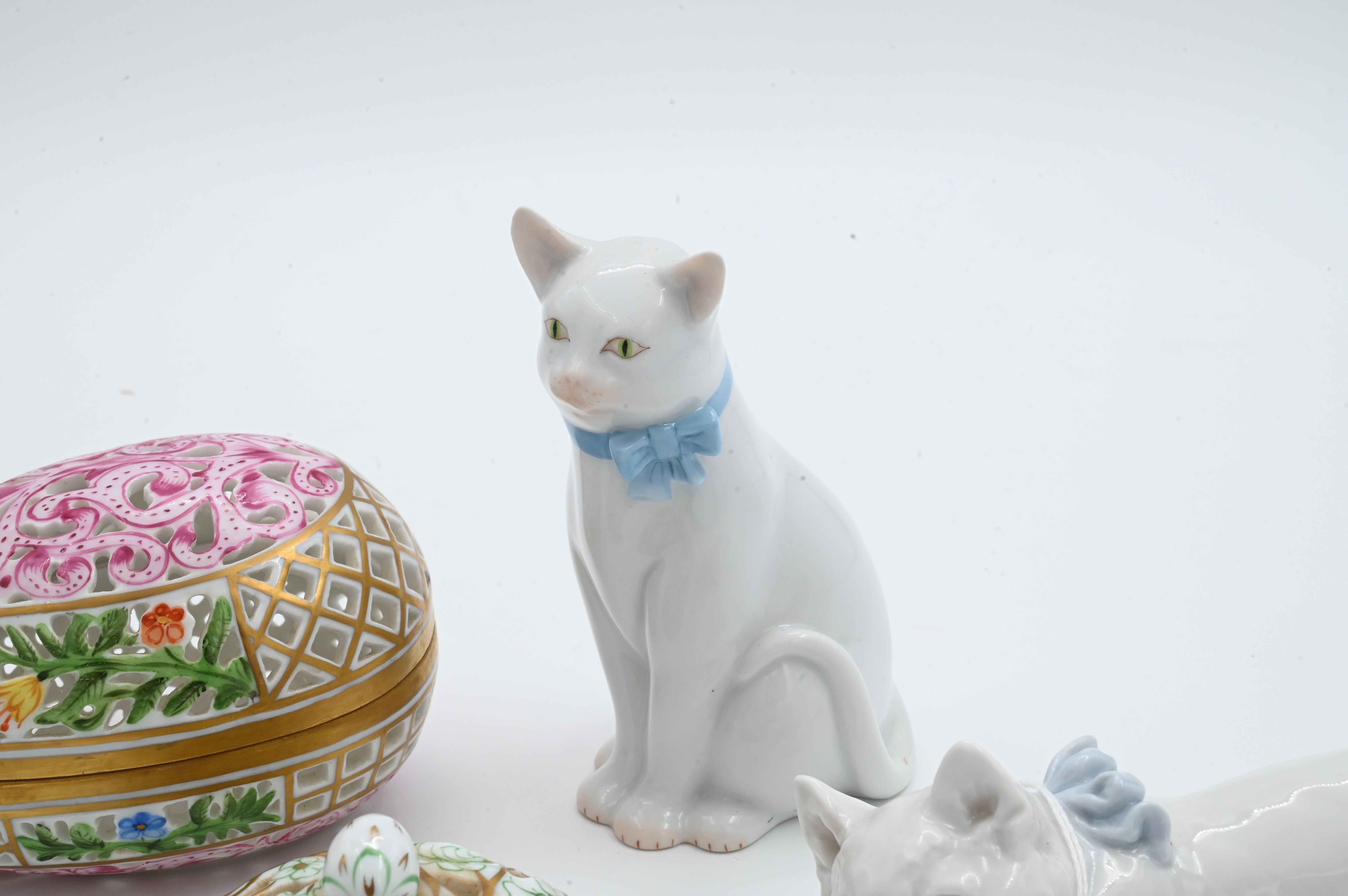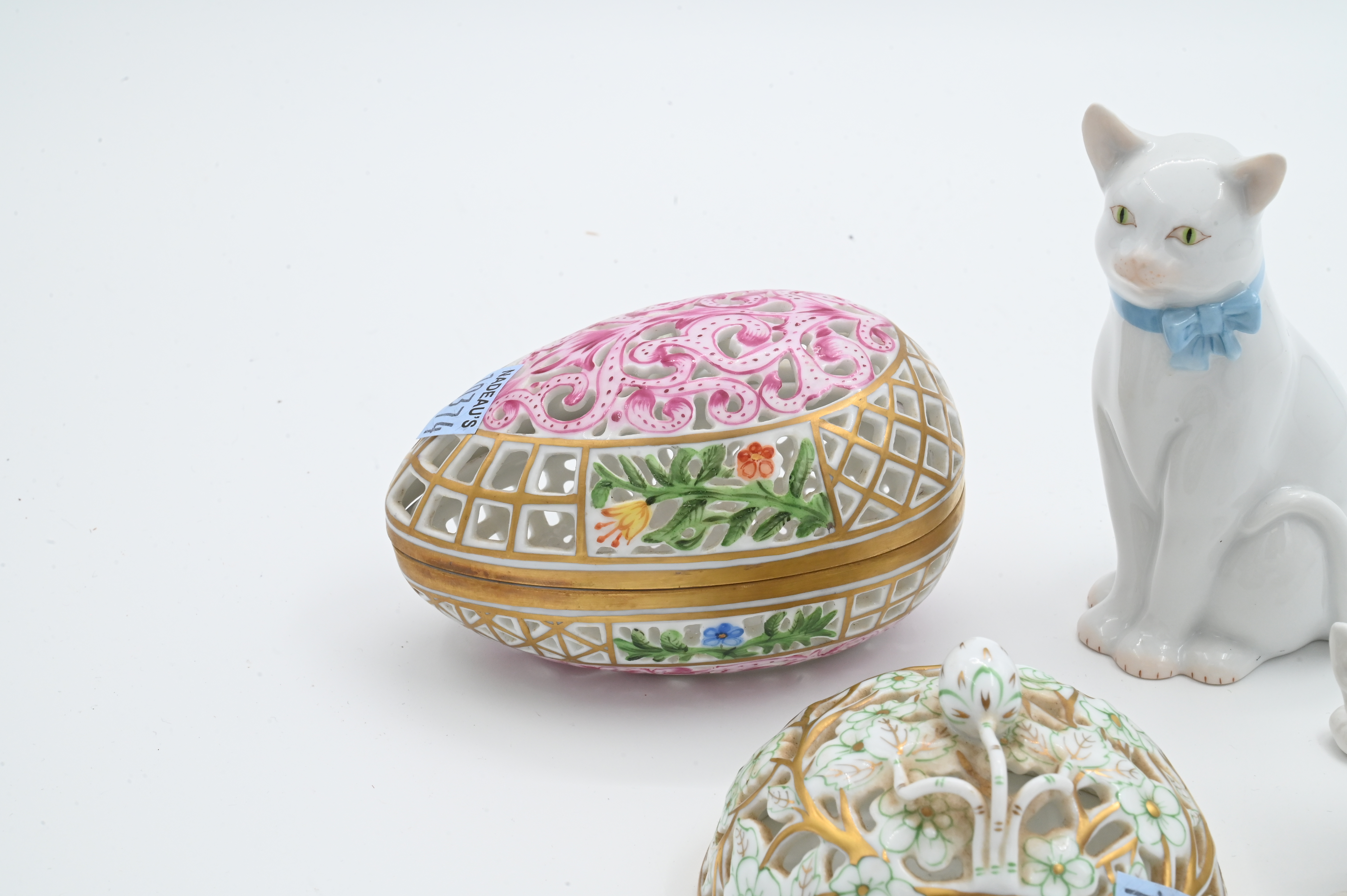to include white Meissen cat with blue bow, white Herend cat with blue bow, Herend reticulated egg trinket box, reticulated Herend trinket lid