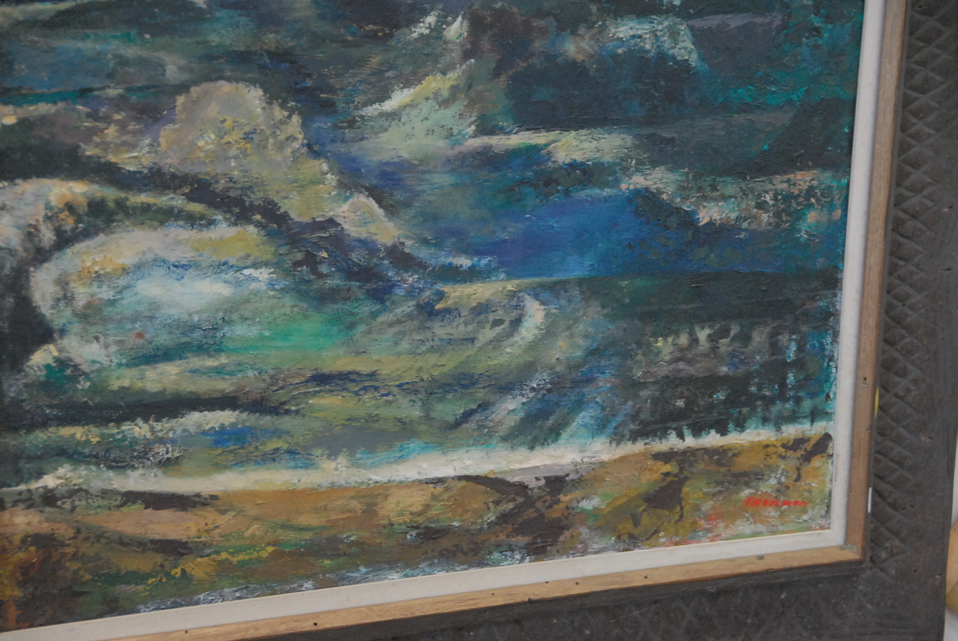 Lot 127: Group of four E Hellman paintings including oil on canvas Cliffs signed lower right 26 x 21 and oil on canvas abstract 20 x 16.