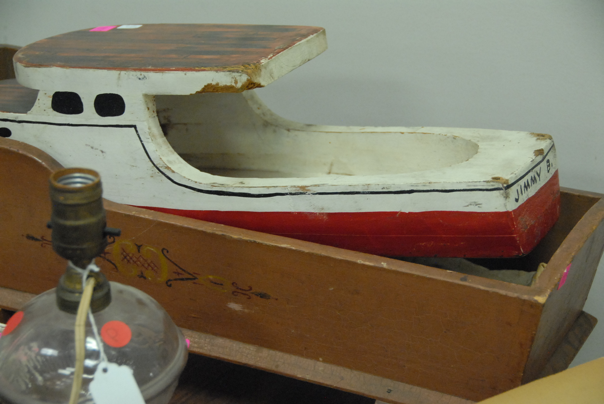 Lot to include three Italian painting books, glass ball with sand and shell etc., whale oil lamp, brass hook, tole match holder, mahogany tray, oval basket, two piece lot to include primitive doll cradle with original paint lg. 23 1/2in., and primitive boat model lg. 20 1/2in. wd. 6 1/2in.