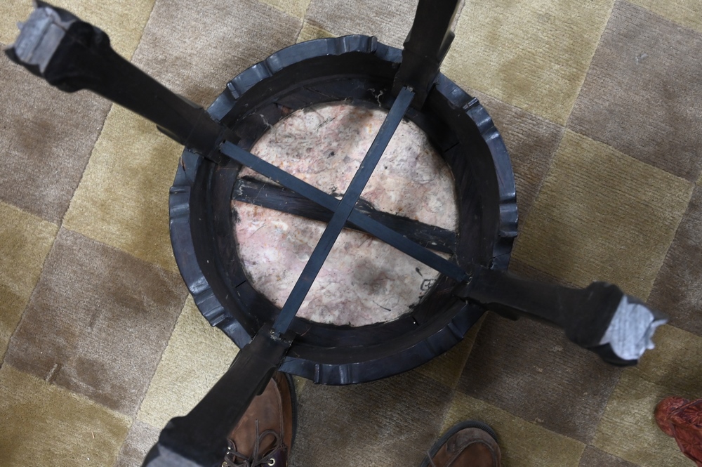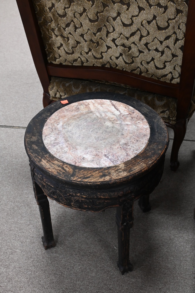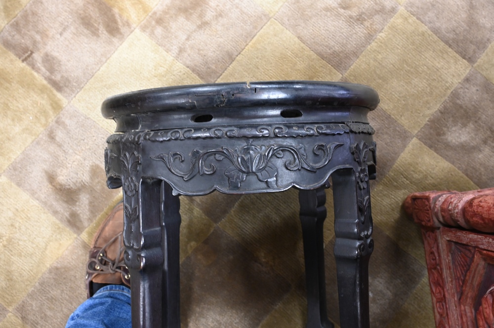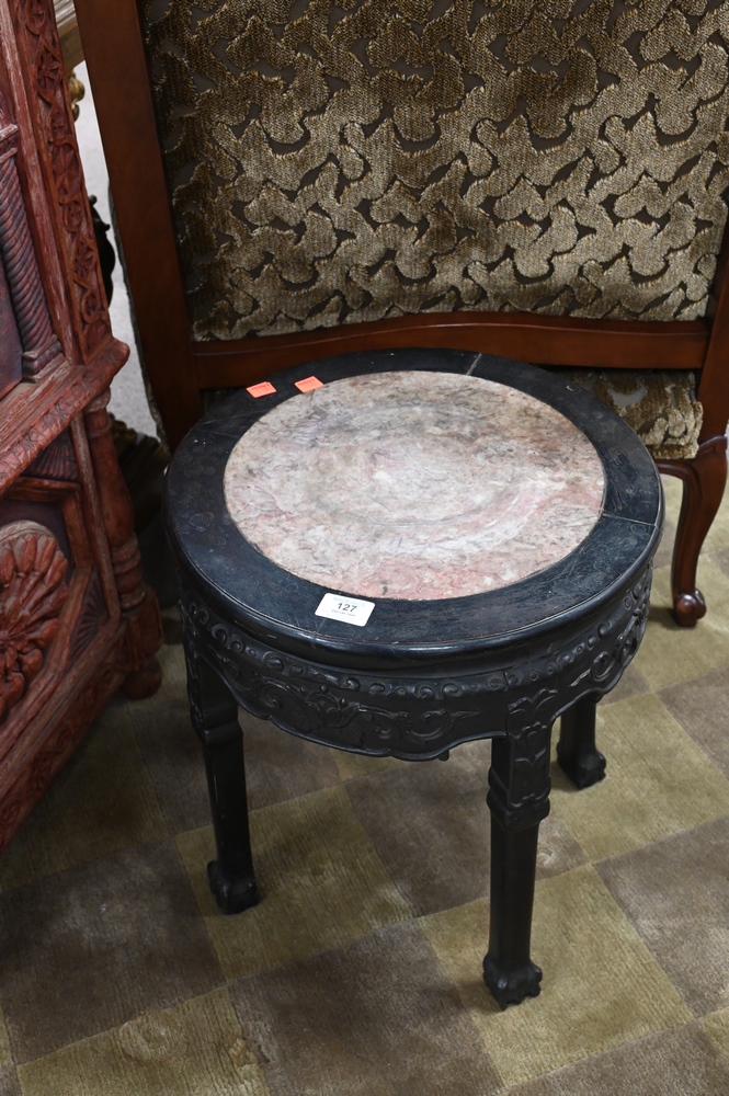 Lot 127: Near Pair of Carved Chinese Stands, both having inset marble, height 18 inches, diameter 16 inches.