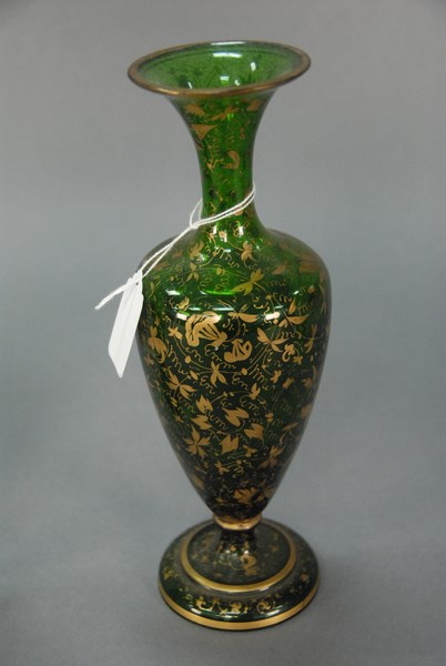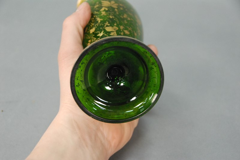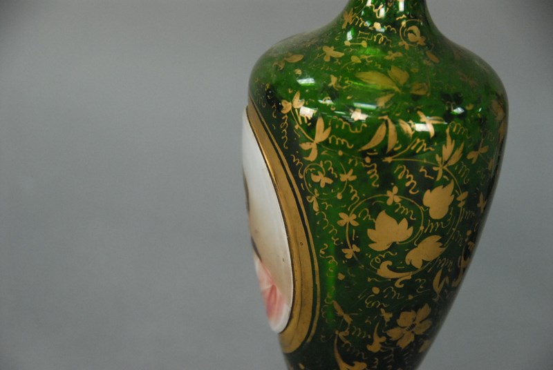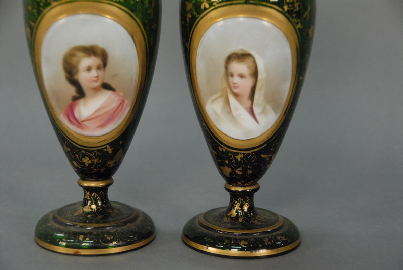 Lot 127: Pair of Moser enameled vases, green glass with overlay porcelain plaques with hand painted portraits of women. ht. 10in.