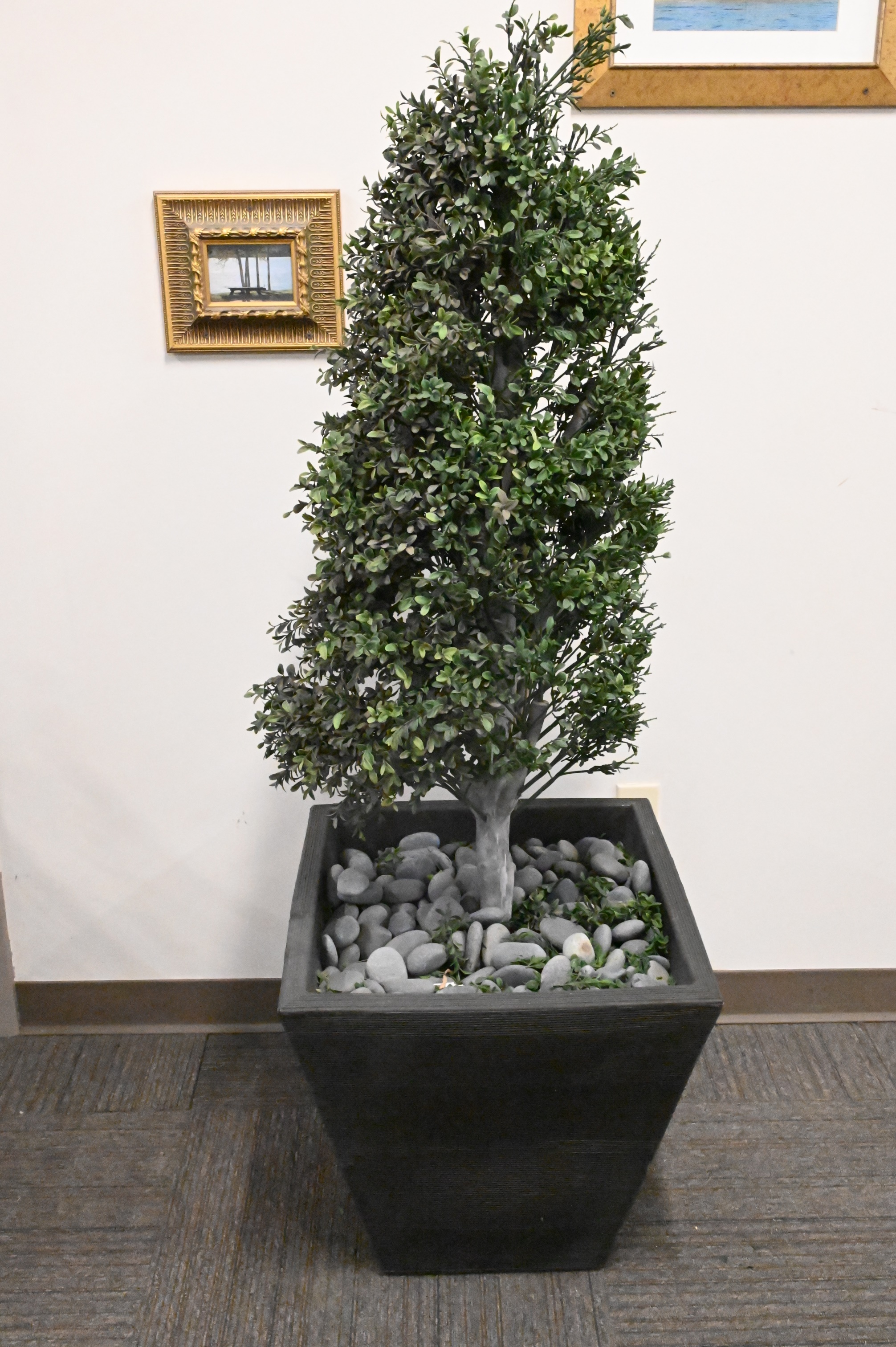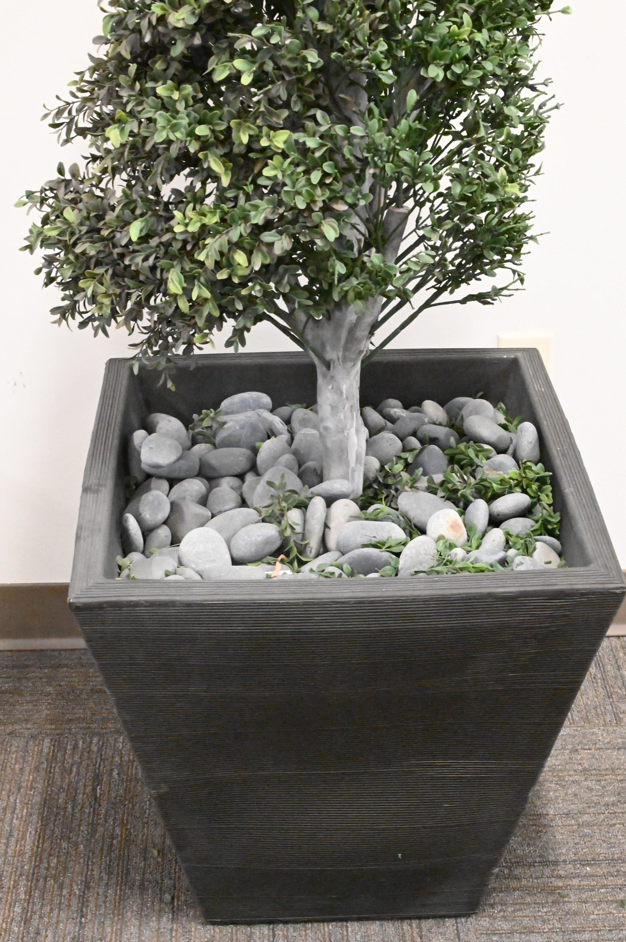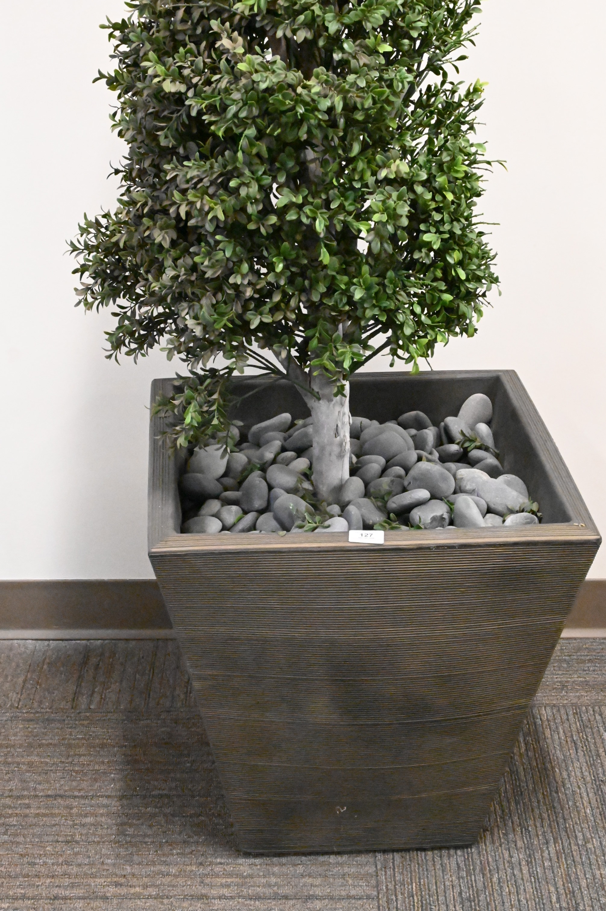 Pair of Outdoor Planters, each having stone filled base and faux topiary plant, topiary with minor losses, planter height 20 inches, width 20 inches.
