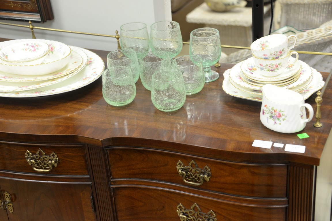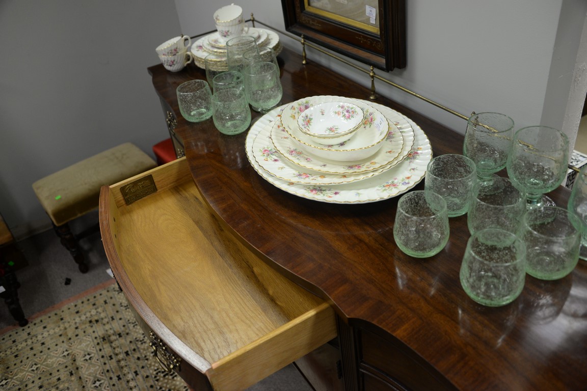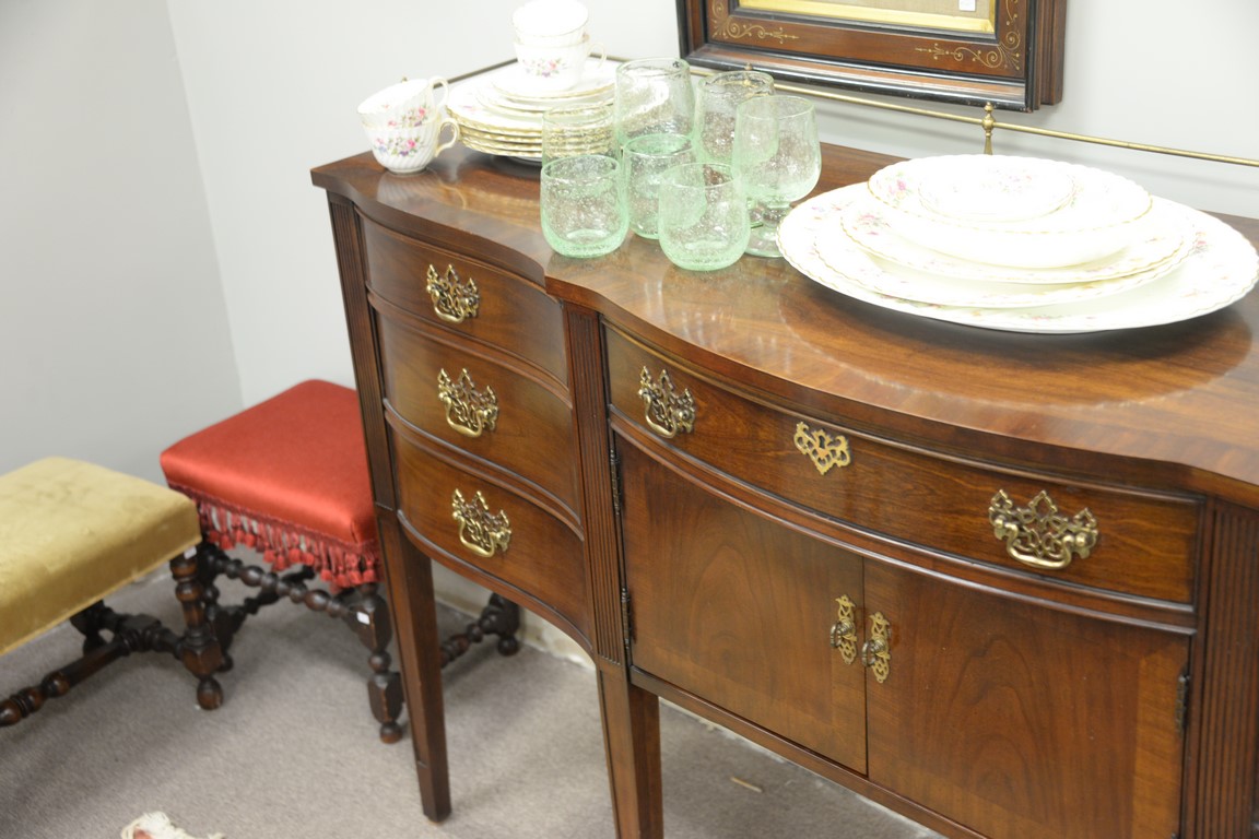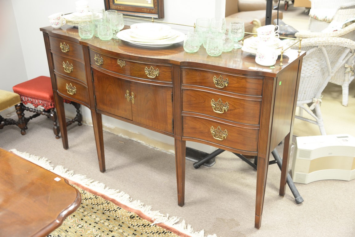 Lot 127: Peck and Hills mahogany sideboard, Federal style with brass gallery top, Peck & Hills New York label. ht. 37in., wd. 66in., dp. 21in.