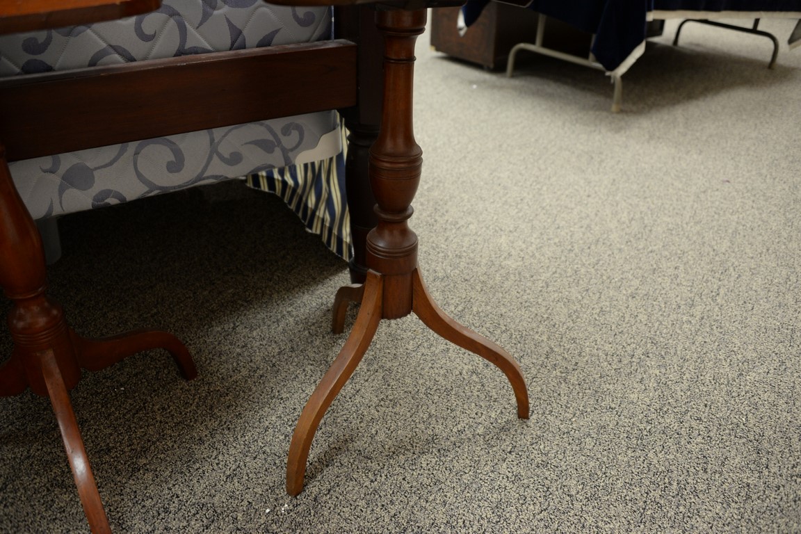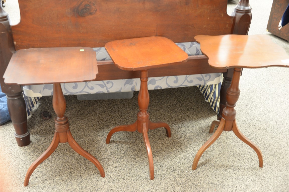 Three Federal cherry candlestands with shaped tops. ht. 27in., 28 1/2in., & 29 1/2in.