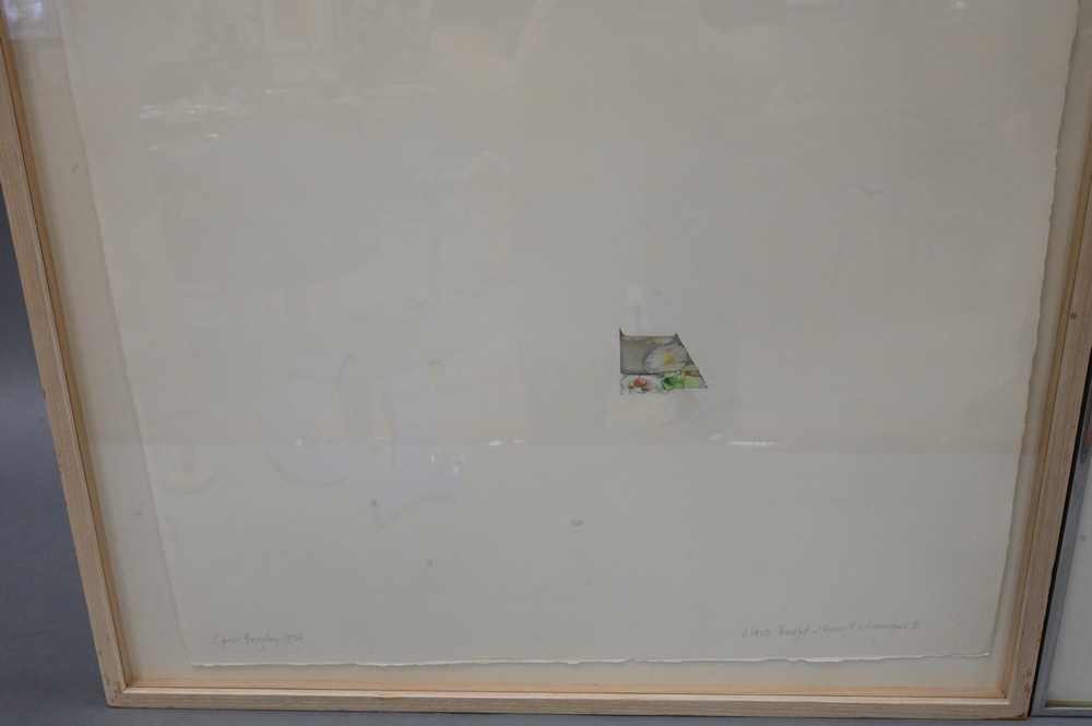 Three Piece Group, to include Enrique Castro-Cid (Chilean, 1937-1992), Twelve Dragonflies, 1973, lithograph with gouache on paper, signed, dated, and numbered A.P. #13 in pencil along the lower edge; Janez Bernik (Slovenian, 1933-2016), S65-79, etching in colors on paper, signed, titled, and numbered Eq 1 in pencil along the lower edge; and Jack Boynton (American, 1828-2010), Start, 1974, lithograph with hand coloring and colored pencil, signed, titled and numbered AP 23 in pencil along the lower edge, largest in size 23″ x 31″.
