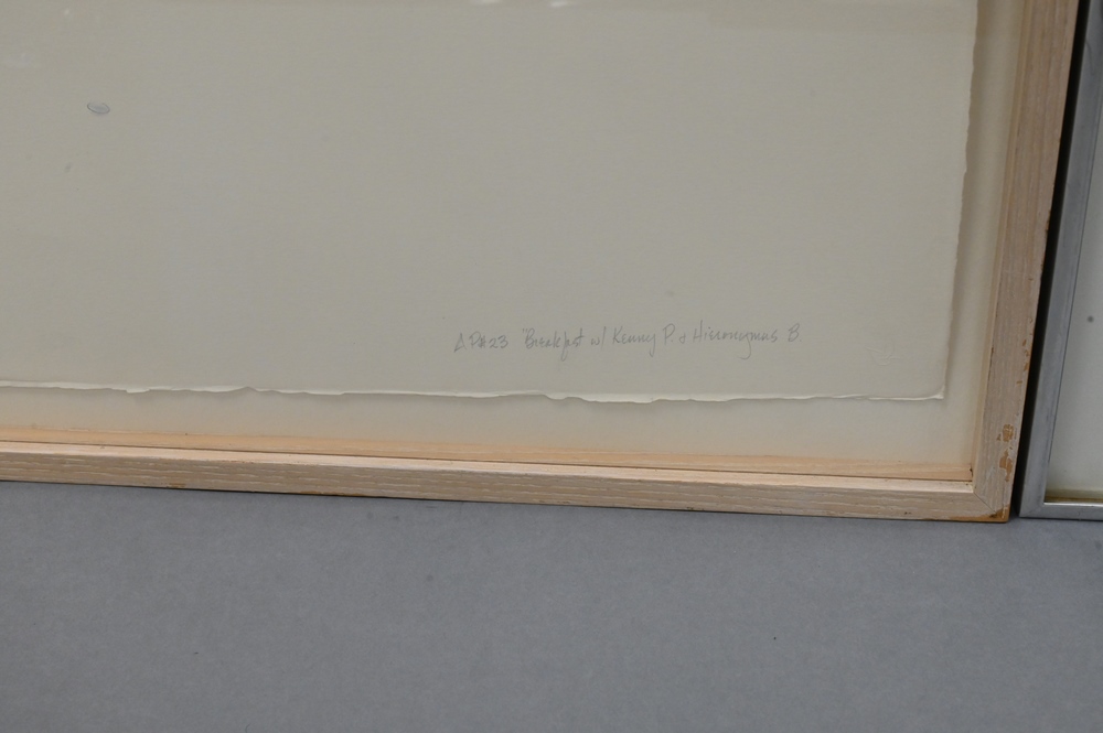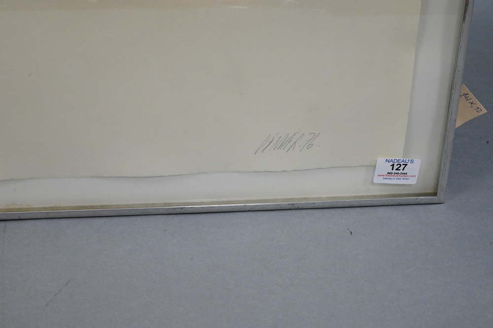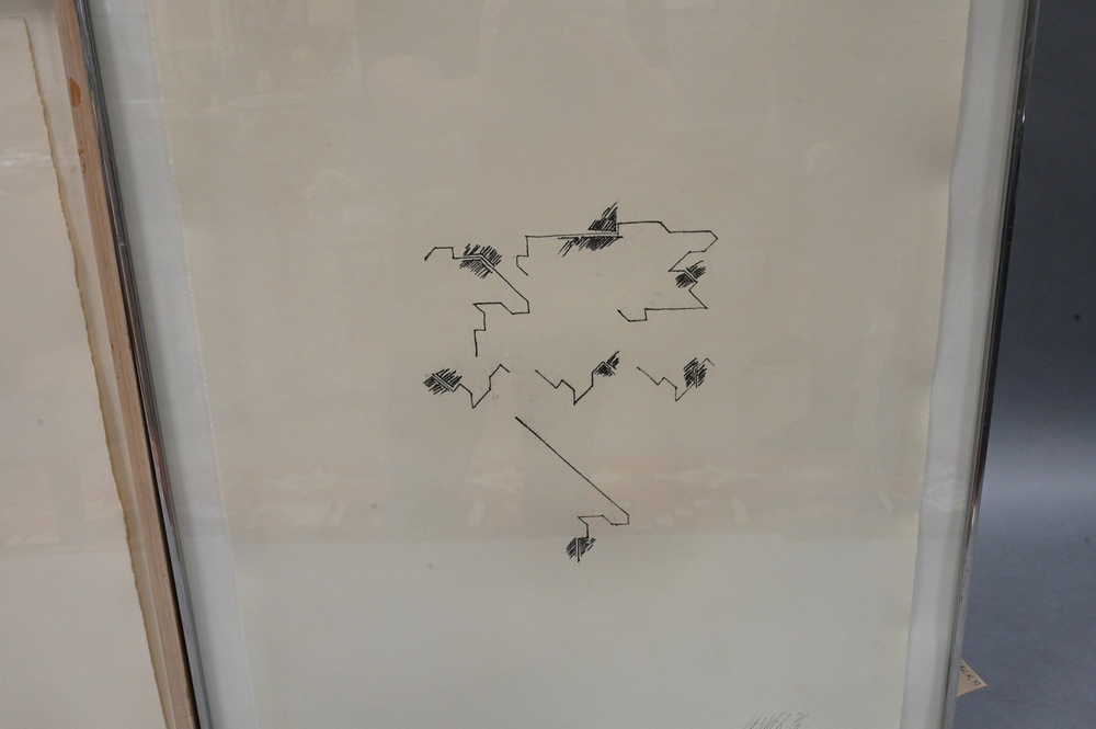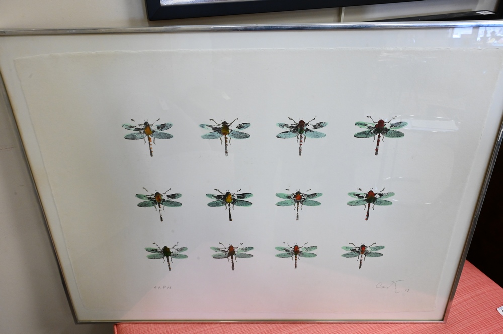 Lot 127: Three Piece Group, to include Enrique Castro-Cid (Chilean, 1937-1992), Twelve Dragonflies, 1973, lithograph with gouache on paper, signed, dated, and numbered A.P. #13 in pencil along the lower edge; Janez Bernik (Slovenian, 1933-2016), S65-79, etching in colors on paper, signed, titled, and numbered Eq 1 in pencil along the lower edge; and Jack Boynton (American, 1828-2010), Start, 1974, lithograph with hand coloring and colored pencil, signed, titled and numbered AP 23 in pencil along the lower edge, largest in size 23″ x 31″.