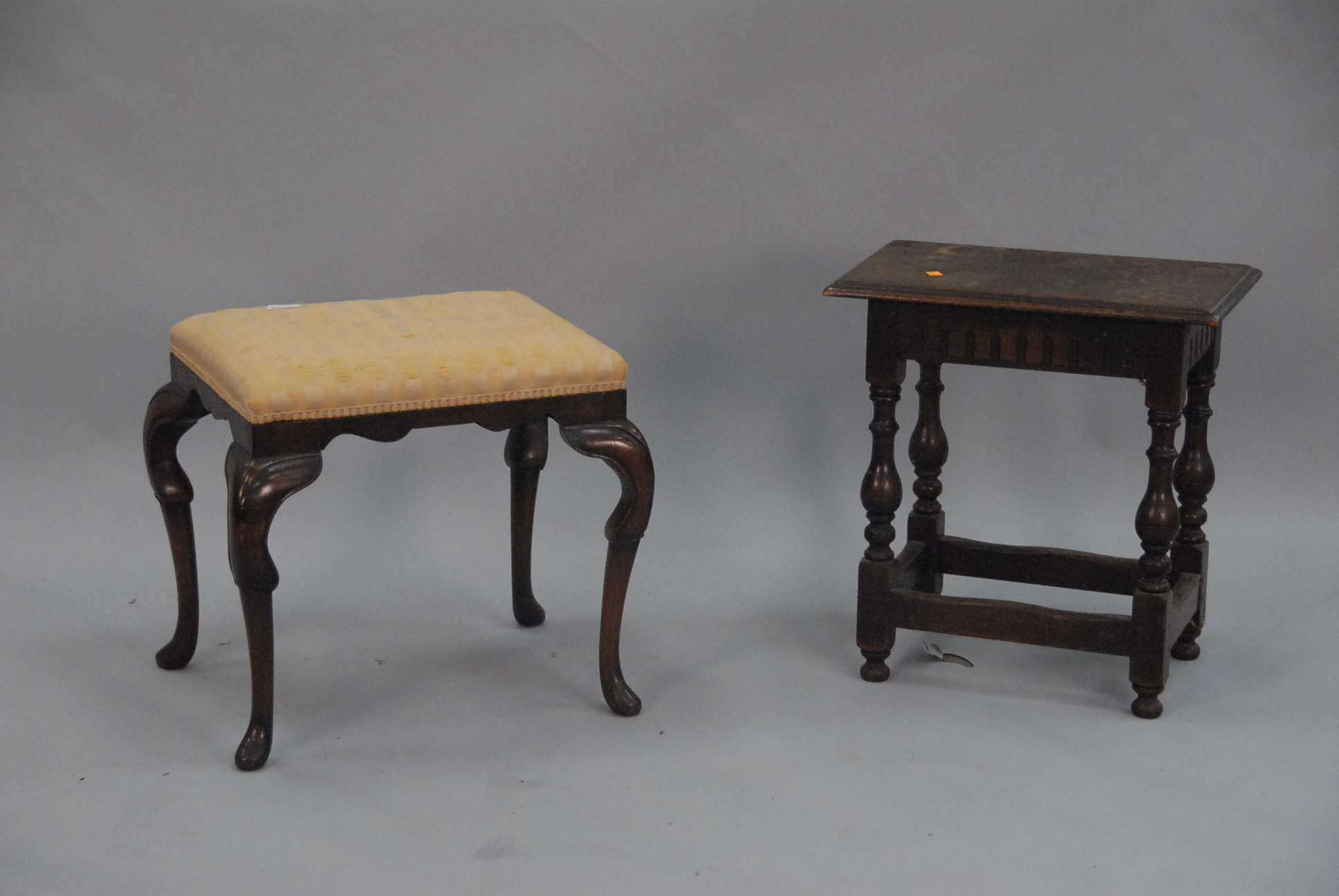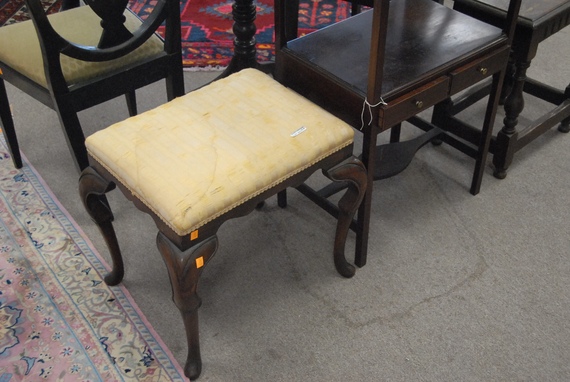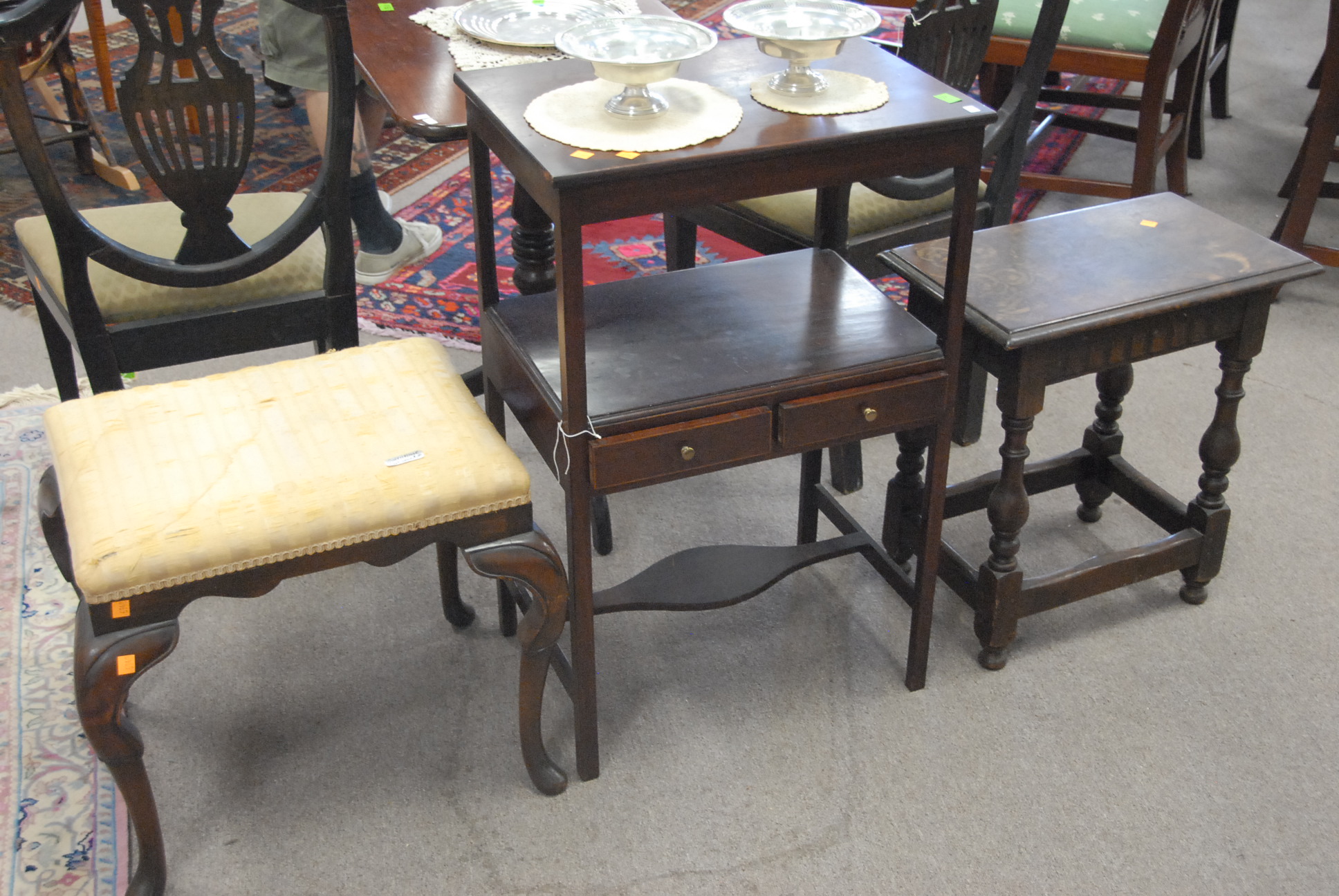 Lot 127: Three piece lot to include Federal mahogany stand with two drawers, Queen Anne style bench, and reproduction small stand.