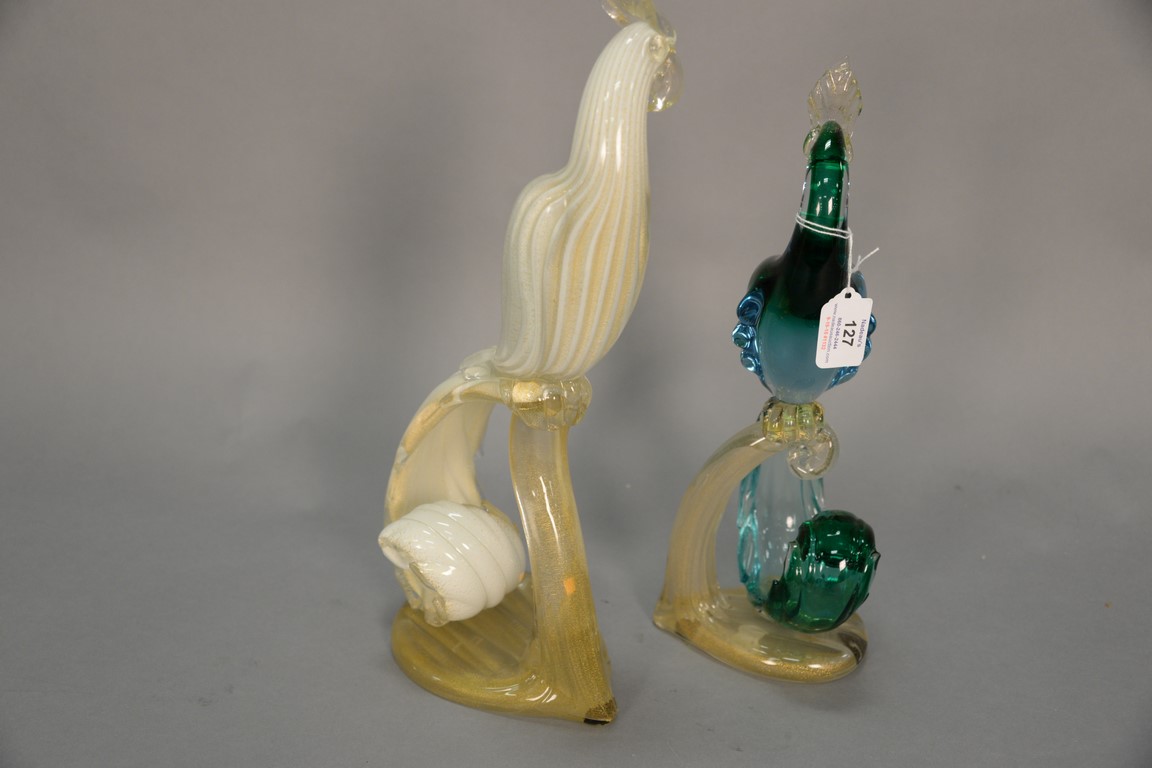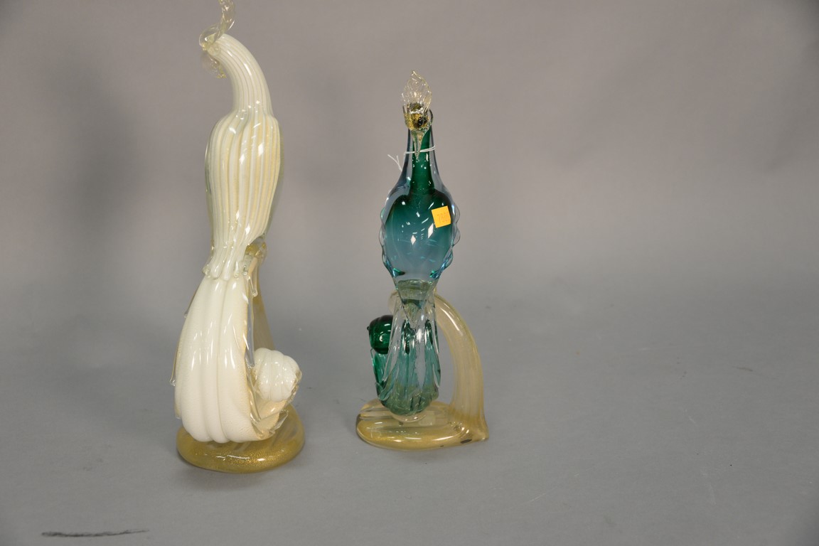 Lot 127: Two large Murano art glass birds of paradise, one greenish blue with gold base and the other white with gold. ht. 14 in. & 16 in.