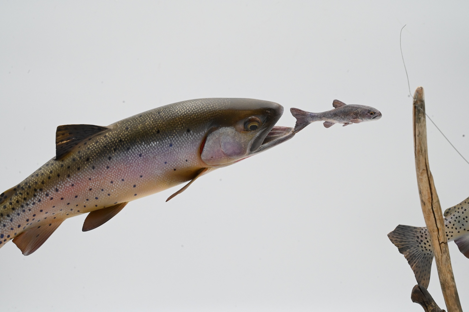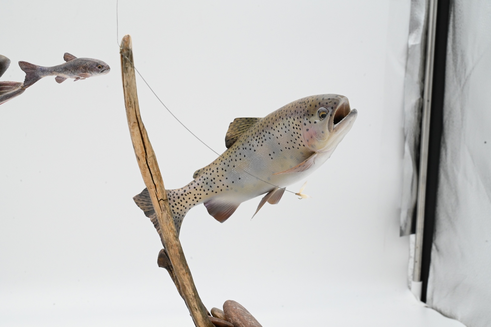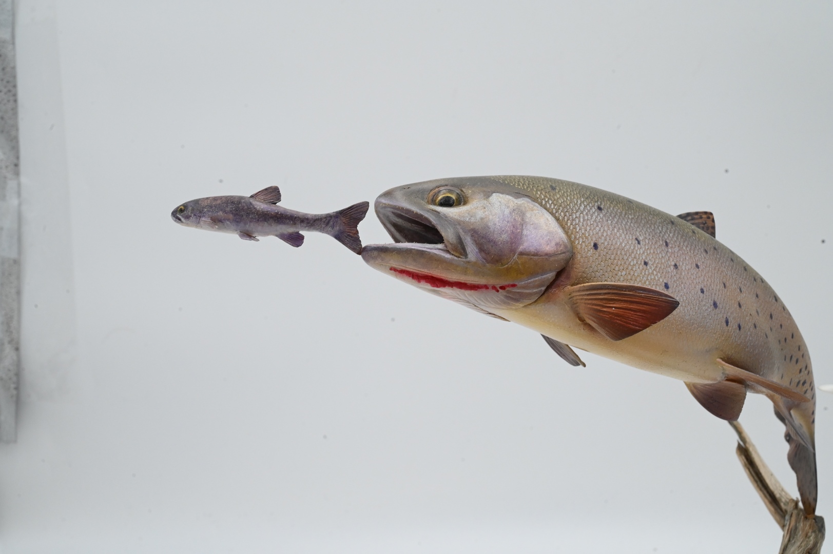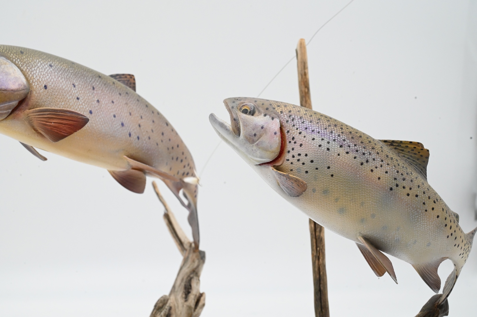 Two Luna Hymas-Smith Carved Fish Sculptures, Future Keeper Rainbow Trout, (chip on tail), $2,500 new, height 13 1/2 inches; along with Minnow Ette Yellowstone Cutthroat Trout, $3,250 new, height 14 inches. Provenance: Estate of Peter Tillou, Litchfield, Connecticut.