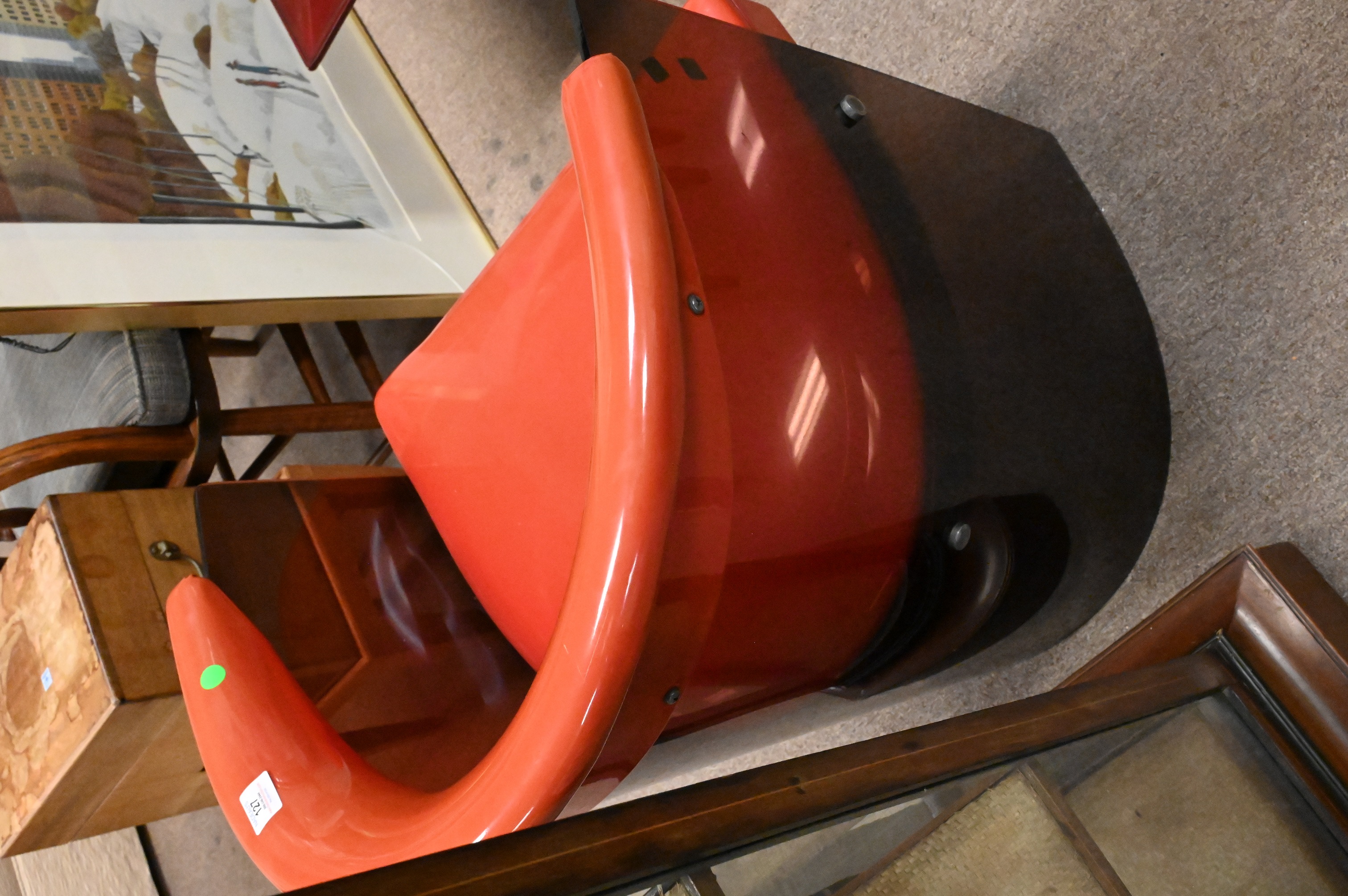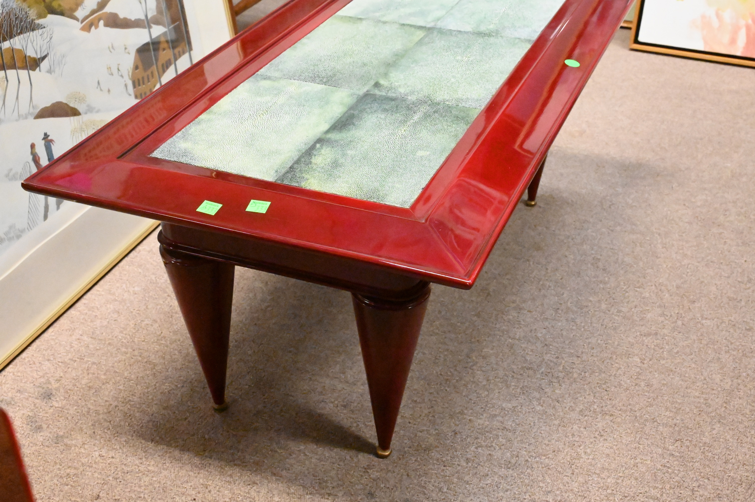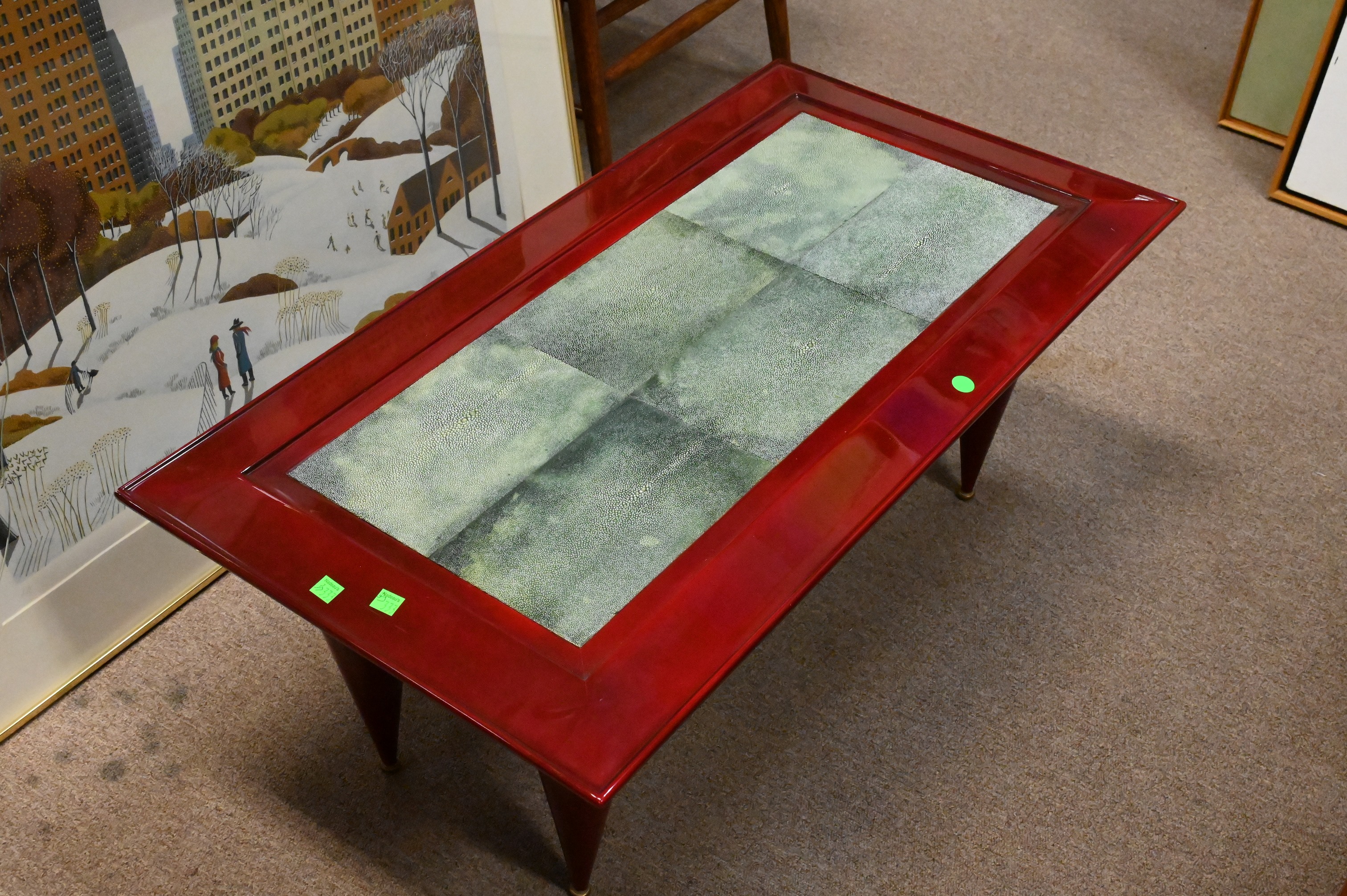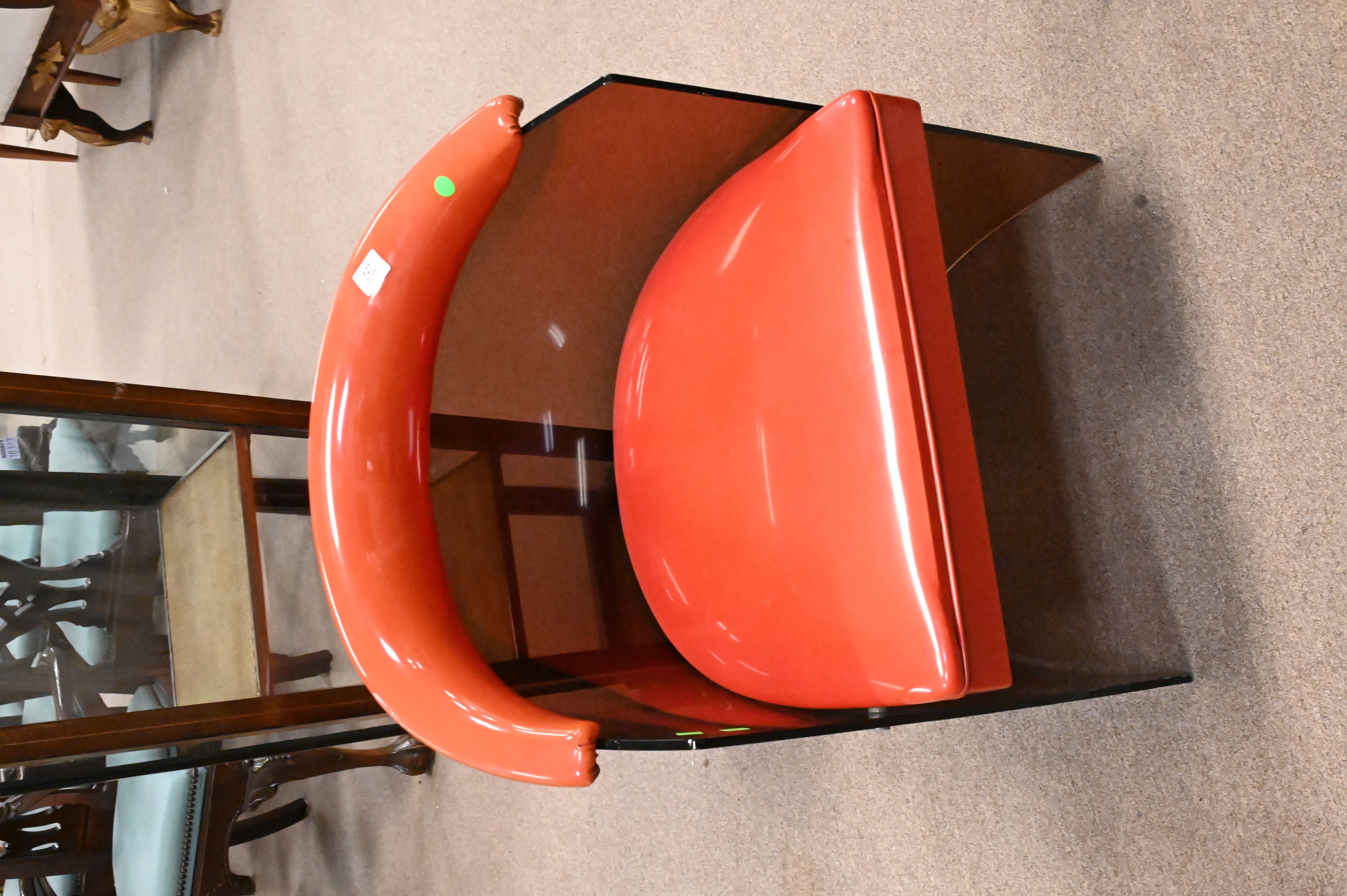to include red lacquer coffee table having faux shagreen top and orange lucite barrel chair