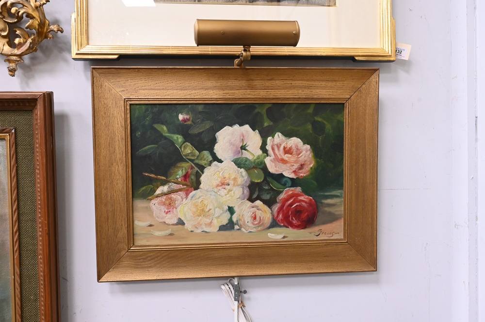 Lot 128: Abbott Fuller Graves (1859 – 1936), roses, oil on board, signed lower right Graves, 12″ x 18″.