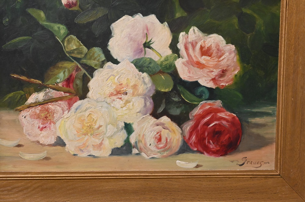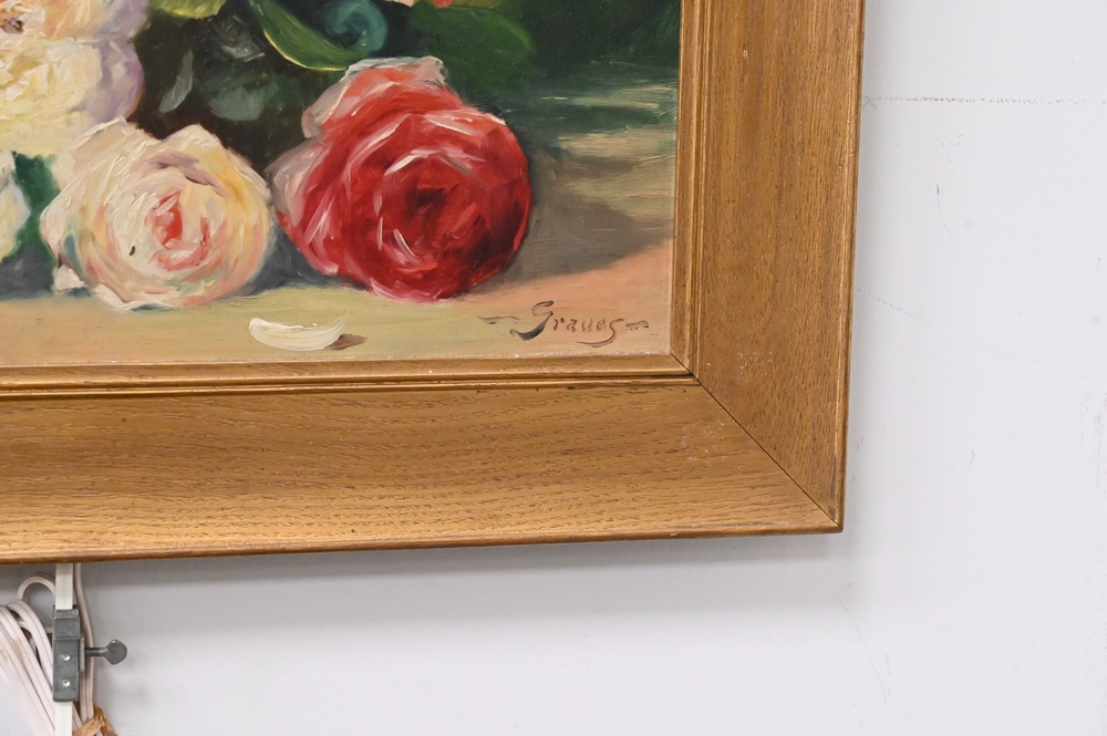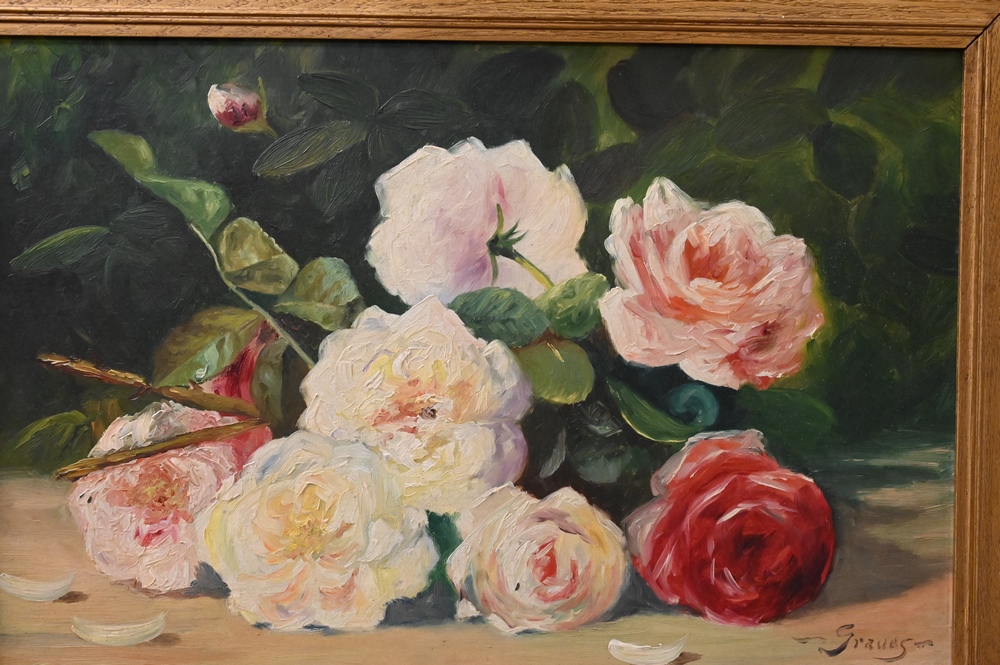Abbott Fuller Graves (1859 – 1936), roses, oil on board, signed lower right Graves, 12″ x 18″.