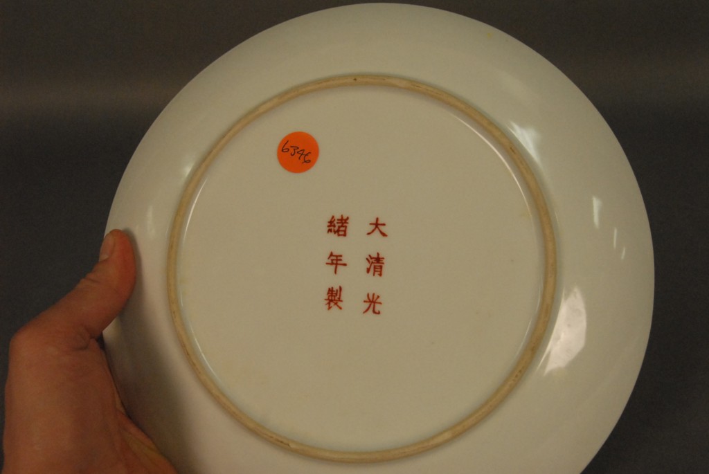 Lot 128: Famille Rose yellow ground plate, republic period, interior decorated with scrolling flowers and medallions of auspicious character,…