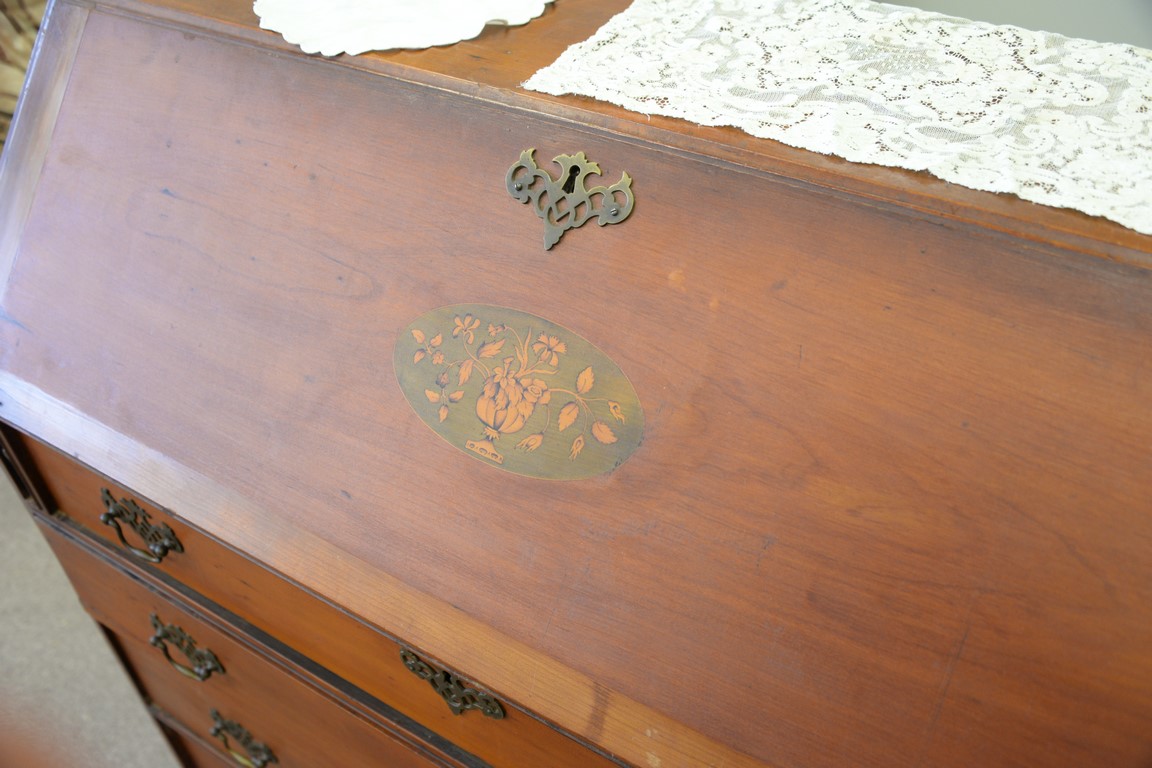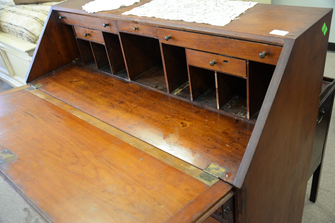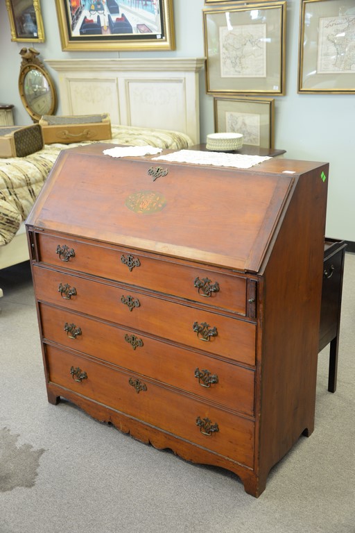 Lot 128: Federal cherry slant front desk with oval inlaid panel feet reduced, circa 1800. ht. 44 1/4in., wd. 43 1/2in., dp. 18 3/4in.
