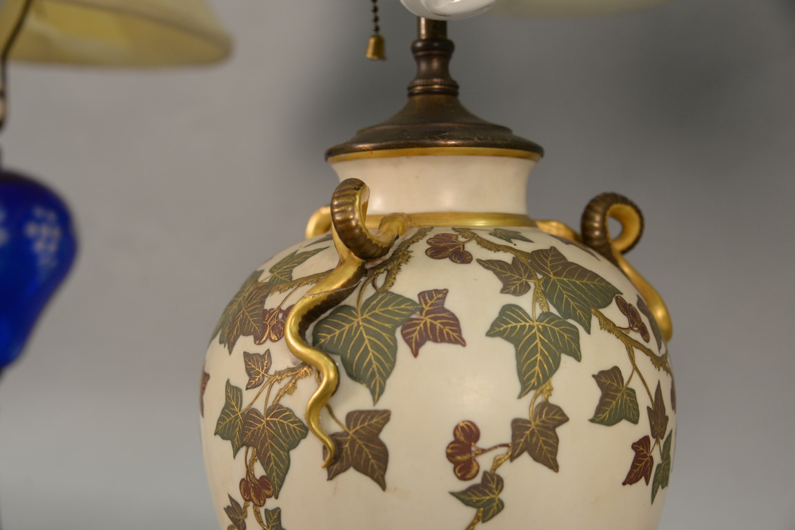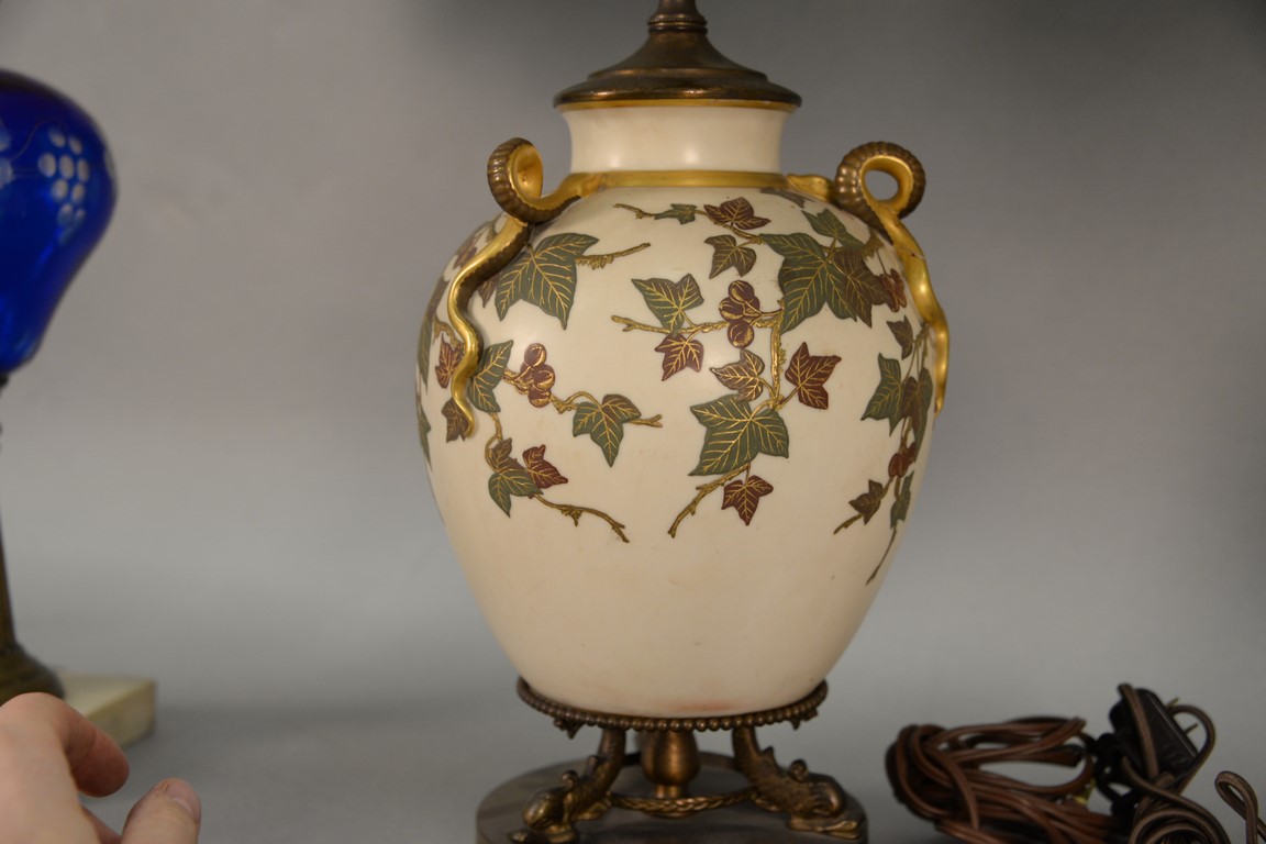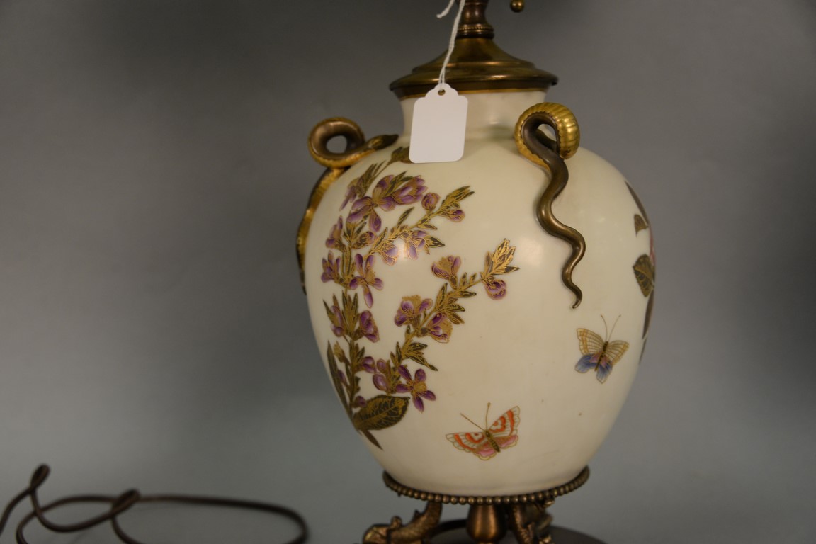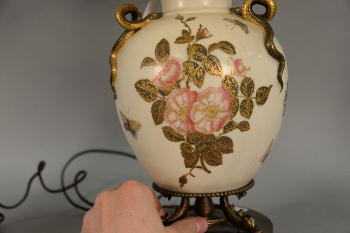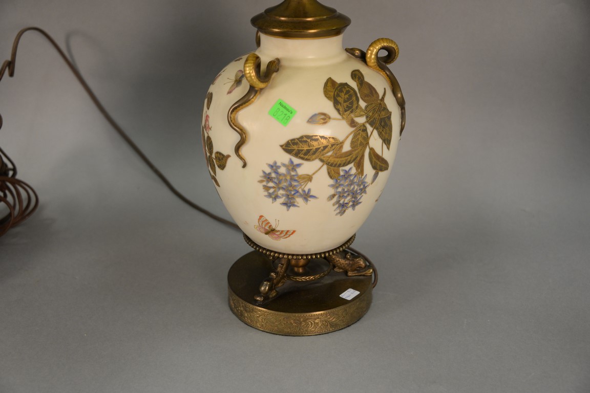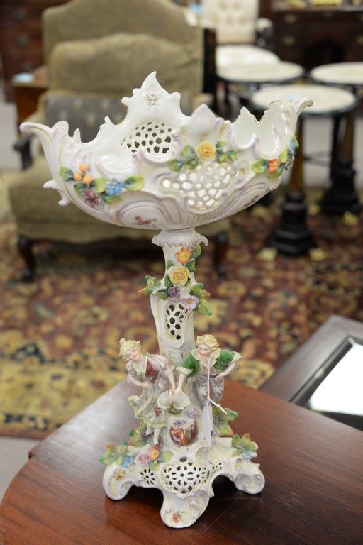 Lot 128: Five piece group, four table lamps including pair of snake lamps and a porcelain figural compote repaired. compote ht. 19in.