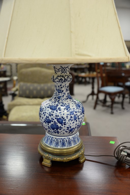 Five piece group, four table lamps including pair of snake lamps and a porcelain figural compote repaired. compote ht. 19in.