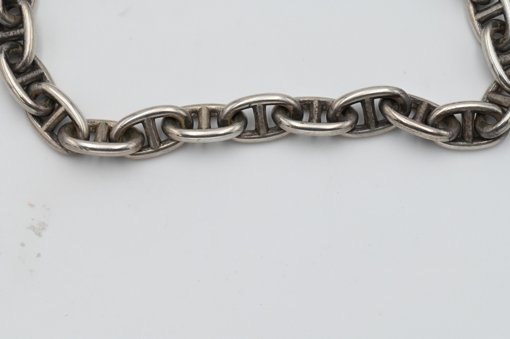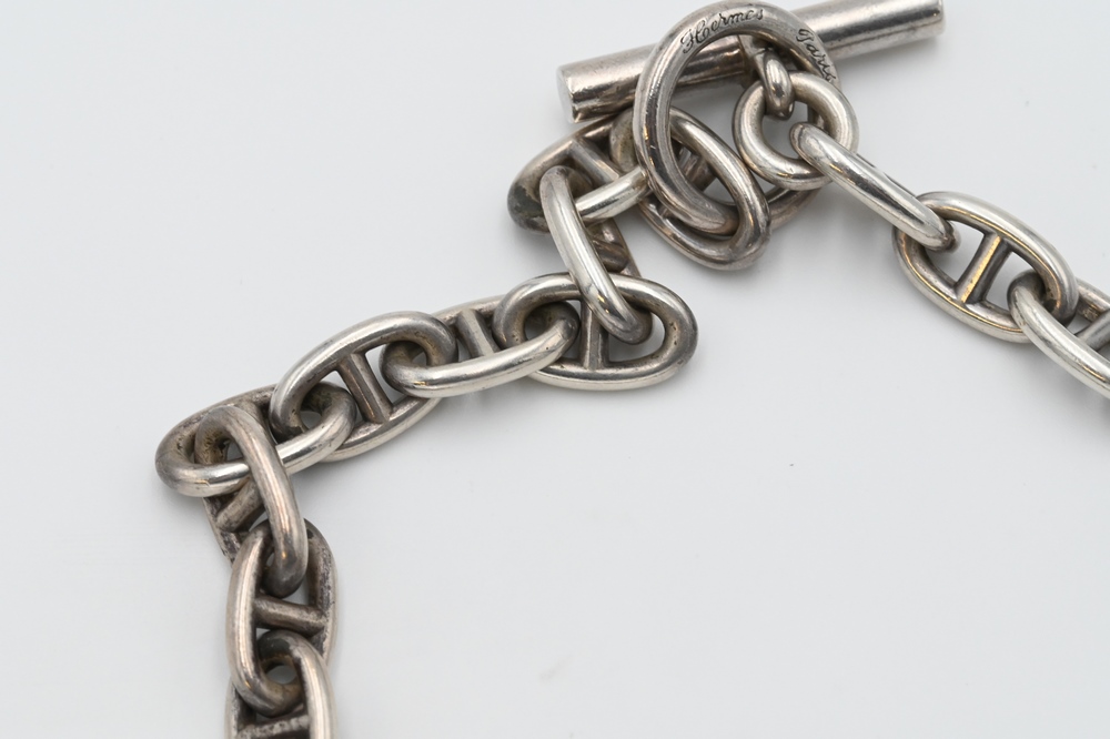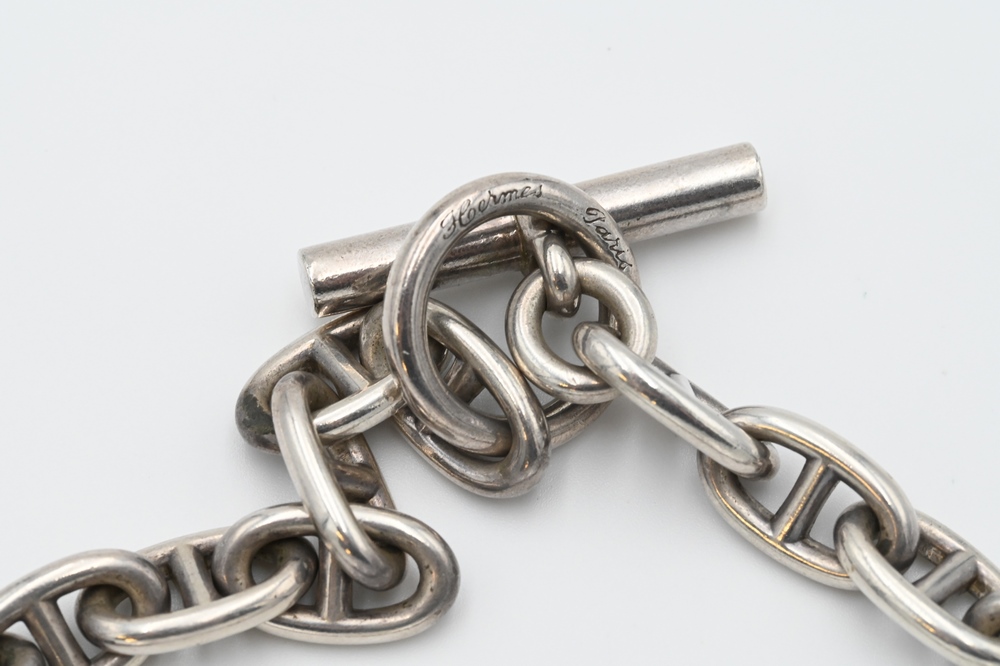 Lot 128: Hermes Sterling Silver Necklace, having t-bar, marked HERMES, Paris, length 16 1/2 inches, 4.9 t. oz.