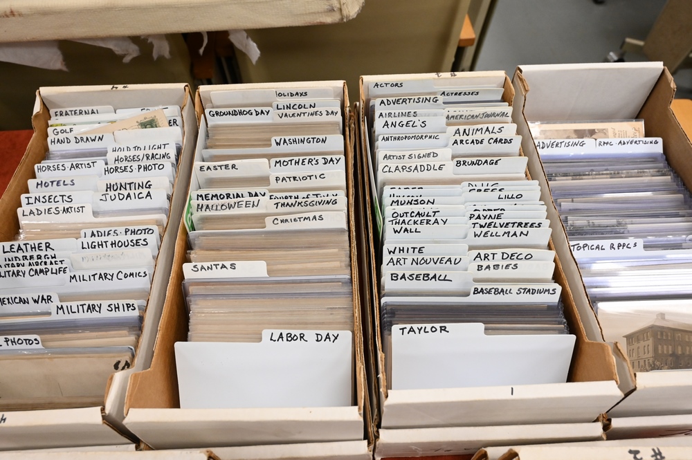 Large Lot of Postcards, in labeled boxes, topics including baseball, fairs and expos, military, etc.