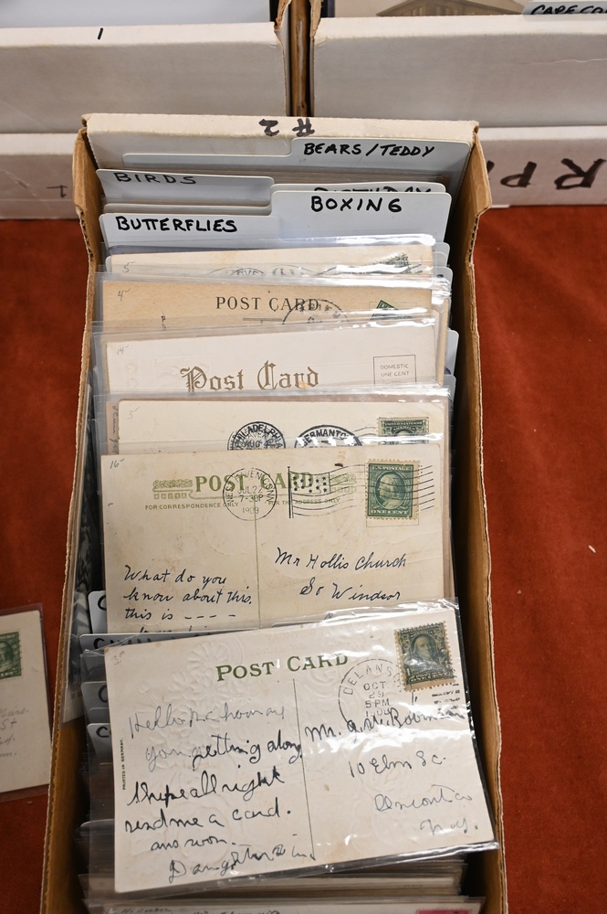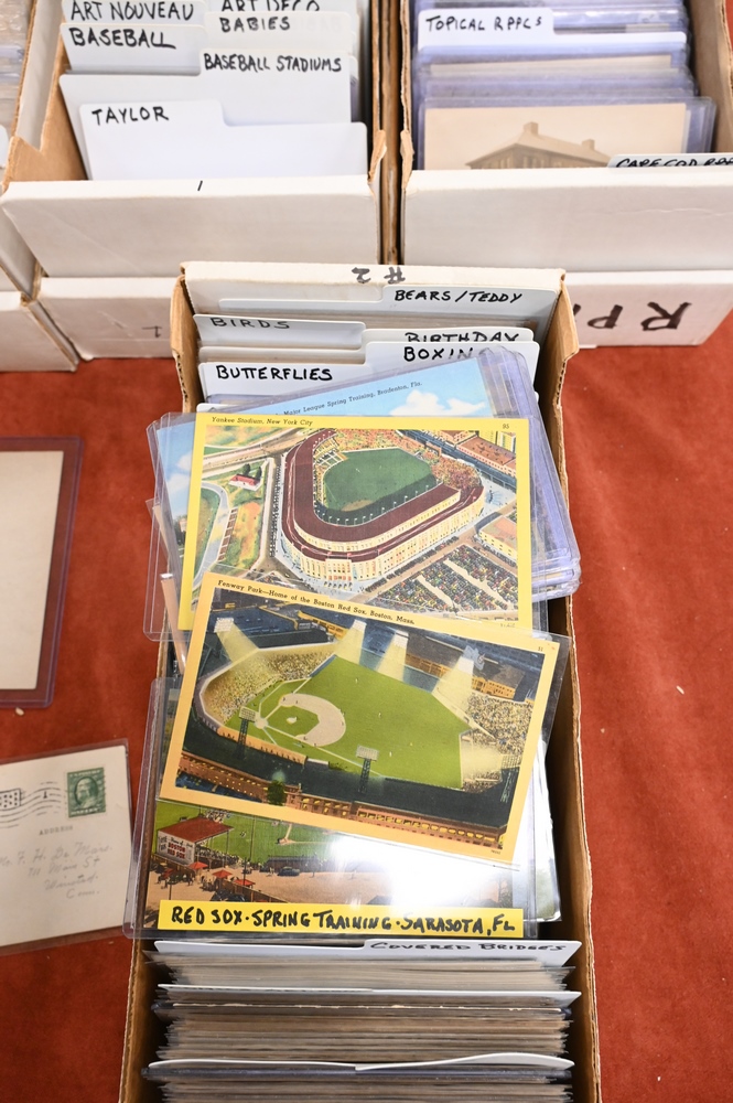Lot 128: Large Lot of Postcards, in labeled boxes, topics including baseball, fairs and expos, military, etc.