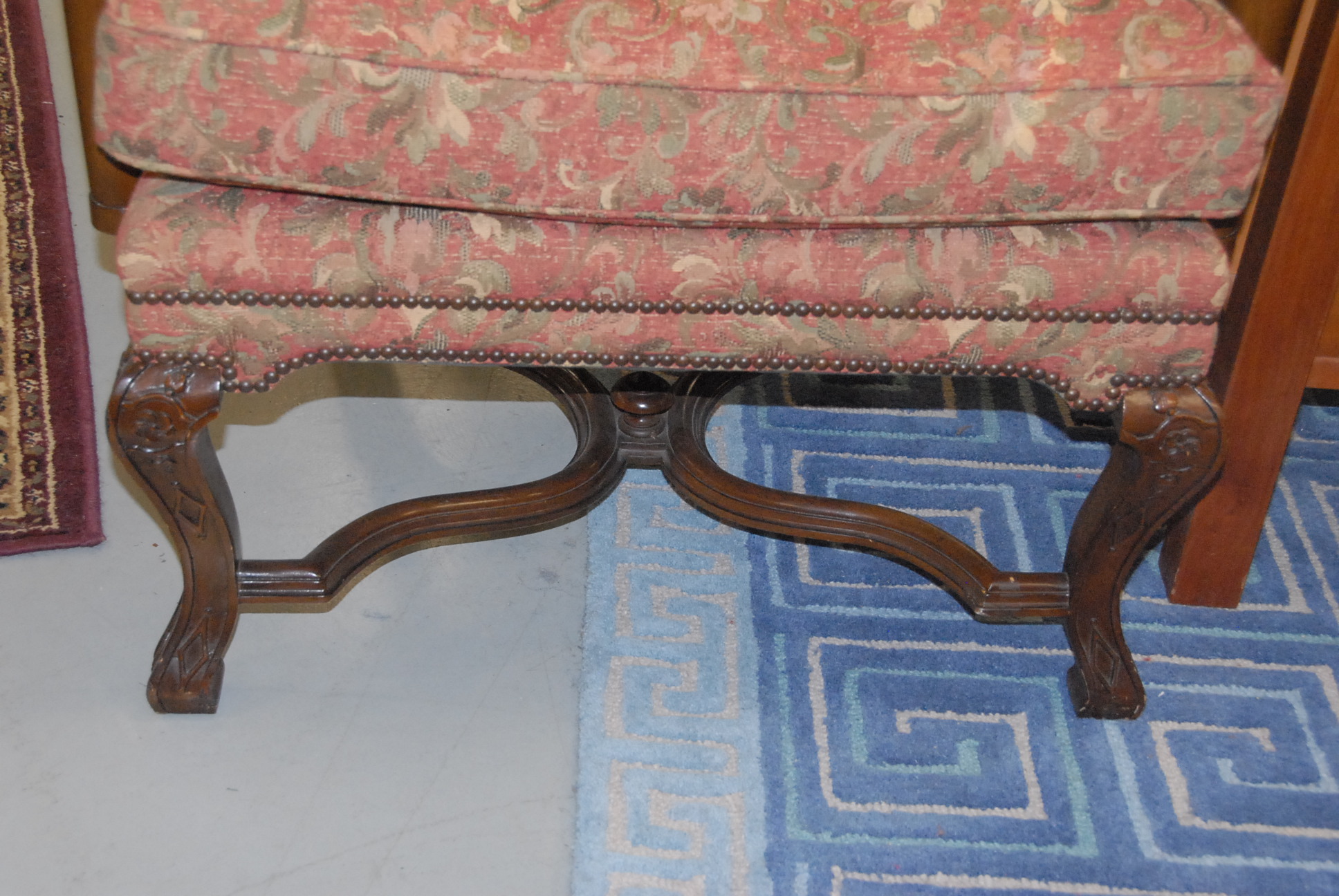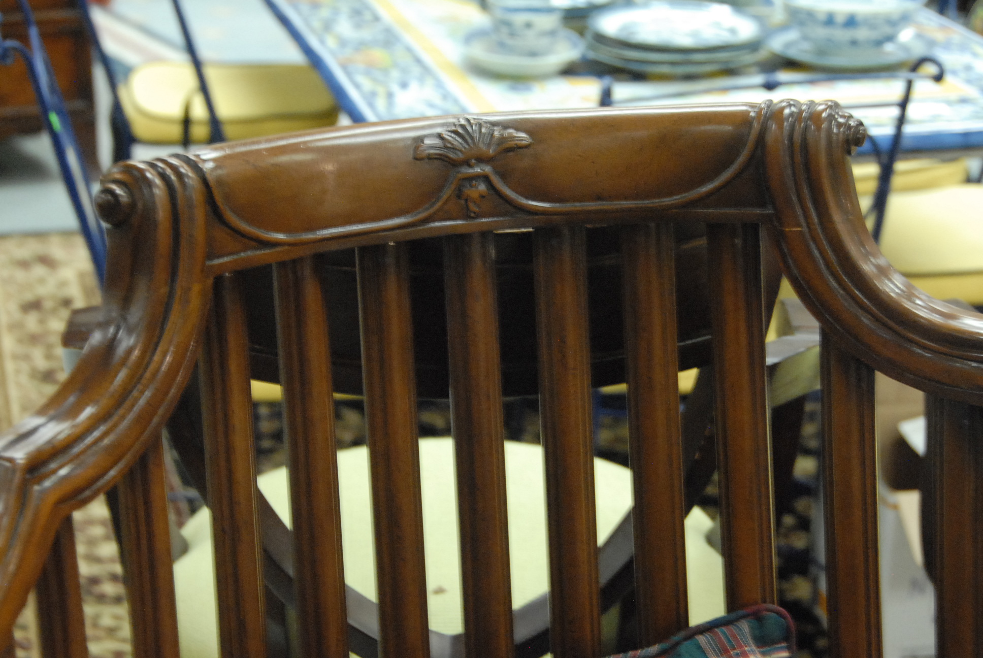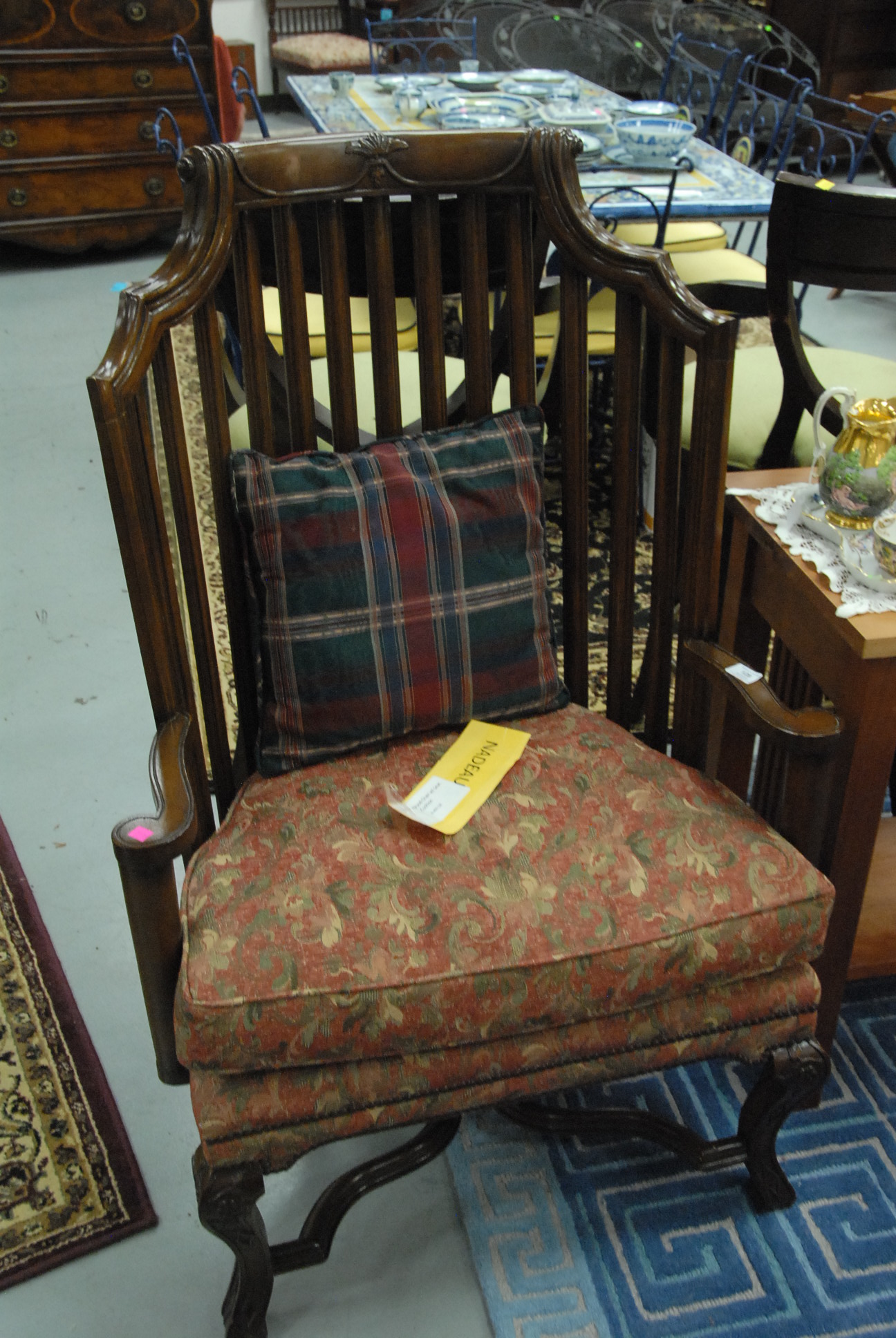 New Baker Furniture occasional chair with slat back and tapestry type upholstered seat.