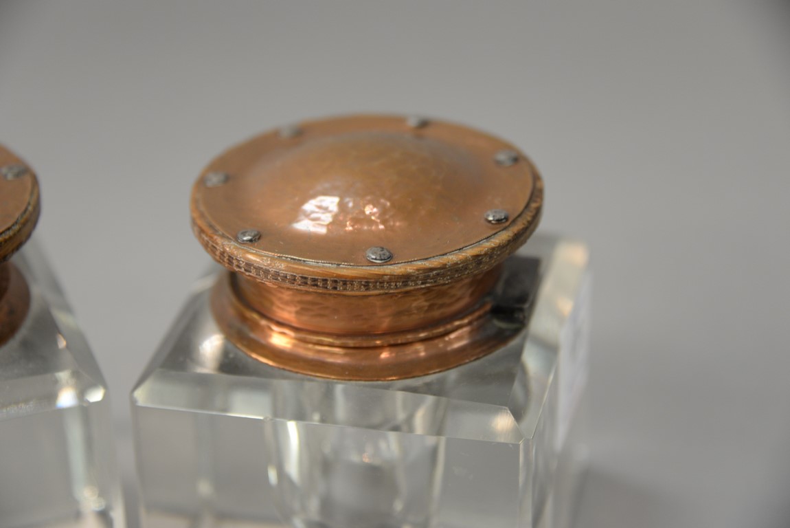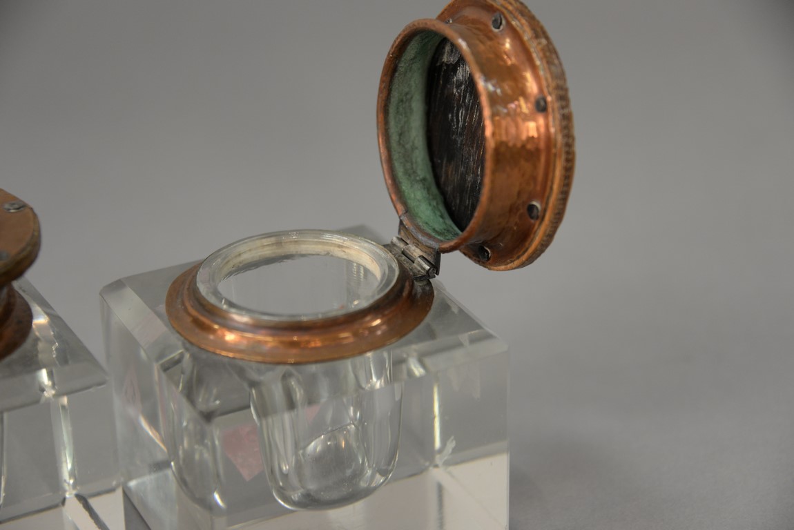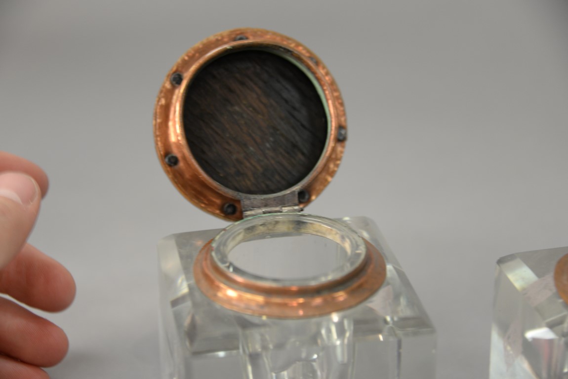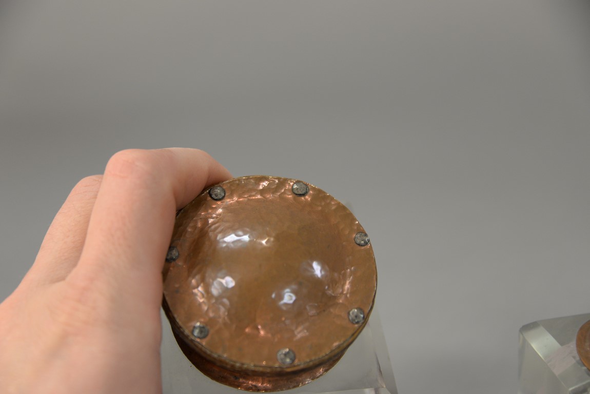 Lot 128: Pair of crystal inkwells, each with hand hammered copper hinged tops. ht. 3 5/8 in.
