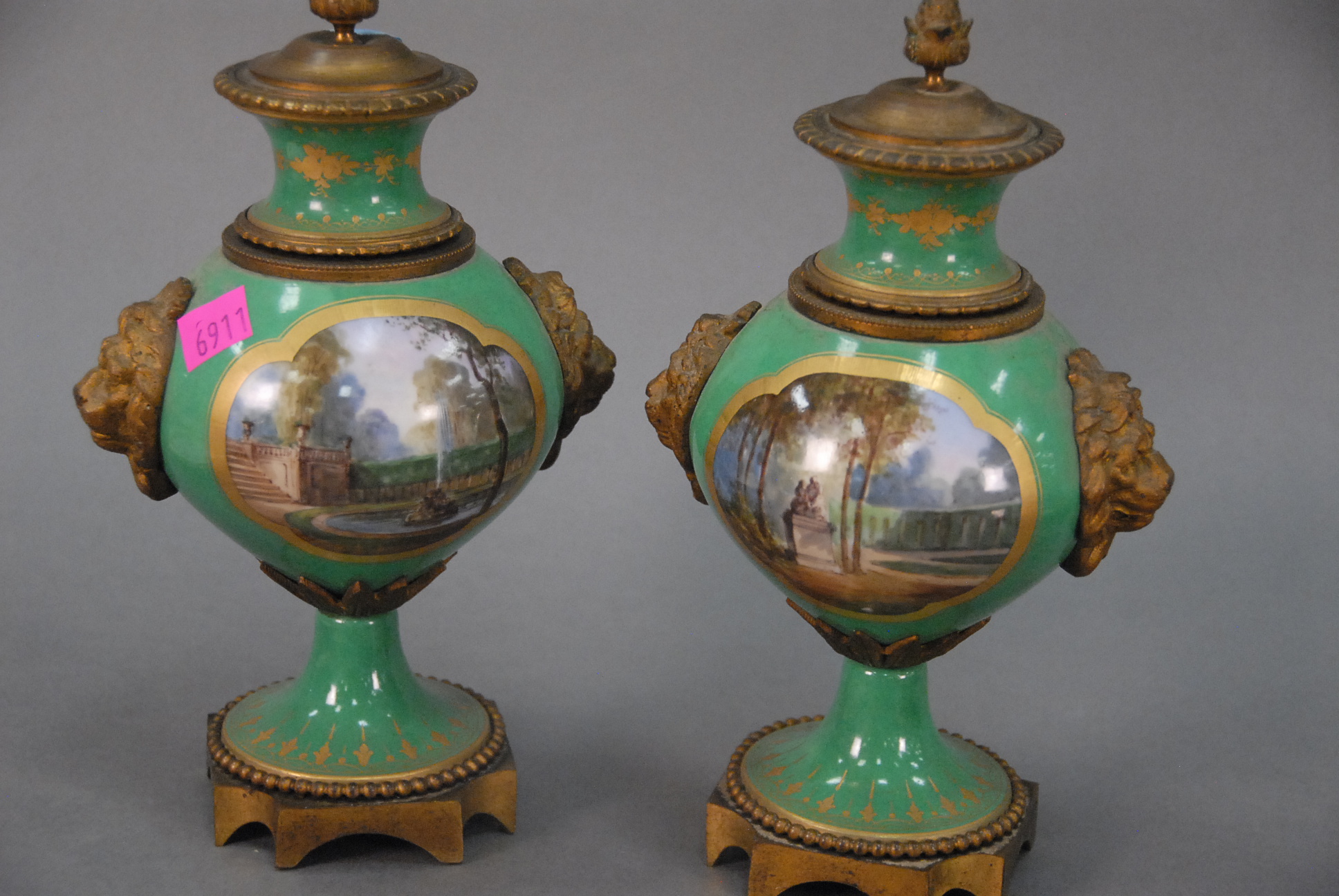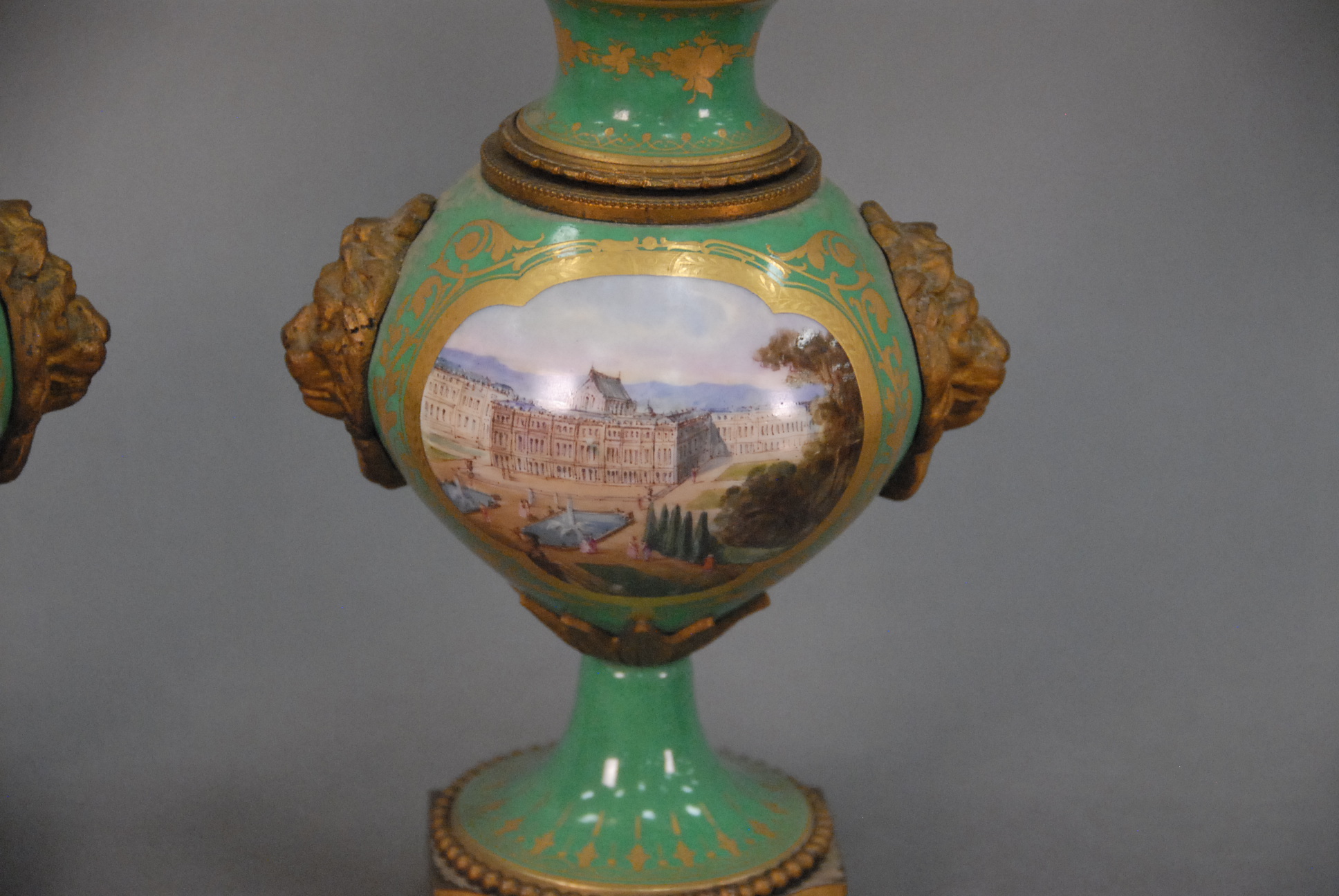 Pair of French porcelain urns metal mounted with hand painted scenes.