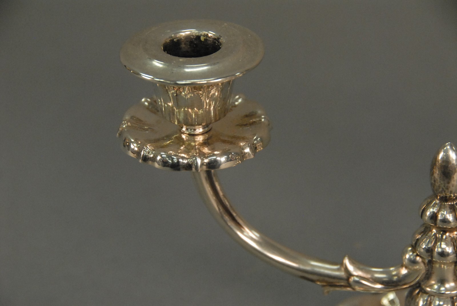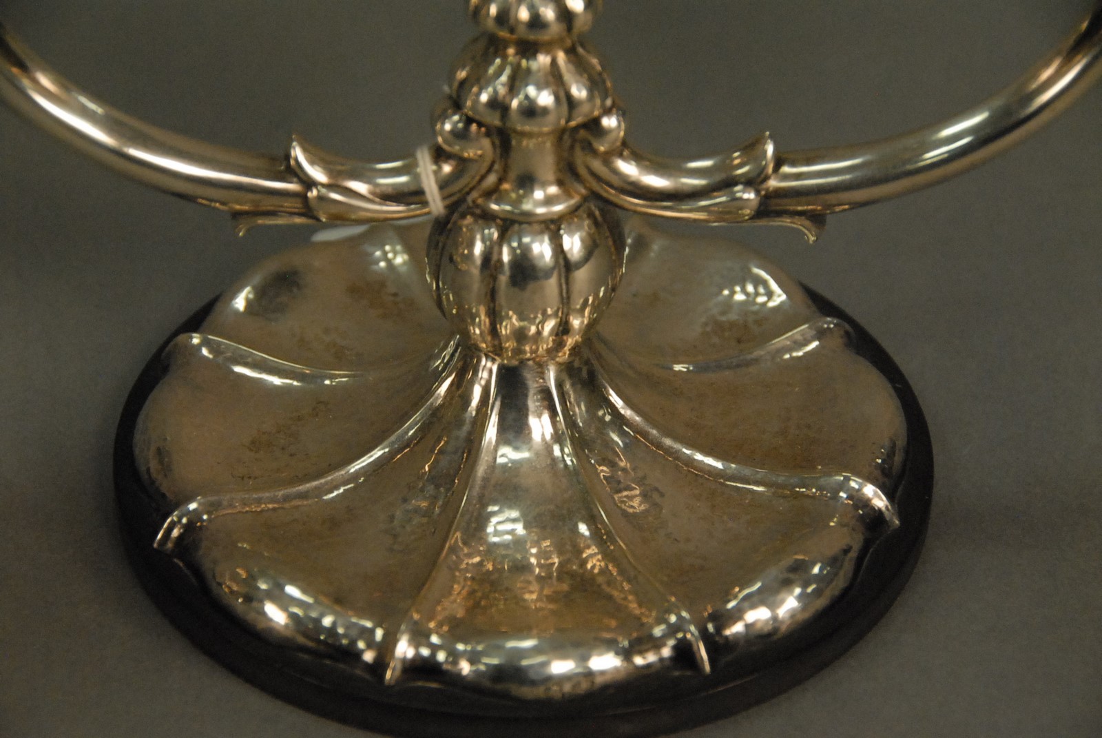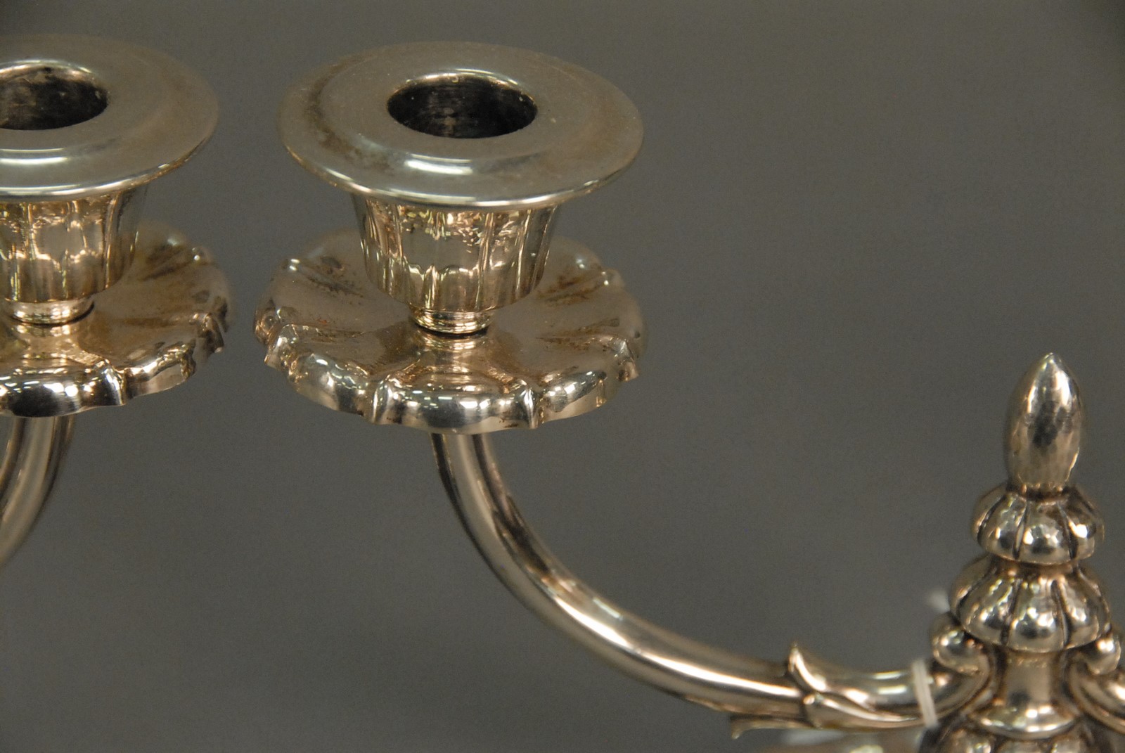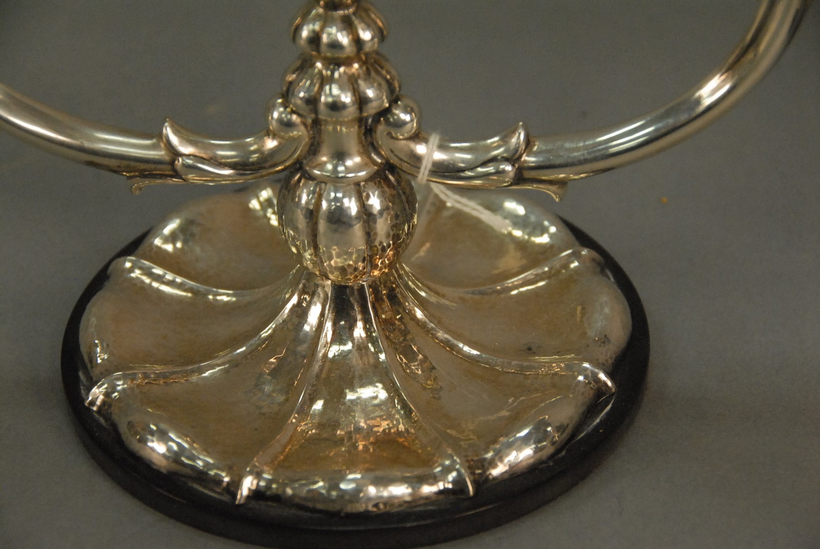 Lot 128: Pair of Montano Torino hand hammered silver two light candlesticks on weighted base. ht. 5 3/4 in. lg. 9 in.