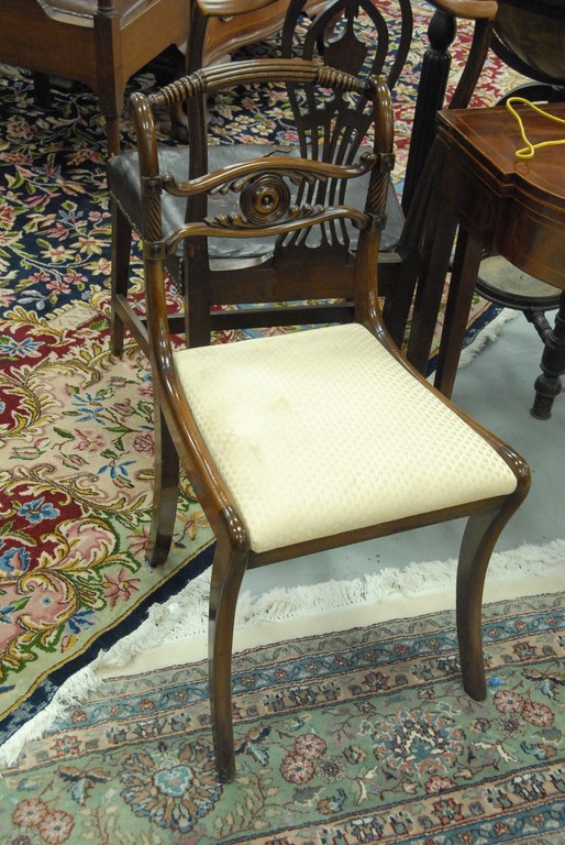 Lot 128: Set of ten George IV mahogany side chairs with carved backs and slip seats, all set on saber legs repairs.