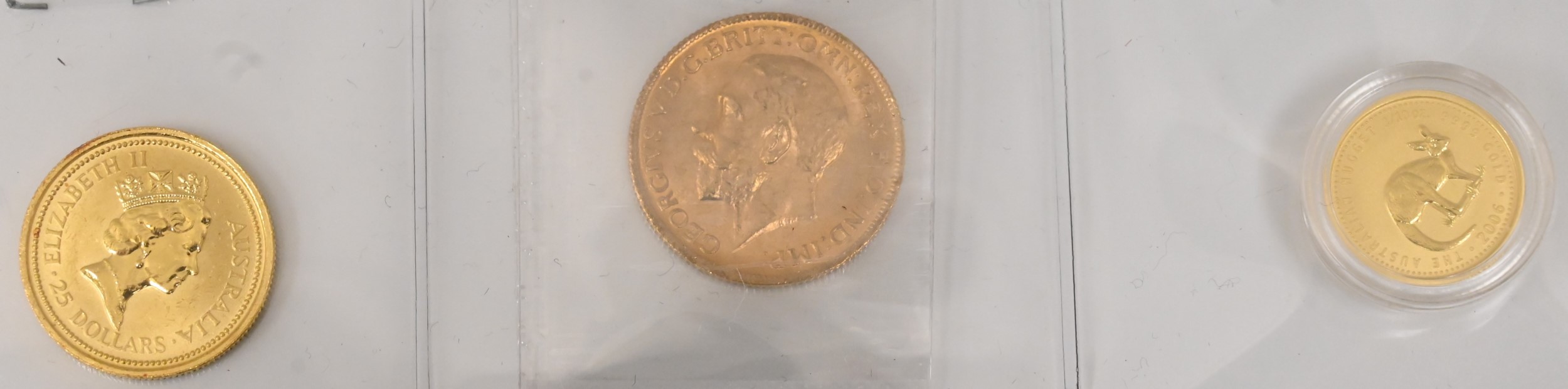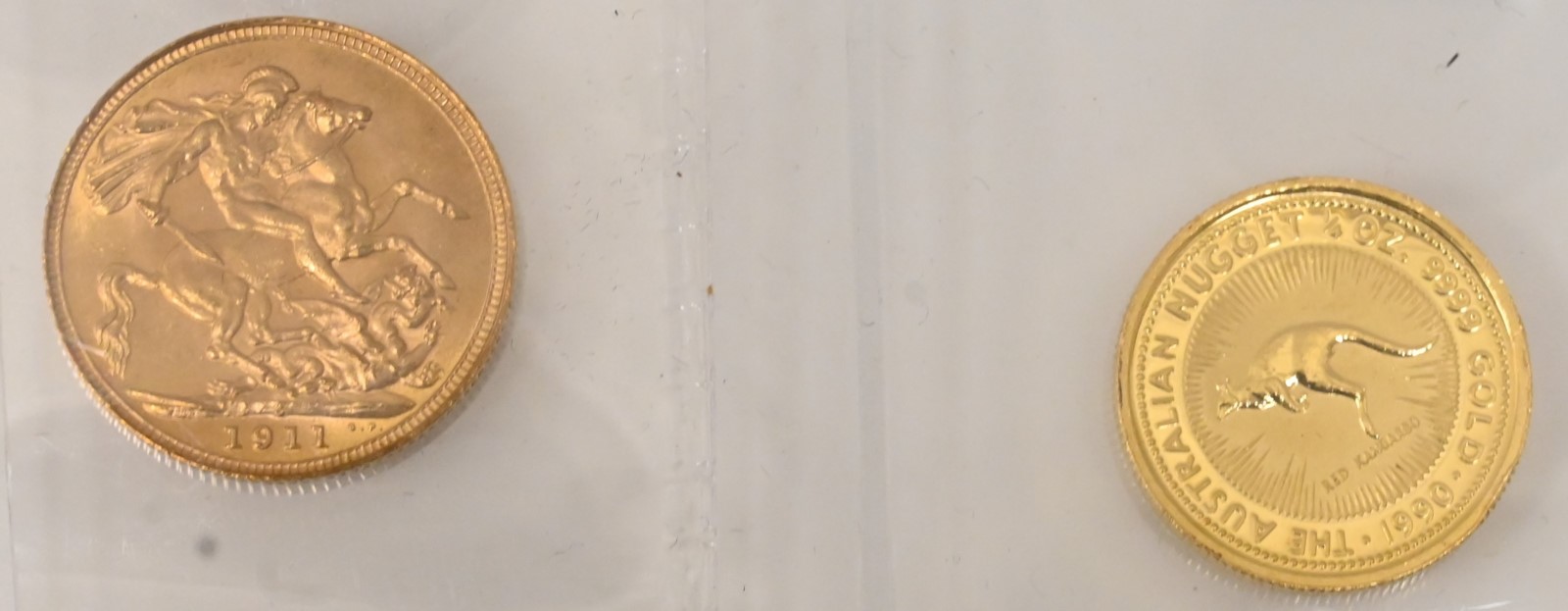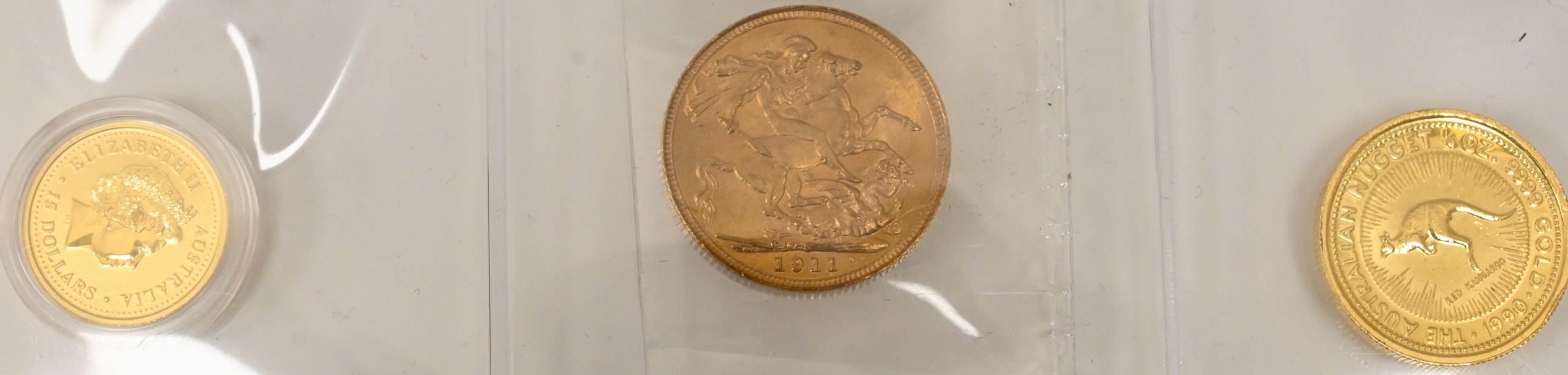 Six Gold Foreign Coins, to include 2005 australian $15 1/10 ounce, 1989 Australian $25 ¼ ounce, 1911-S Sovereign .2354 ounce, 2006 Australian $15 1/10 ounce, 1989 Australian $15 1/10 ounce and 2004 Australian $15 1/10 ounce.