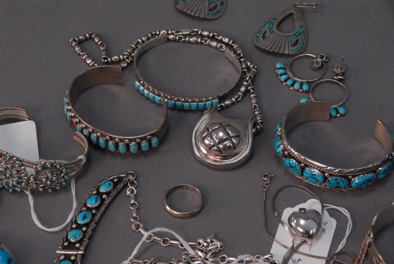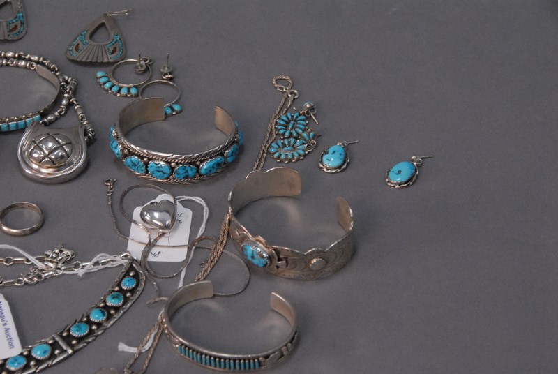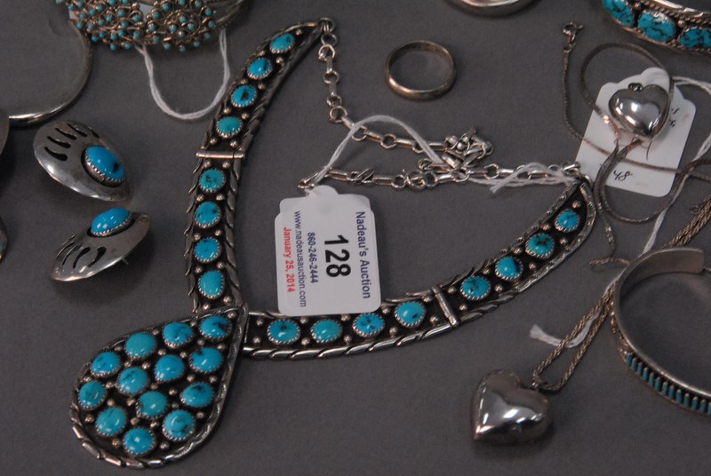 Lot 128: Sterling and turqouis group to include three necklaces, seven bracelets, six pairs of earrings, and a ring.