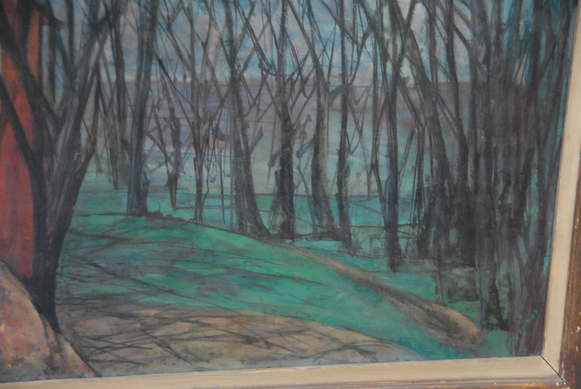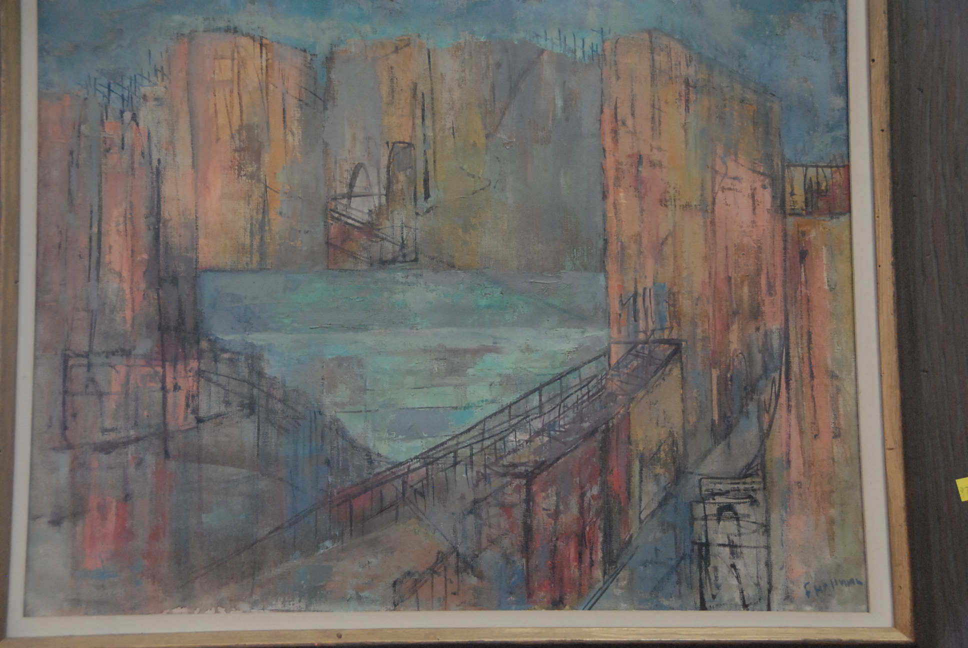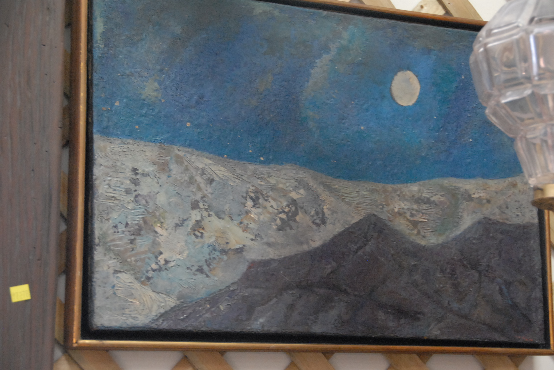 Lot 128: Three E. Hellman oil on canvas paintings, Moonlight Sky 17 x 26, landscape 16 x 26, city scape 20 x 21, two are signed lower r…