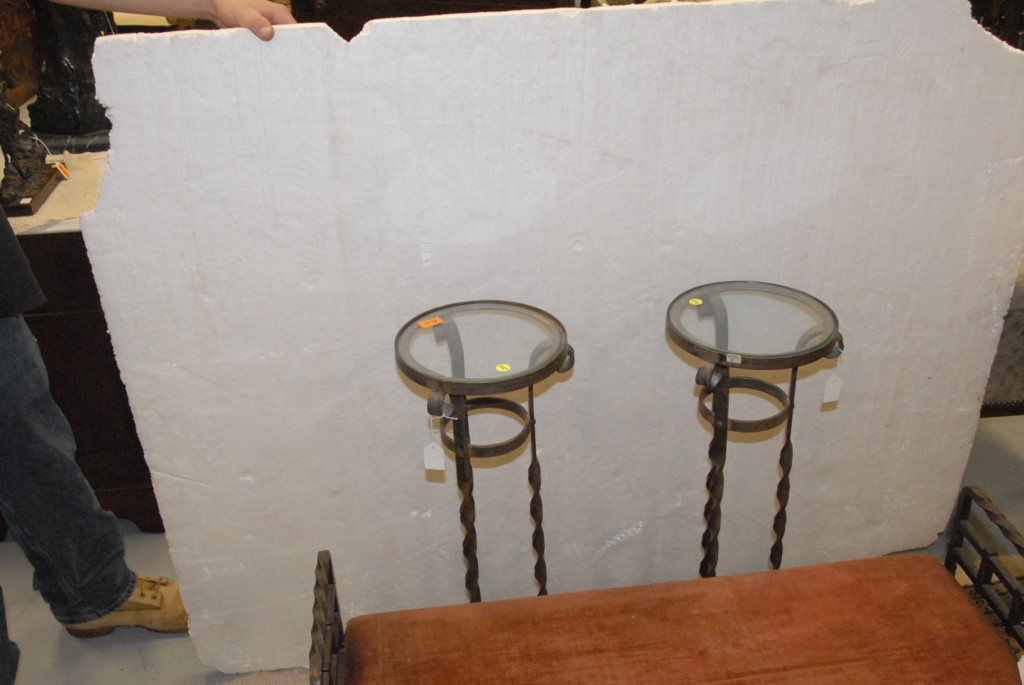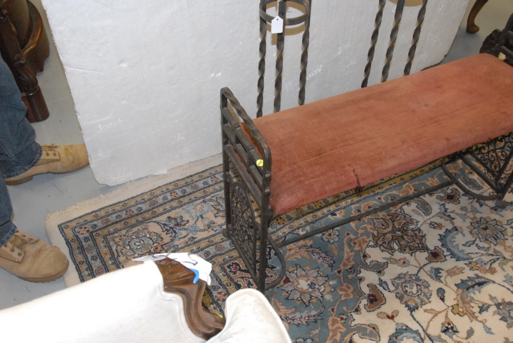 Three piece iron lot iron bench and 2 tall glass top fern stands.