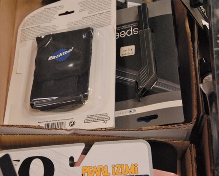 Lot 128: Two box lots of bike gear to include Shimano PD R540, Top Peak pumps, thermal gear tools, oil, etc., approximate retail price 300.00