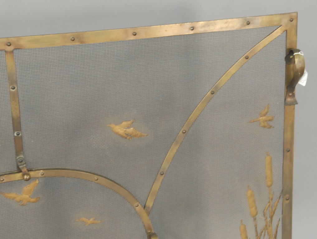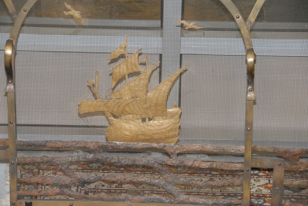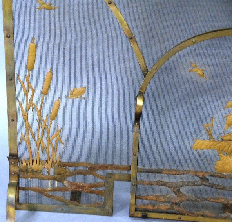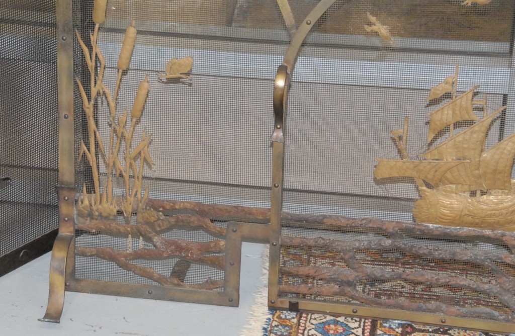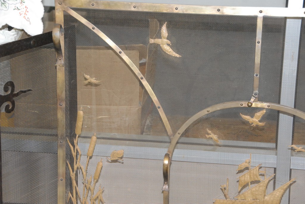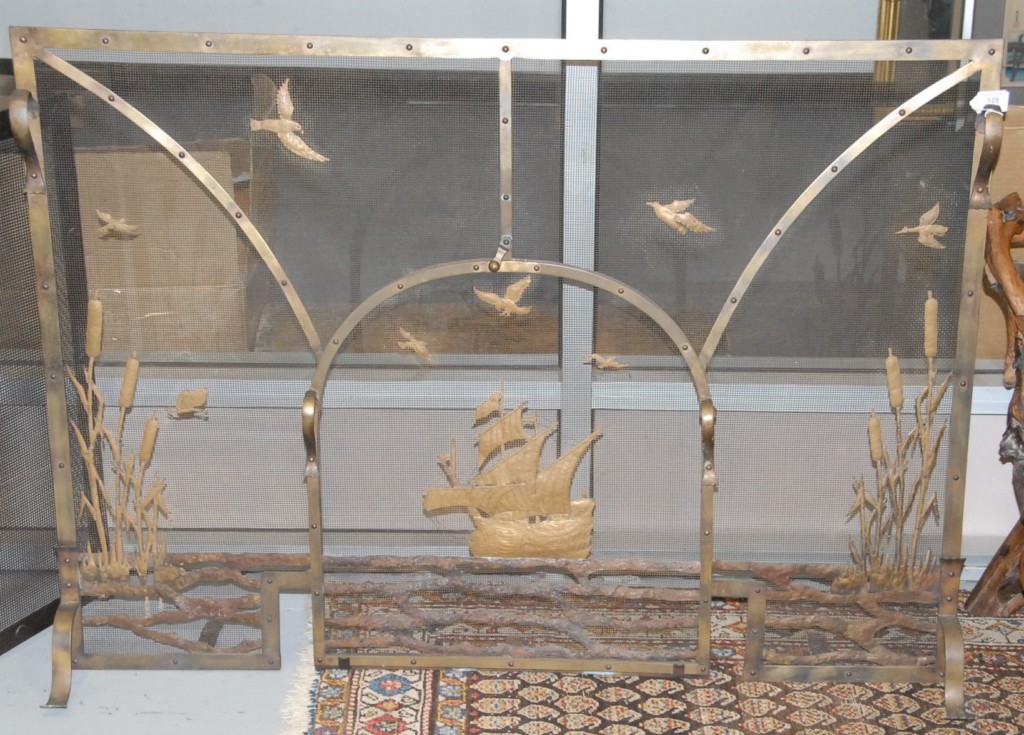 Two part fire screen with sailboat and cattails with removable mid section in manner of Samuel Yellin. height 36in. width 50in.