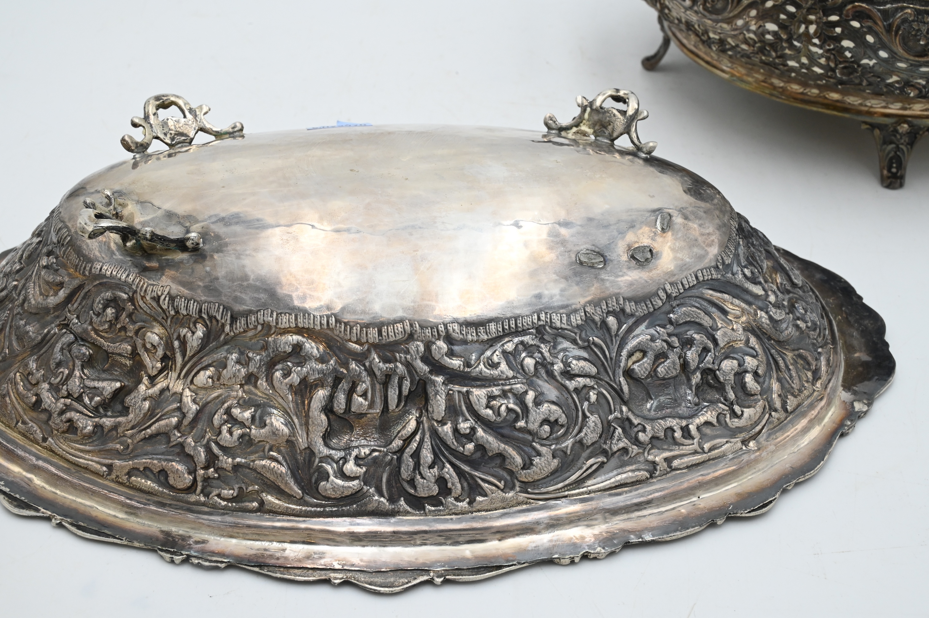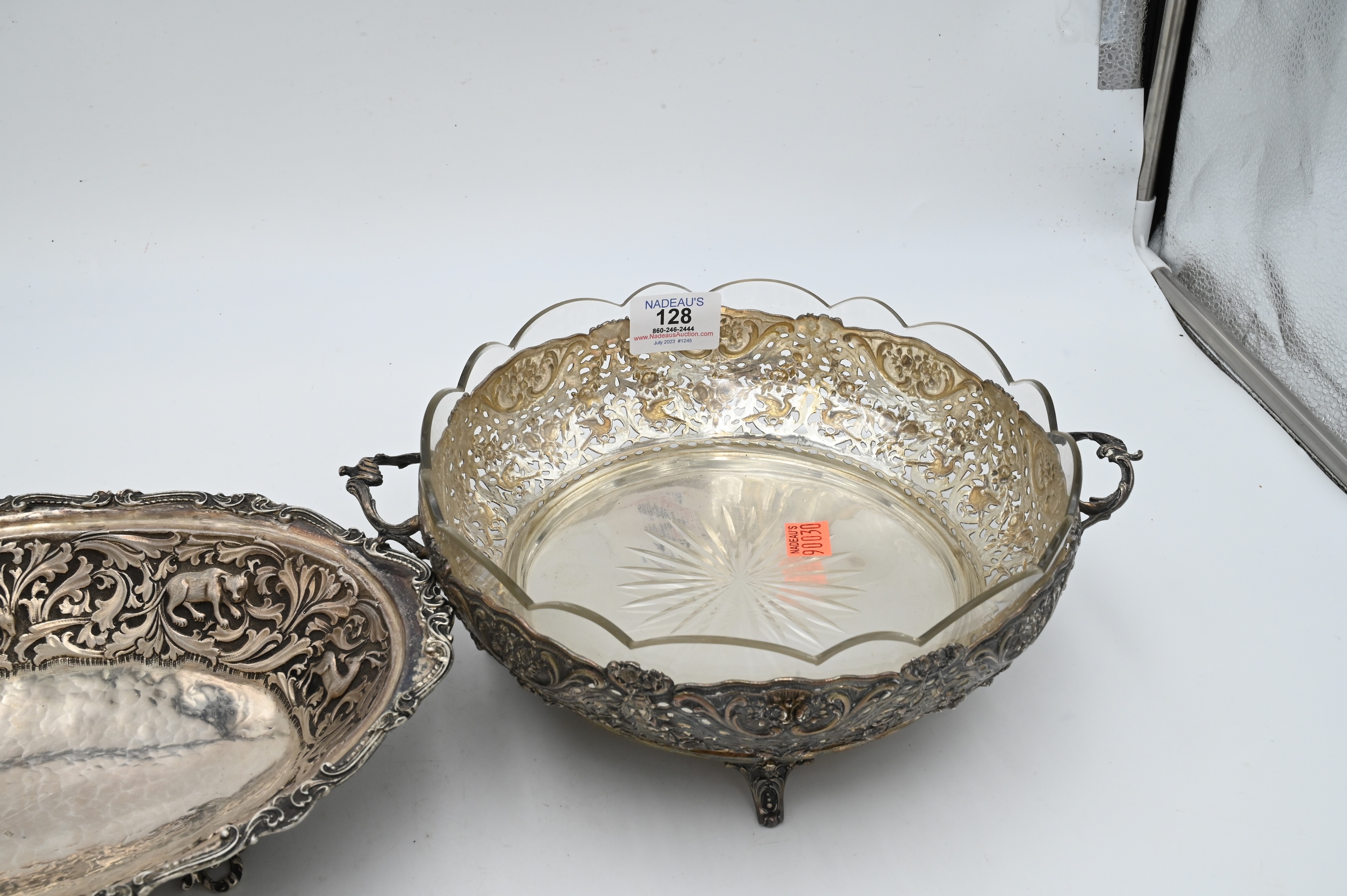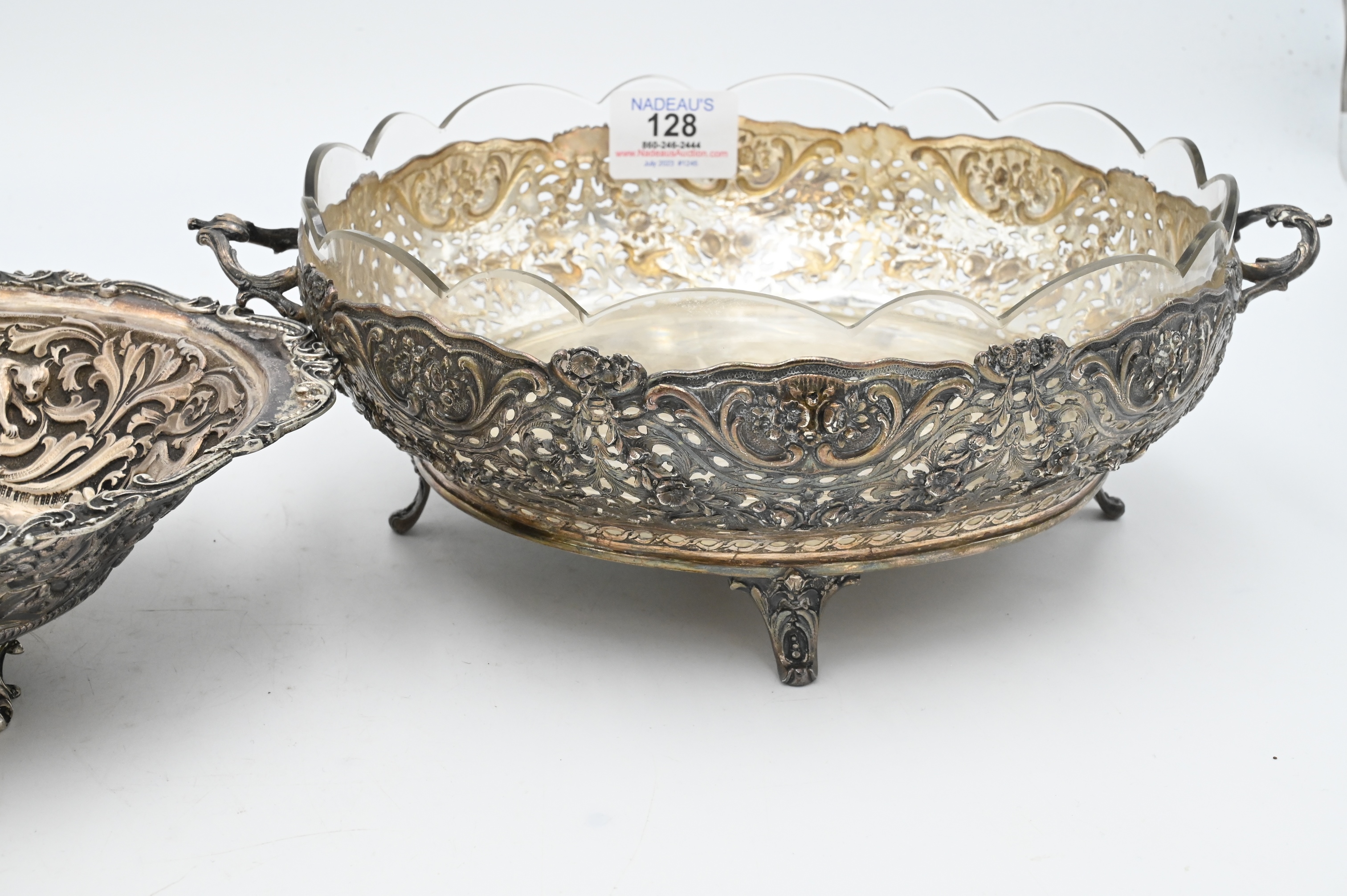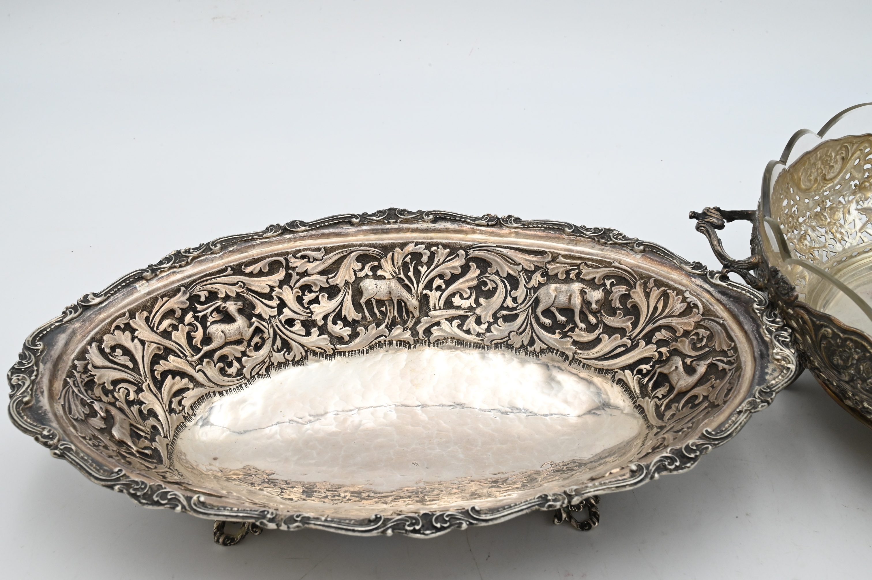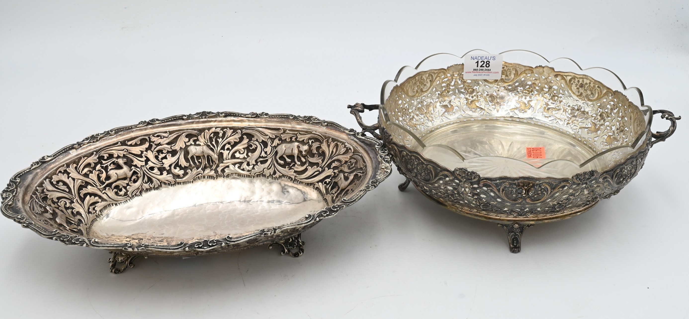 Two Piece Sterling Silver Group, to include animal themed oval bowl (one leg missing), length 11 1/2 inches; along with a pierced repousse bowl having glass insert, diameter 11 1/2 inches; 31.0 t.oz.