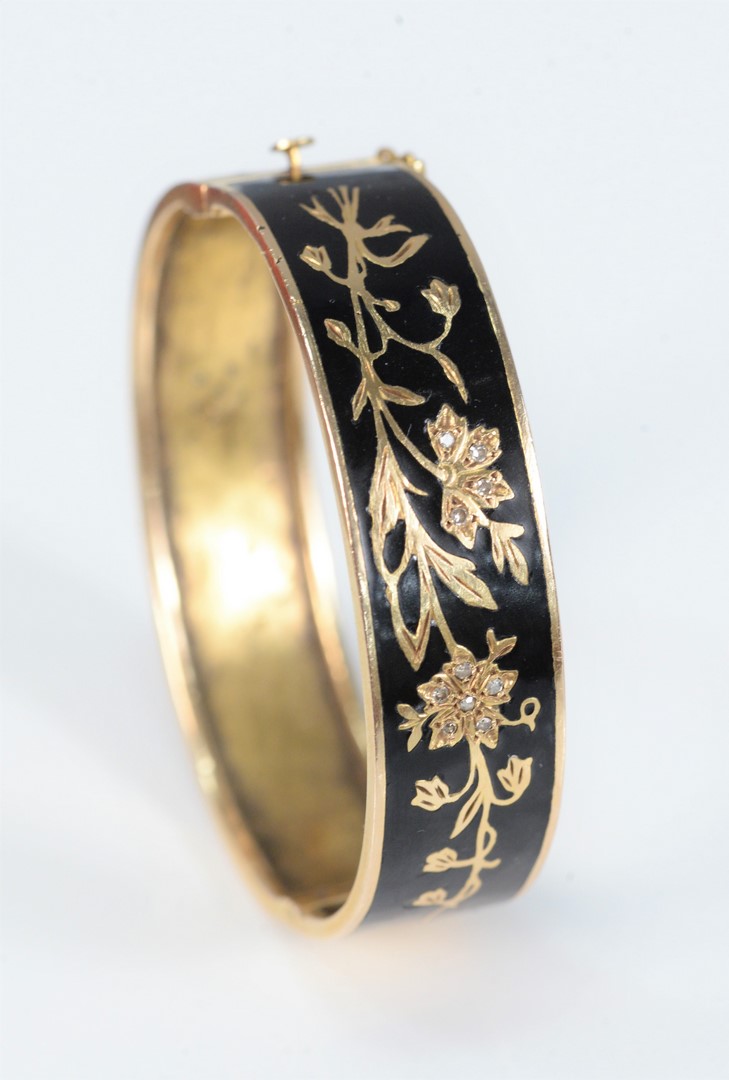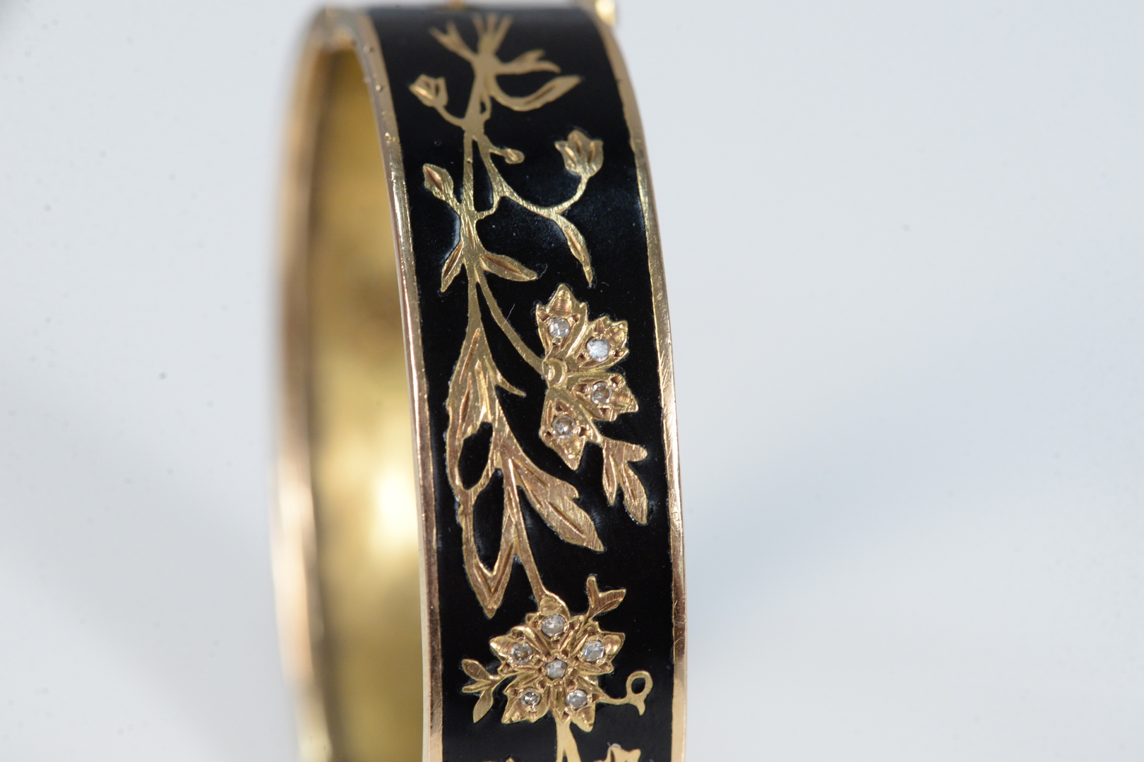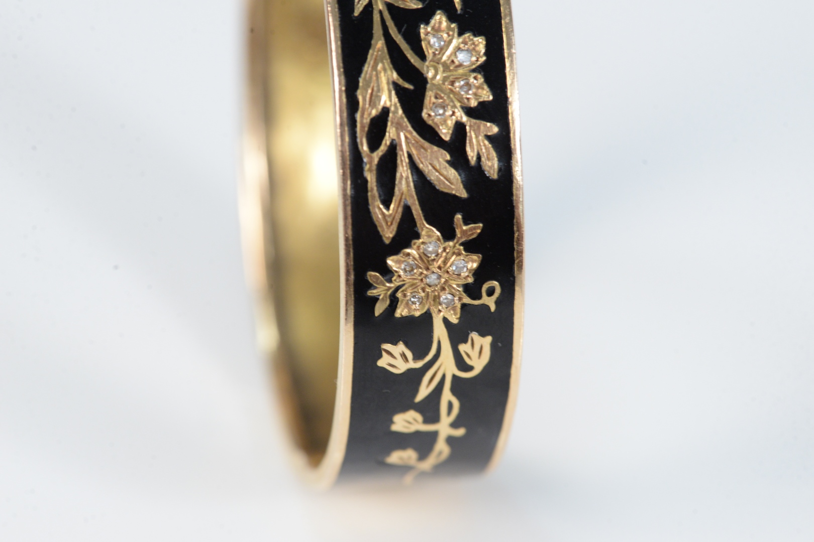 Lot 128: Van Gogh 14 Karat Gold Bangle Bracelet with black enameling, small diamonds and vine of flowers 53.5 millimeters 36.6 grams